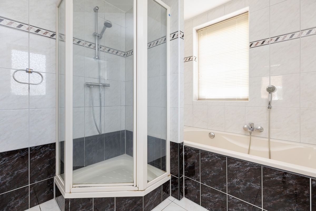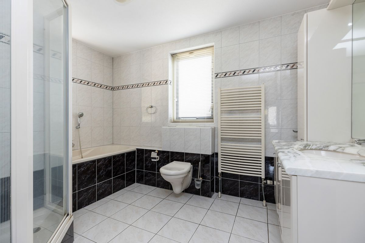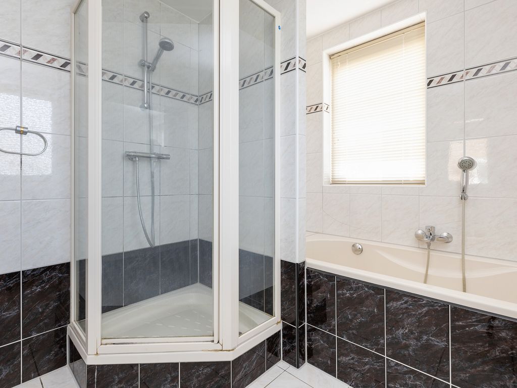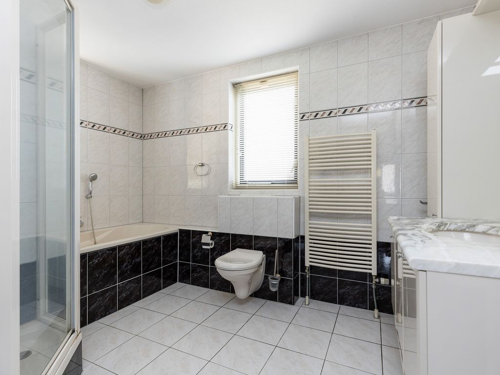 De badkamer (circa 3,48 x 2,40 m) is compleet uitgevoerd en voorzien van een ligbad, douchecabine, wastafelmeubel en toilet.