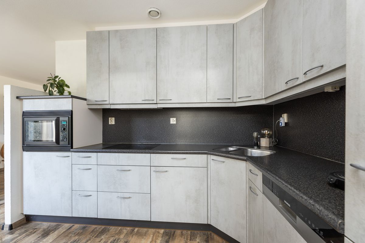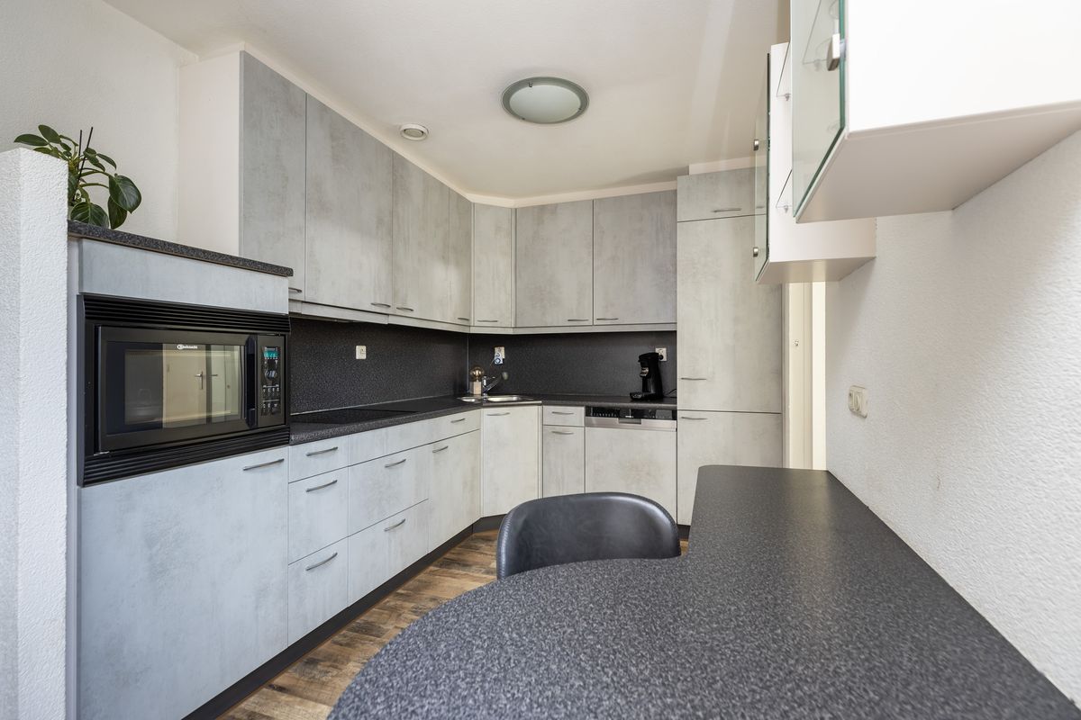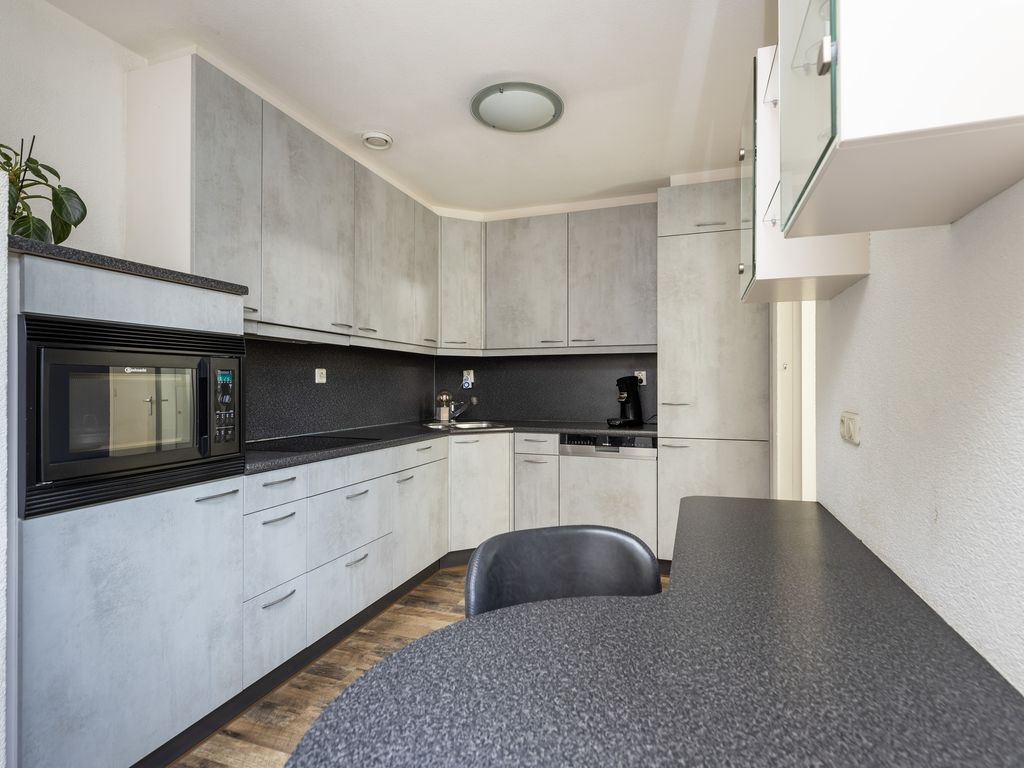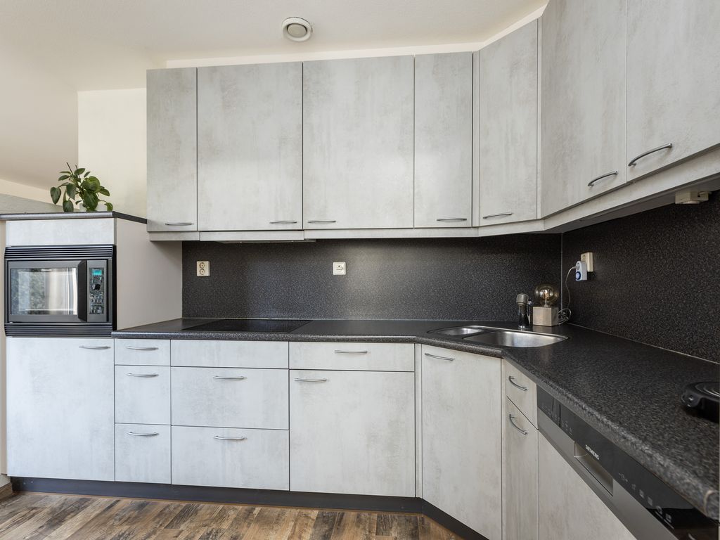 De keuken is uitgevoerd in een hoekopstelling en is voorzien van diverse inbouwapparatuur, waaronder een koel-/vriescombinatie, afzuigkap, combi-magnetron, vaatwasser en keramische kookplaat.