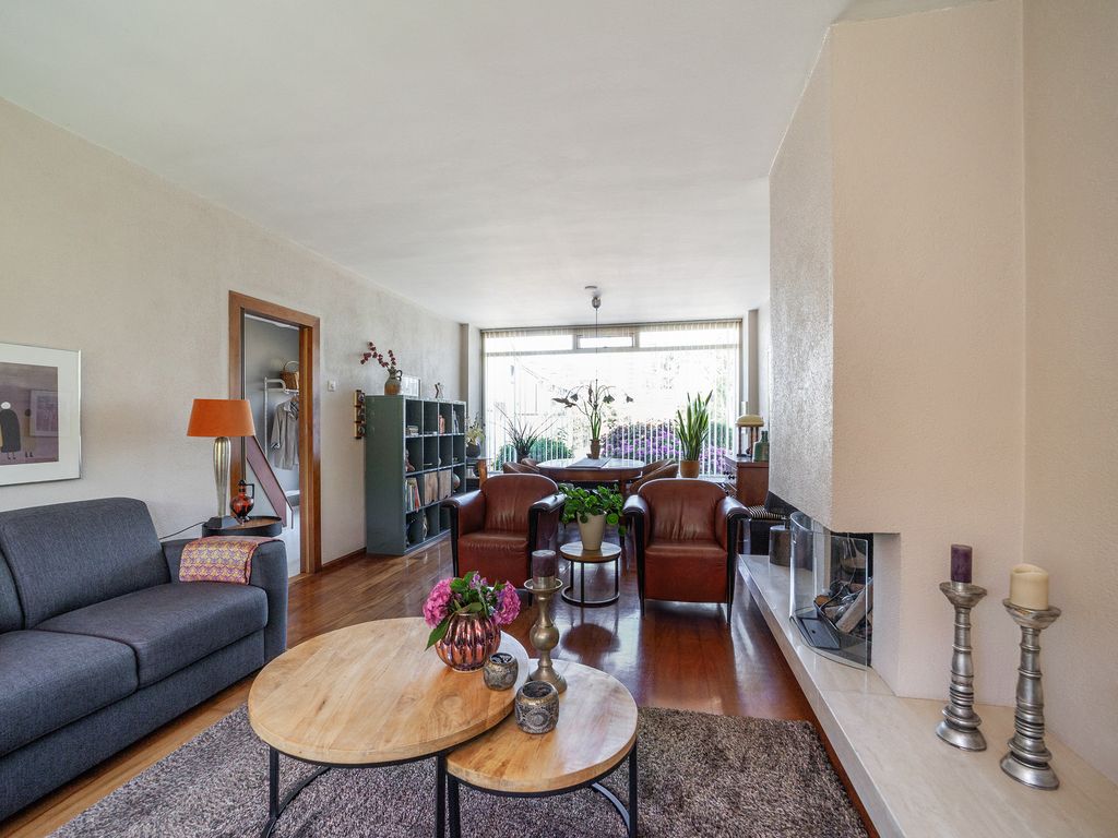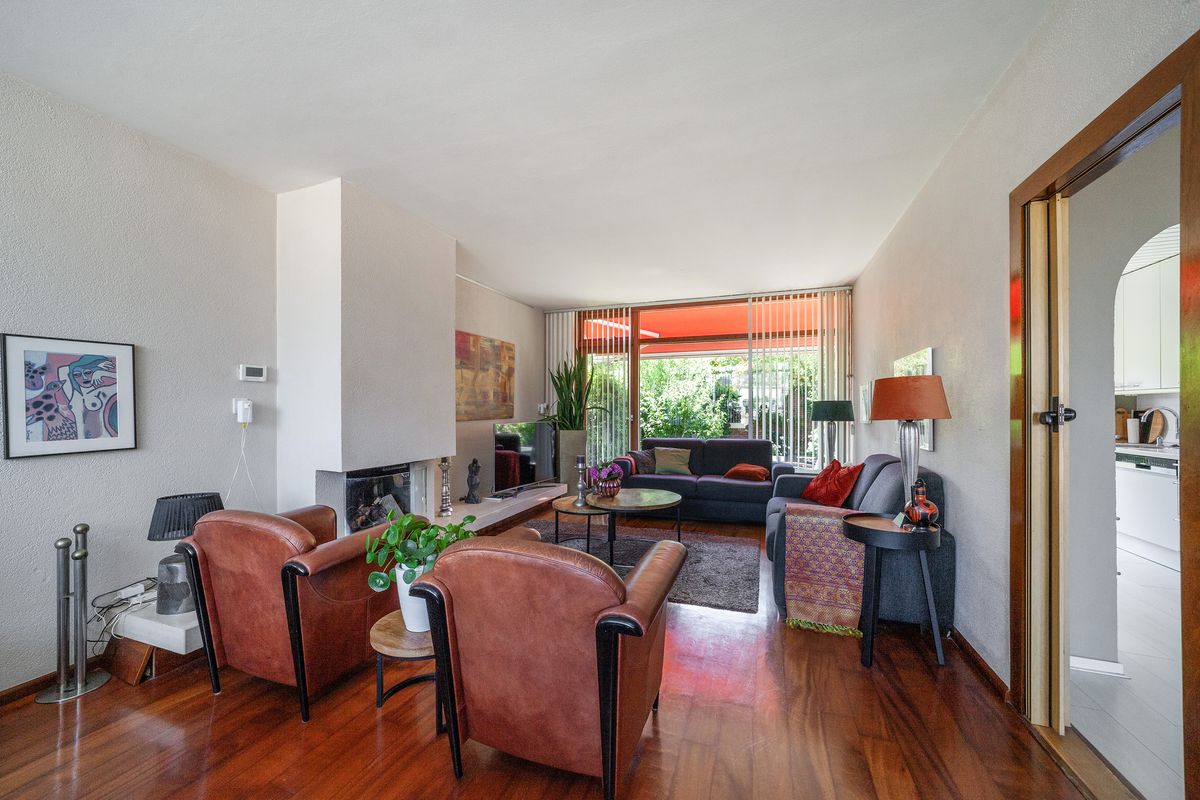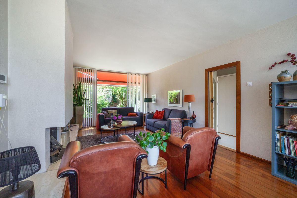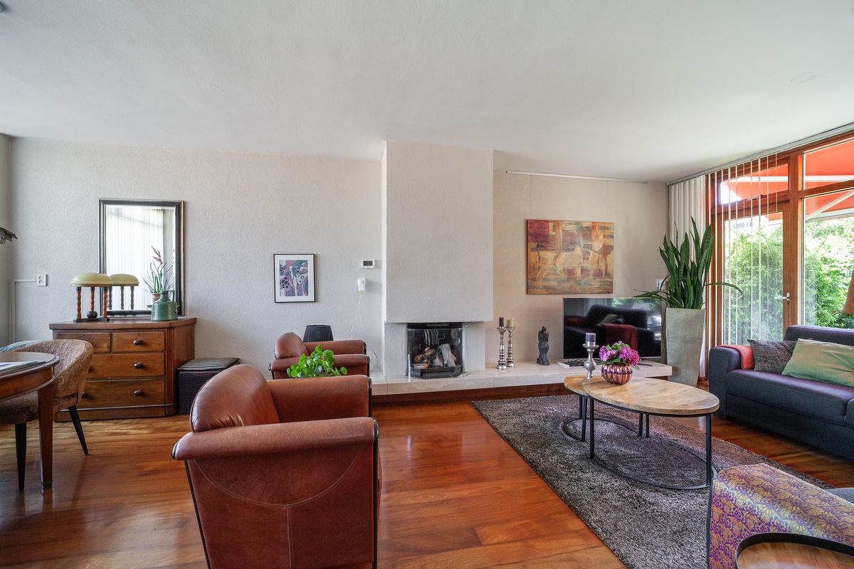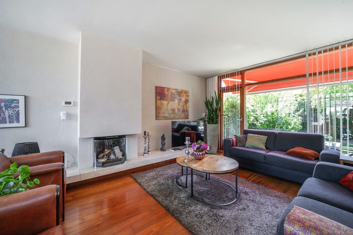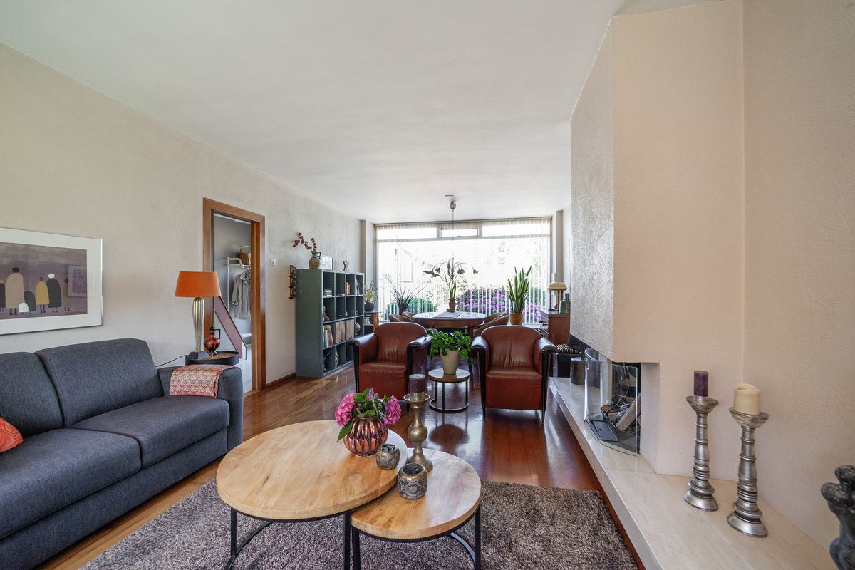 De lichte doorzonwoonkamer van circa 29 m² heeft dankzij de grote raampartijen aan voor- en achterzijde veel natuurlijk lichtinval. De woonkamer is voorzien van een open haard.
