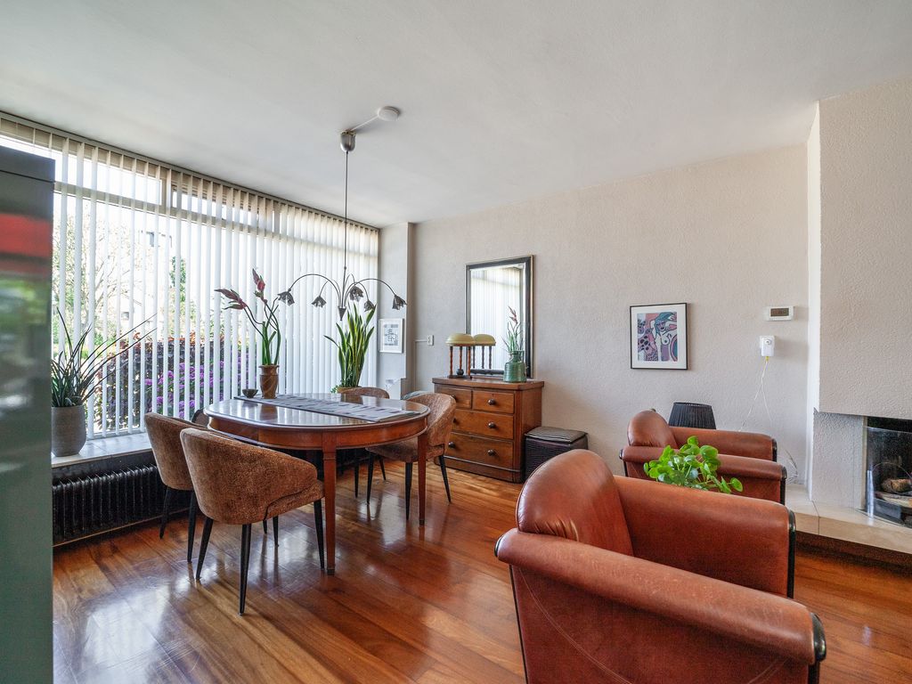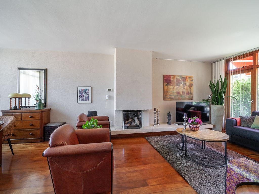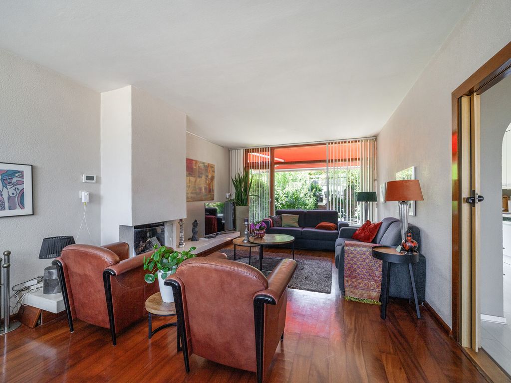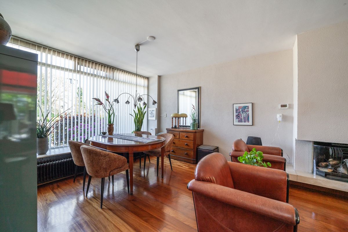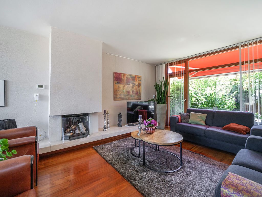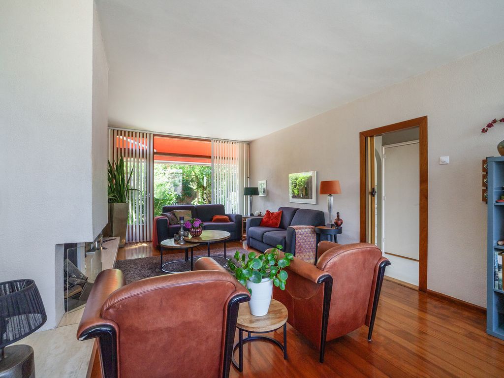De lichte doorzonwoonkamer van circa 29 m² heeft dankzij de grote raampartijen aan voor- en achterzijde veel natuurlijk lichtinval. De woonkamer is voorzien van een open haard.