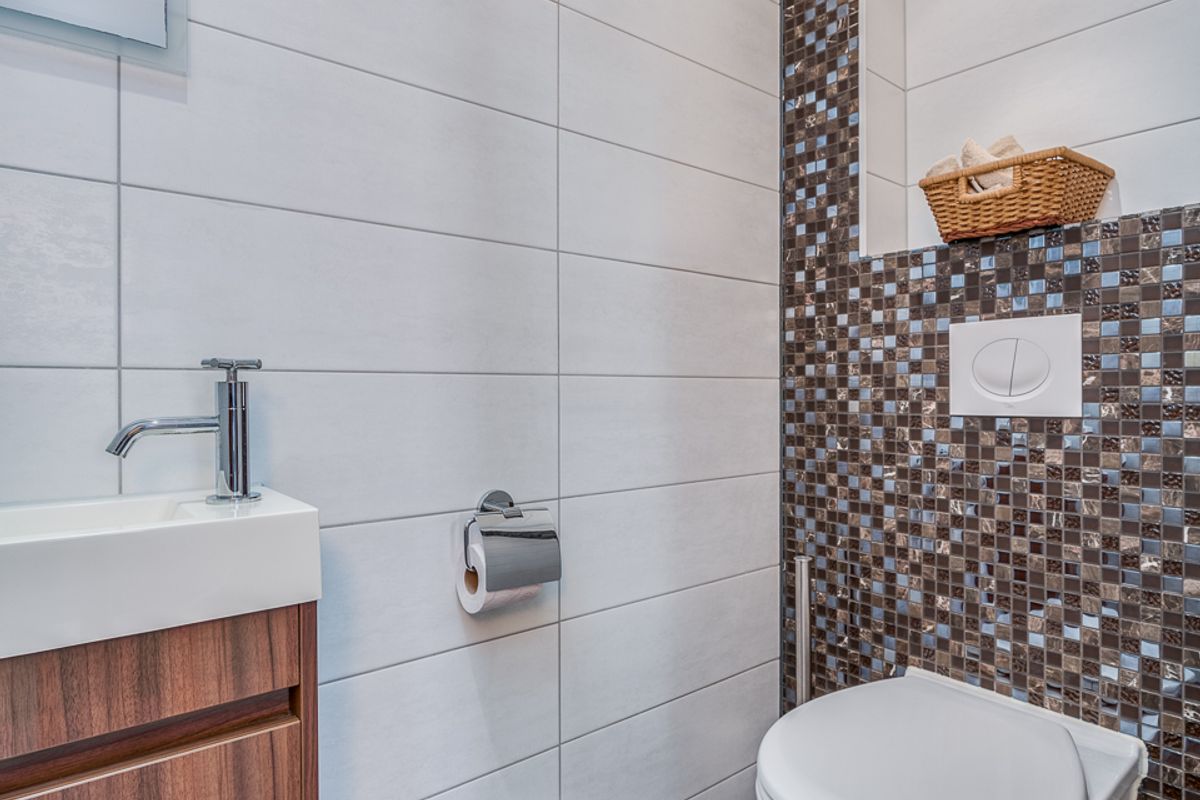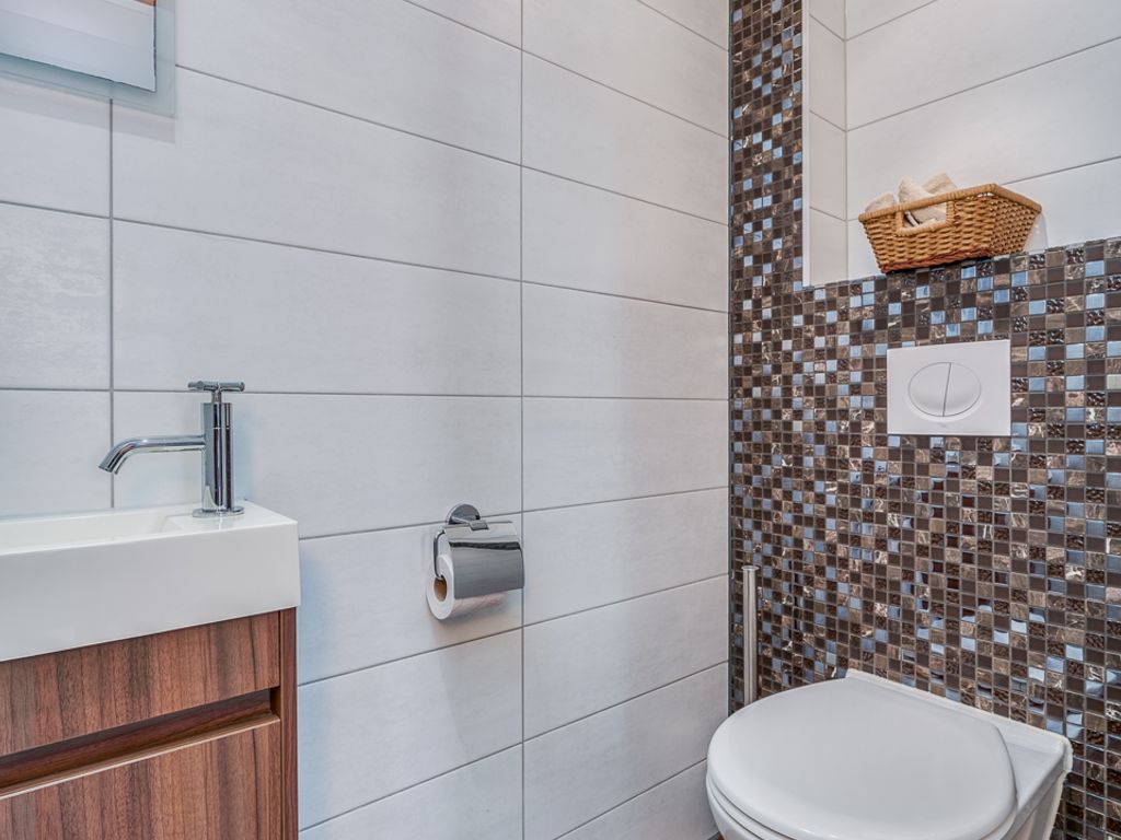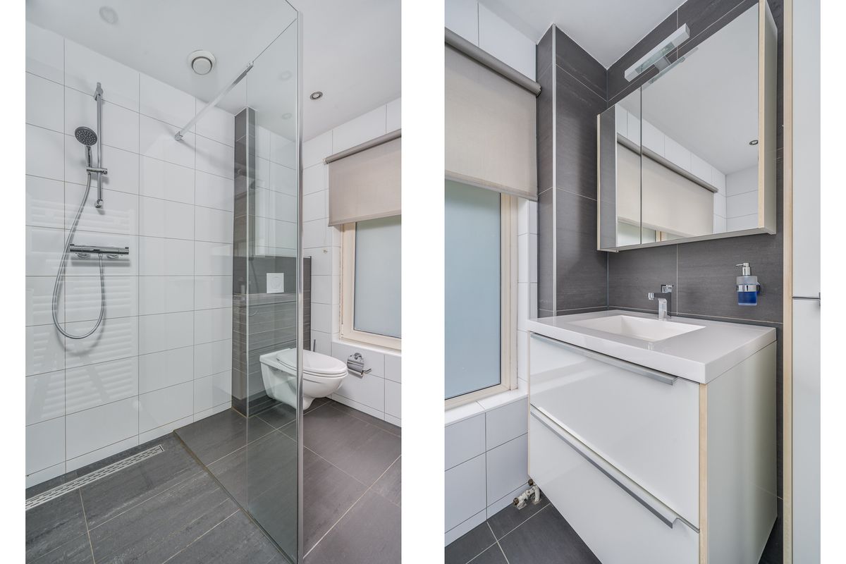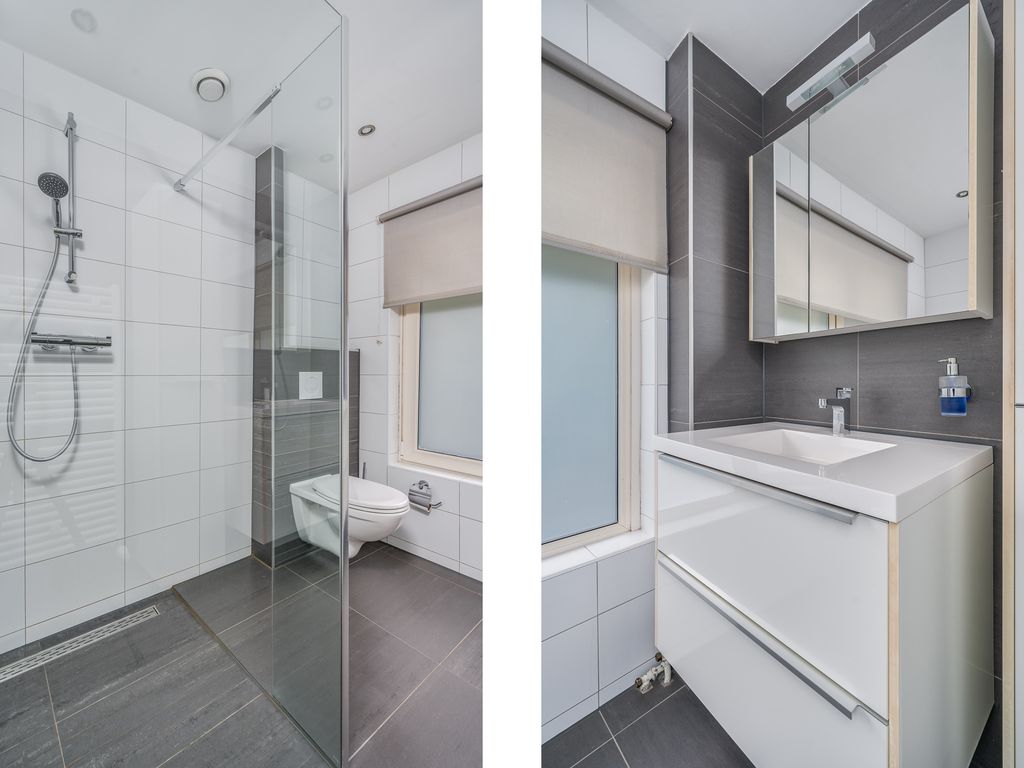De moderne badkamer is gelegen aan de voorzijde van de woning en is voorzien van een inloopdouche, wastafelmeubel, toilet en hor.