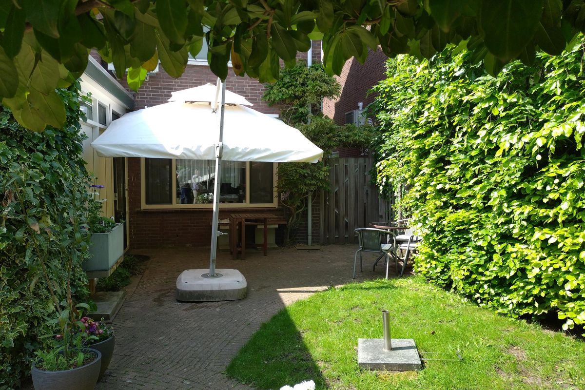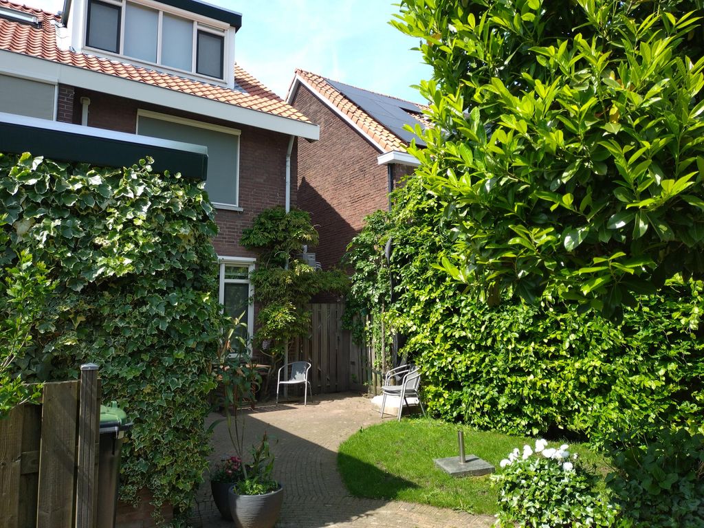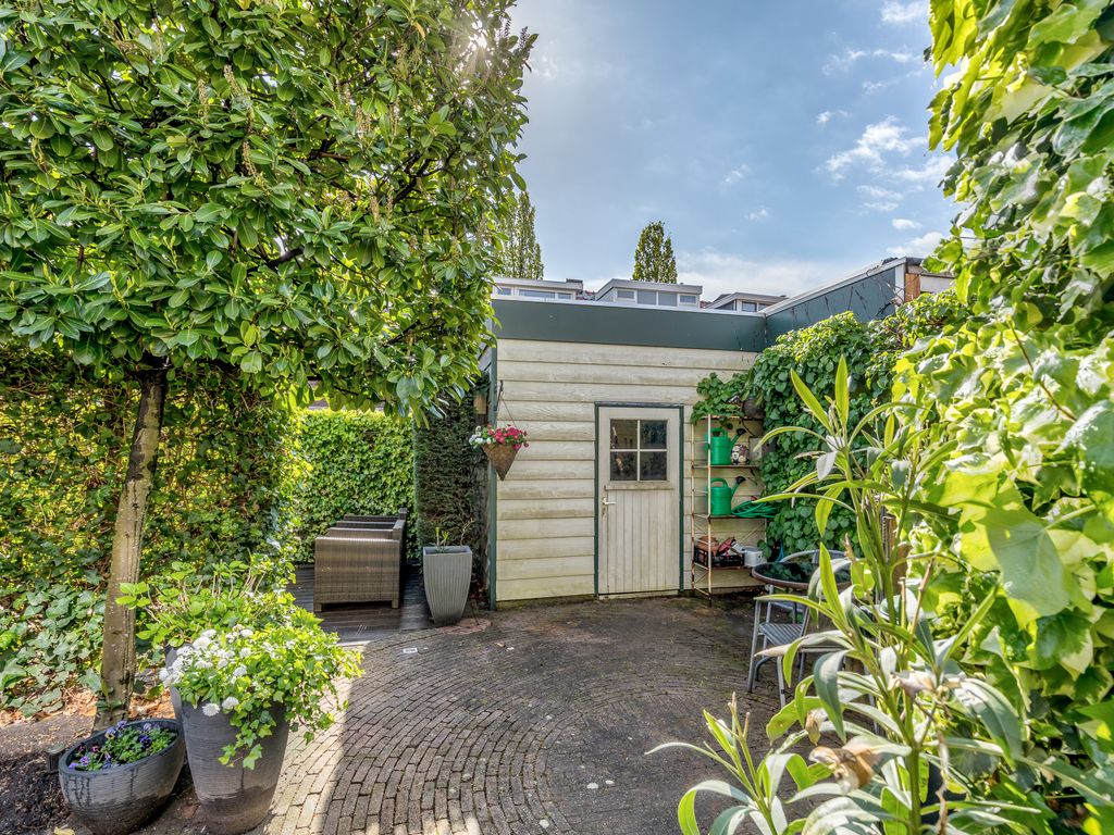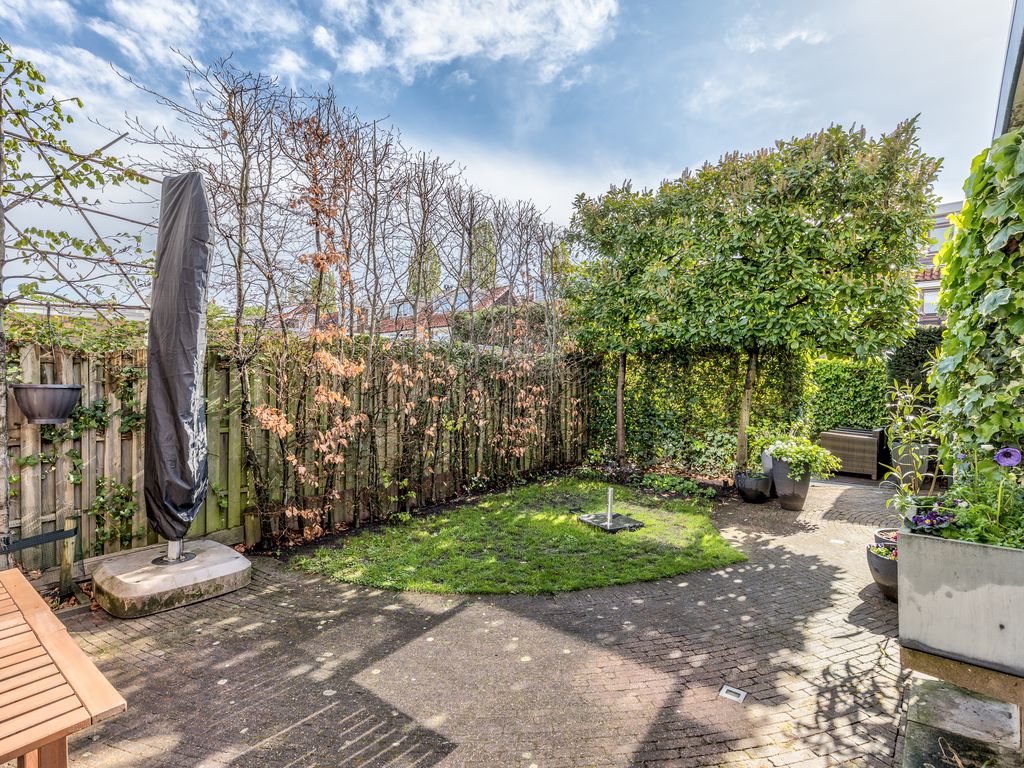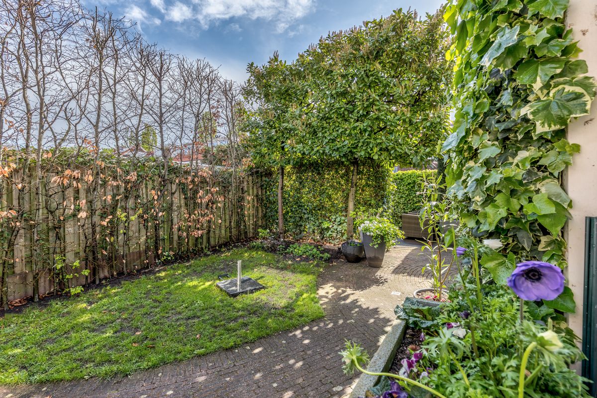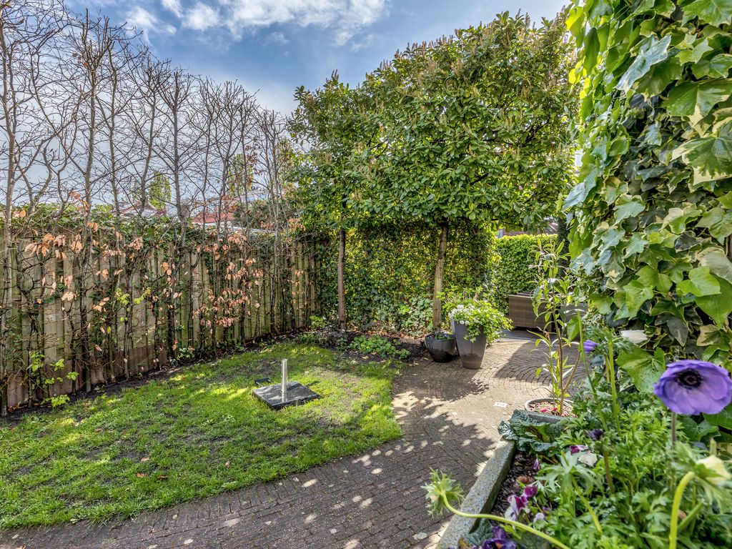 De brede en diepe achtertuin is gelegen op het zuidoosten en maar liefst 13 meter diep en 7 meter breed. Op diverse plekjes kan je in de zon of schaduw ontspannen genieten van een kopje koffie of een zomerse barbecue. De tuin beschikt rondom over sierbestrating, fruitbomen en -struiken en de beplanting geeft veel privacy. De tuin is desondanks onderhoudsvriendelijk en blijft vrijwel het jaar rond groen. In de avond en nacht worden de bomen in de voor- en achtertuin sfeervol verlicht en blijft de tuin ook in de donkere uren een verlengstuk van de huiskamer.