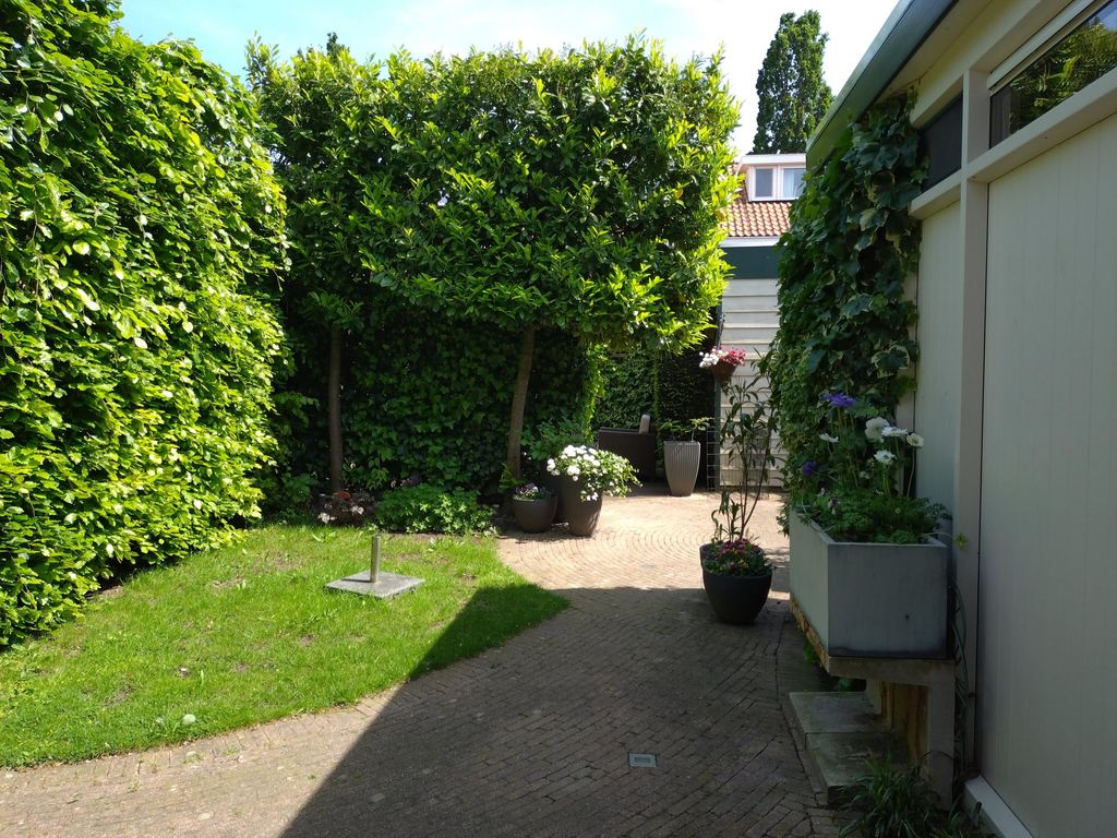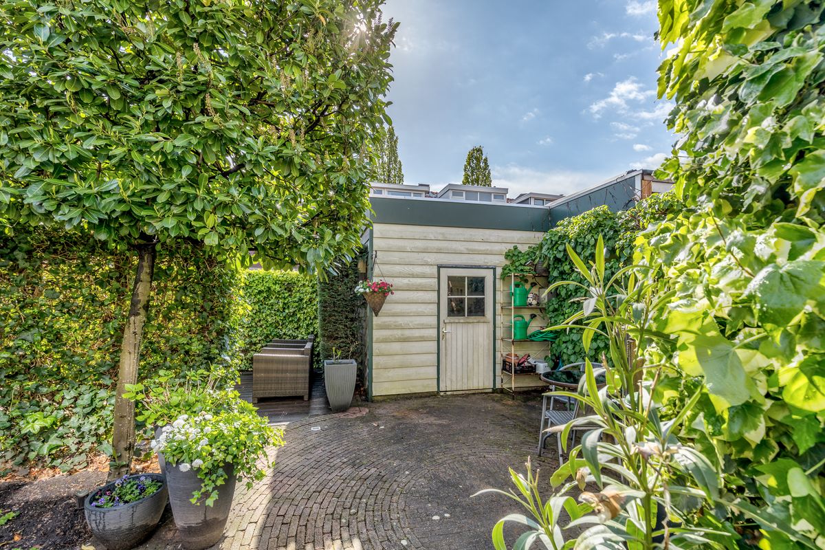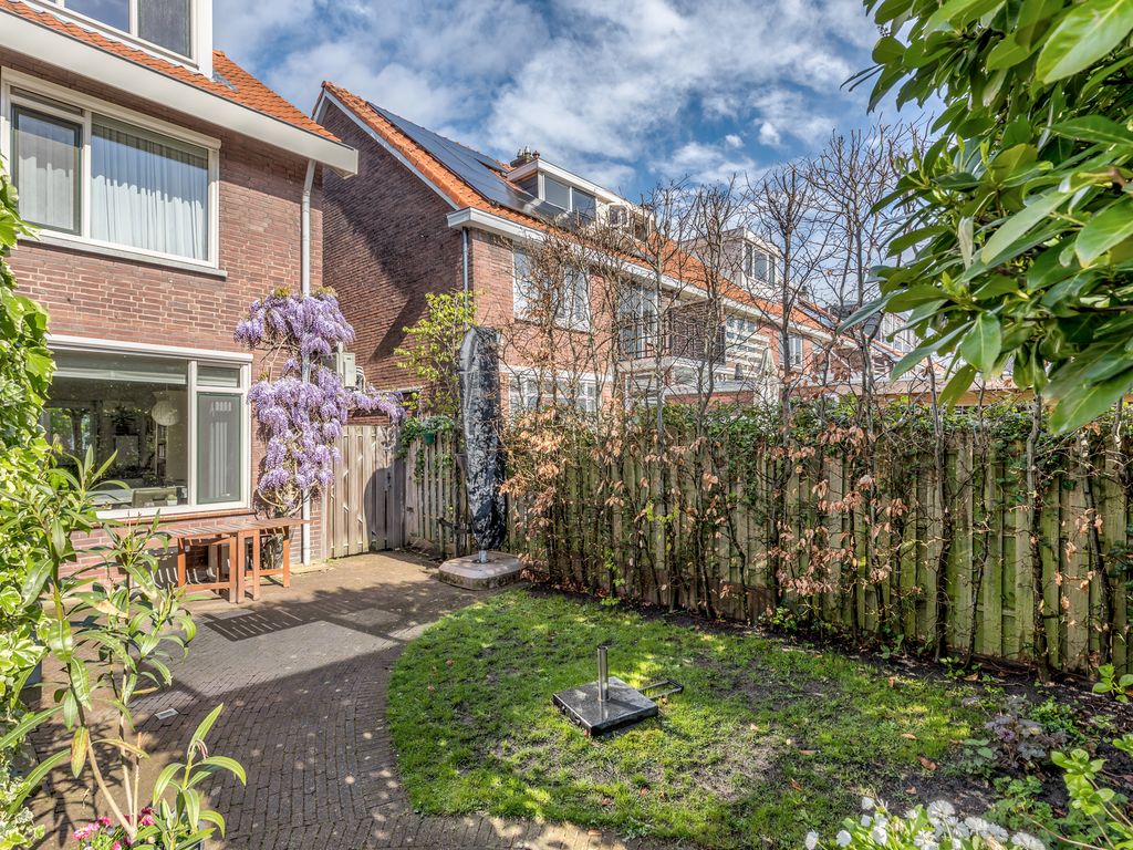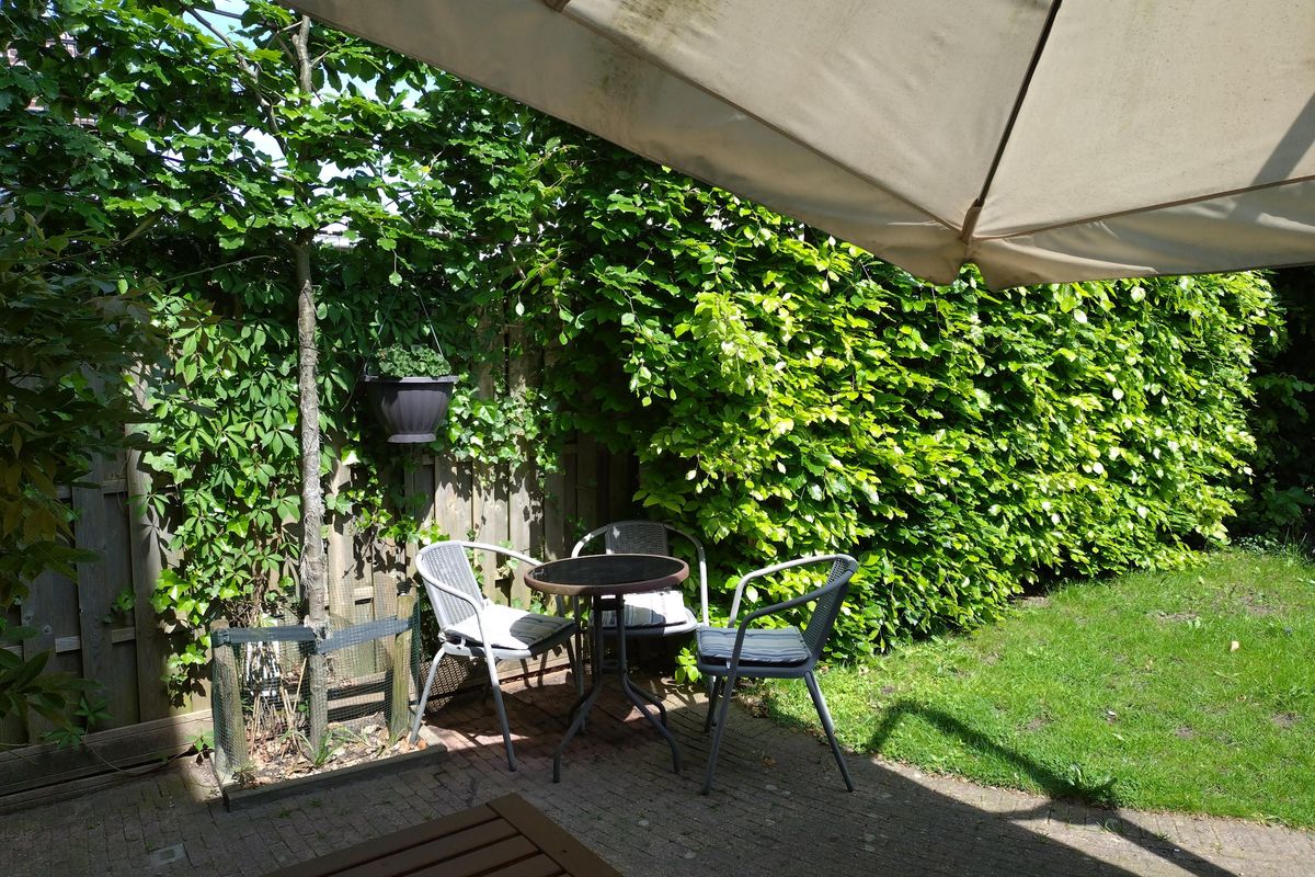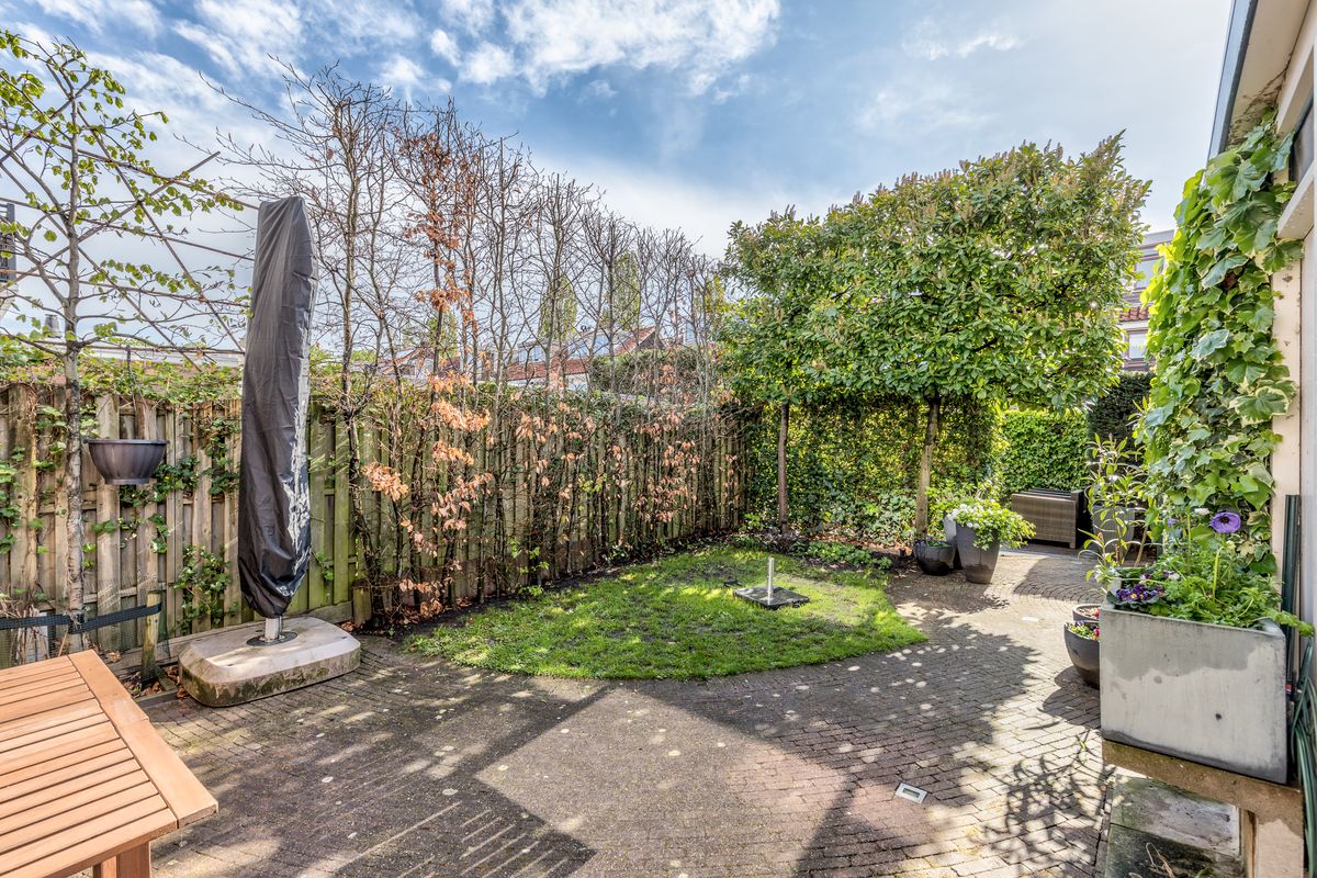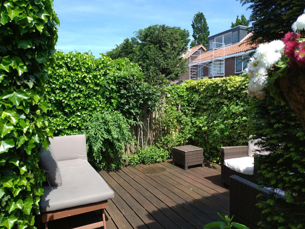 De brede en diepe achtertuin is gelegen op het zuidoosten en maar liefst 13 meter diep en 7 meter breed. Op diverse plekjes kan je in de zon of schaduw ontspannen genieten van een kopje koffie of een zomerse barbecue. De tuin beschikt rondom over sierbestrating, fruitbomen en -struiken en de beplanting geeft veel privacy. De tuin is desondanks onderhoudsvriendelijk en blijft vrijwel het jaar rond groen. In de avond en nacht worden de bomen in de voor- en achtertuin sfeervol verlicht en blijft de tuin ook in de donkere uren een verlengstuk van de huiskamer.