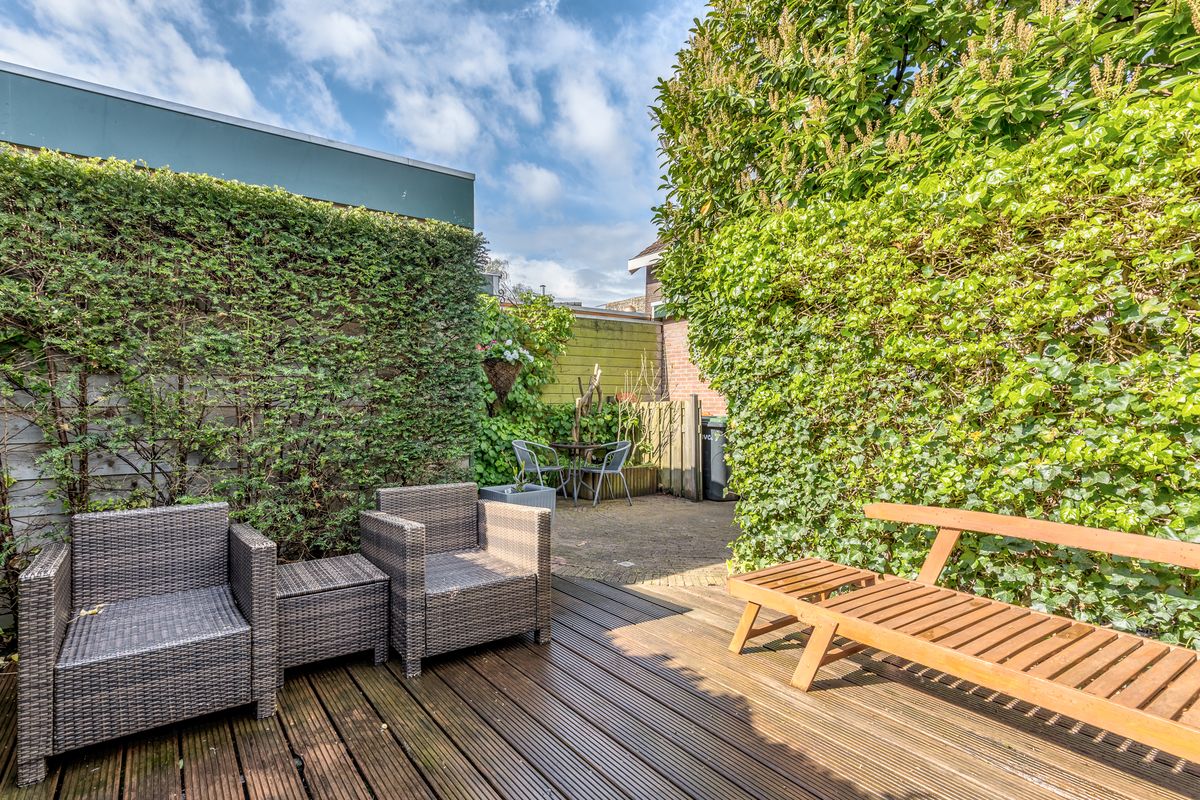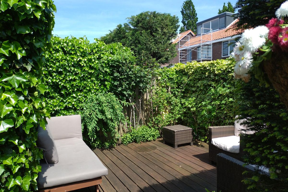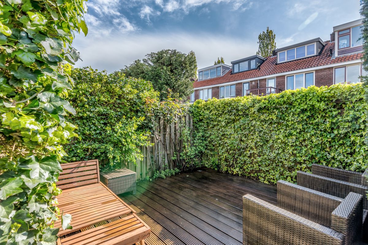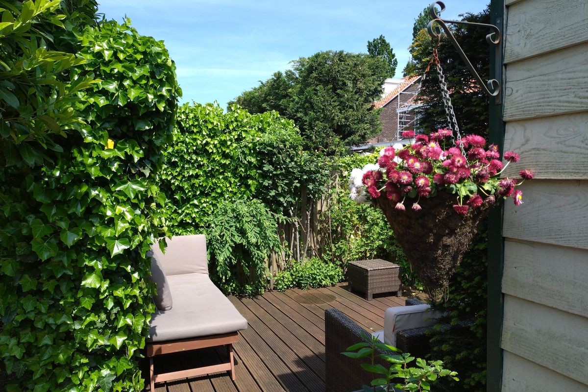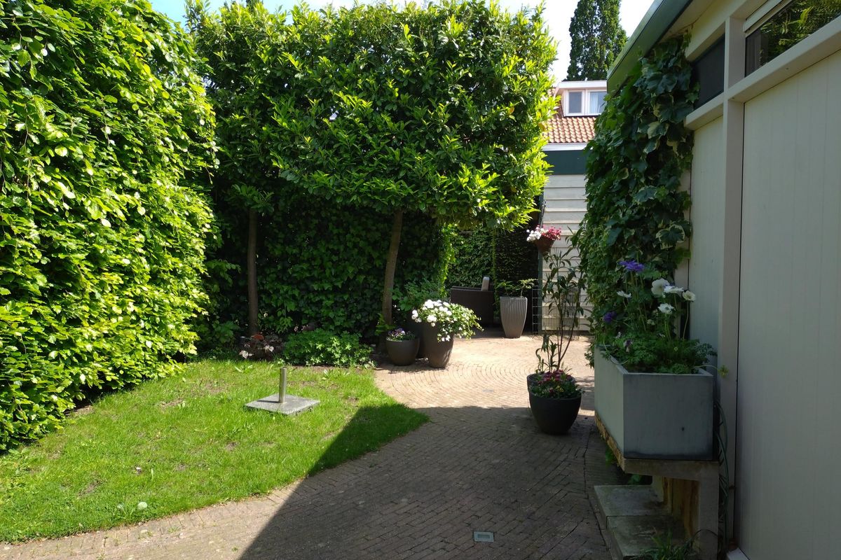 De brede en diepe achtertuin is gelegen op het zuidoosten en maar liefst 13 meter diep en 7 meter breed. Op diverse plekjes kan je in de zon of schaduw ontspannen genieten van een kopje koffie of een zomerse barbecue. De tuin beschikt rondom over sierbestrating, fruitbomen en -struiken en de beplanting geeft veel privacy. De tuin is desondanks onderhoudsvriendelijk en blijft vrijwel het jaar rond groen. In de avond en nacht worden de bomen in de voor- en achtertuin sfeervol verlicht en blijft de tuin ook in de donkere uren een verlengstuk van de huiskamer.