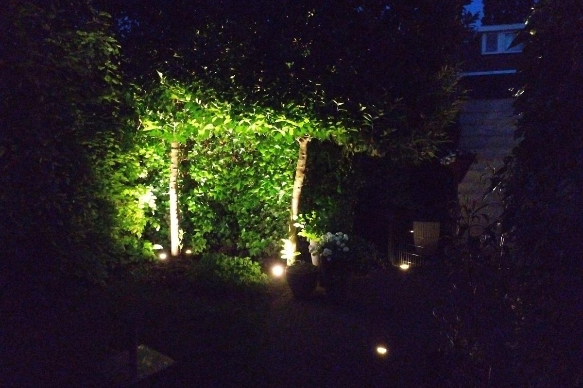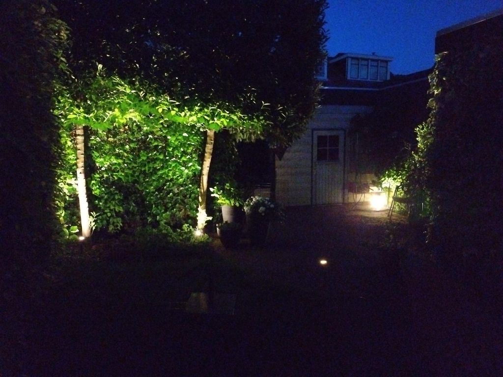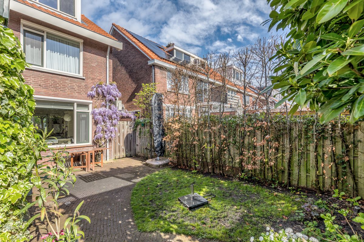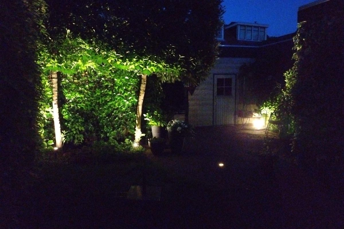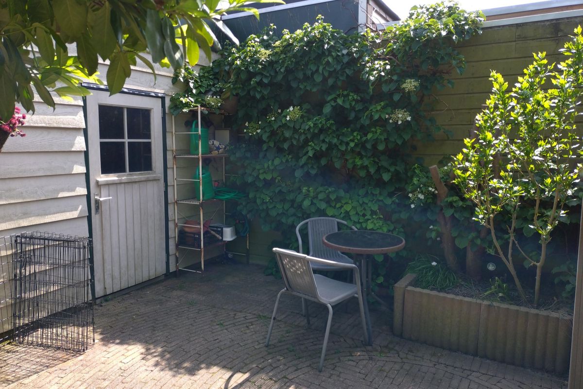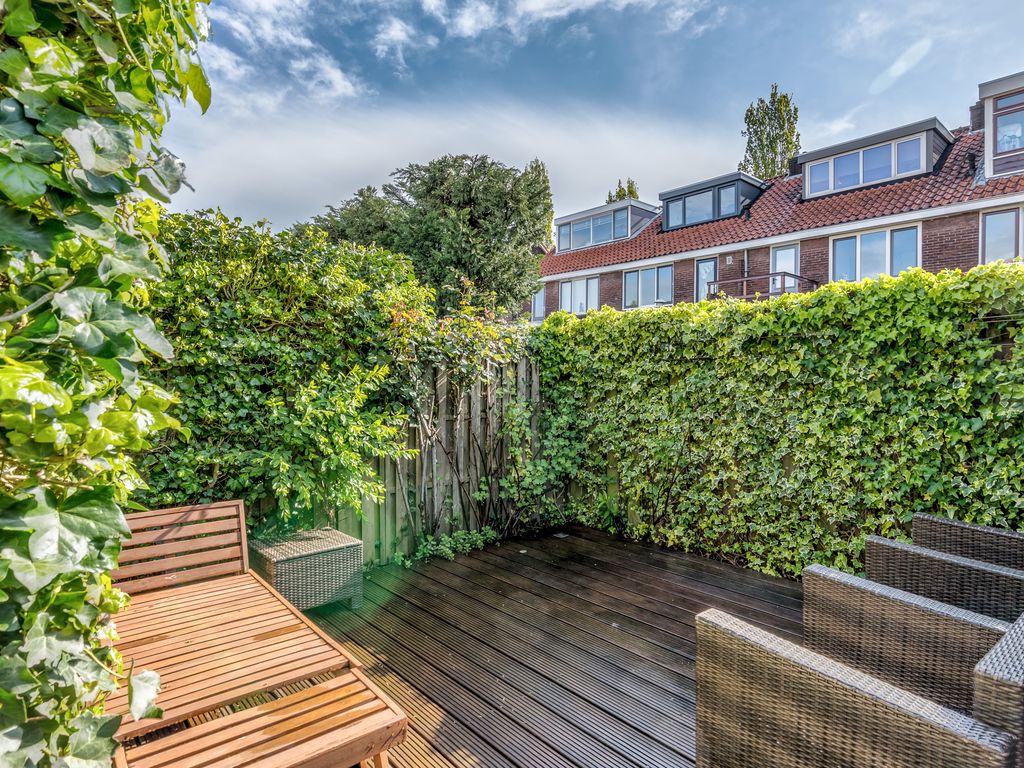 De brede en diepe achtertuin is gelegen op het zuidoosten en maar liefst 13 meter diep en 7 meter breed. Op diverse plekjes kan je in de zon of schaduw ontspannen genieten van een kopje koffie of een zomerse barbecue. De tuin beschikt rondom over sierbestrating, fruitbomen en -struiken en de beplanting geeft veel privacy. De tuin is desondanks onderhoudsvriendelijk en blijft vrijwel het jaar rond groen. In de avond en nacht worden de bomen in de voor- en achtertuin sfeervol verlicht en blijft de tuin ook in de donkere uren een verlengstuk van de huiskamer.