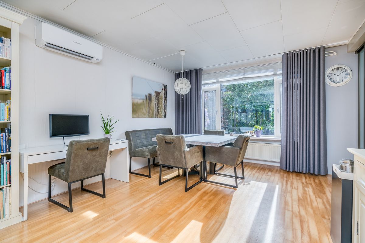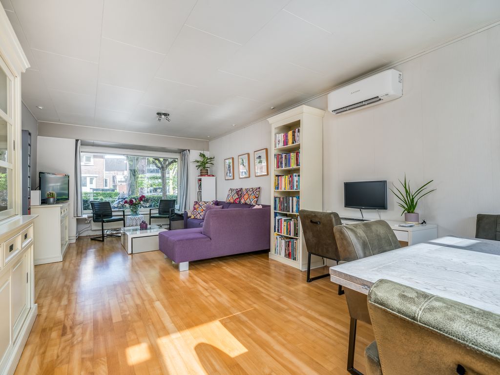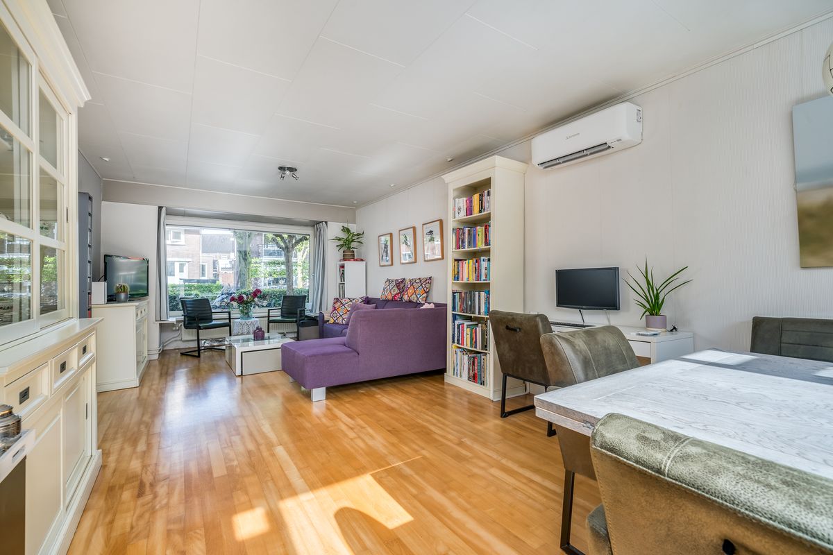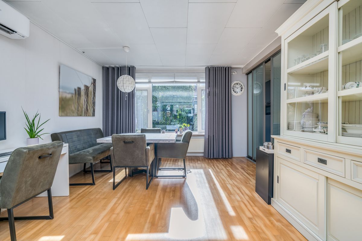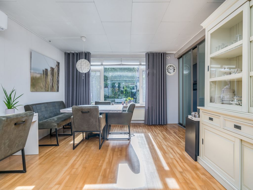 De royale doorzon woonkamer met erkerraam aan de voorzijde heeft een prettige sfeer dankzij veel natuurlijk lichtinval. De keuken is gelegen aan de achterzijde van de woning en is middels glazen schuifdeuren af te sluiten van de woonkamer. Dit zorgt voor een rustig beeld en een ruimtelijk gevoel. De temperatuur wordt gecontroleerd door de airco en alle ramen zijn voorzien van zonneschermen en horren.