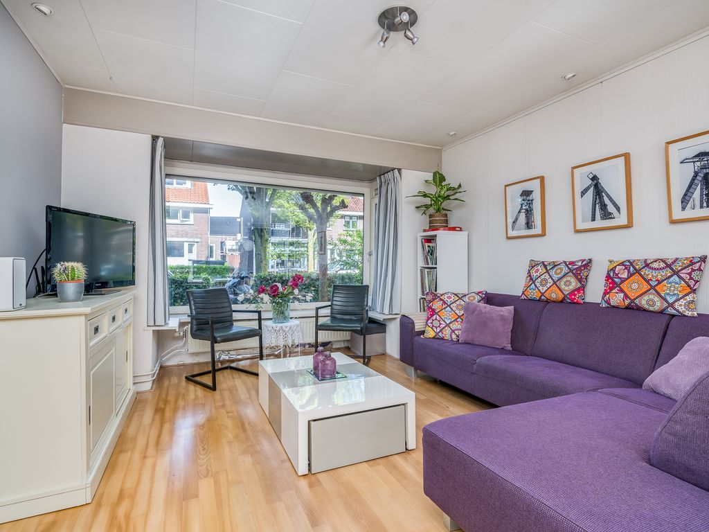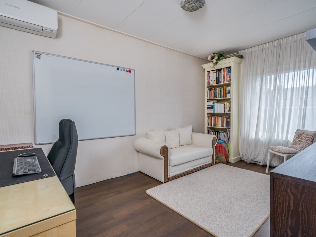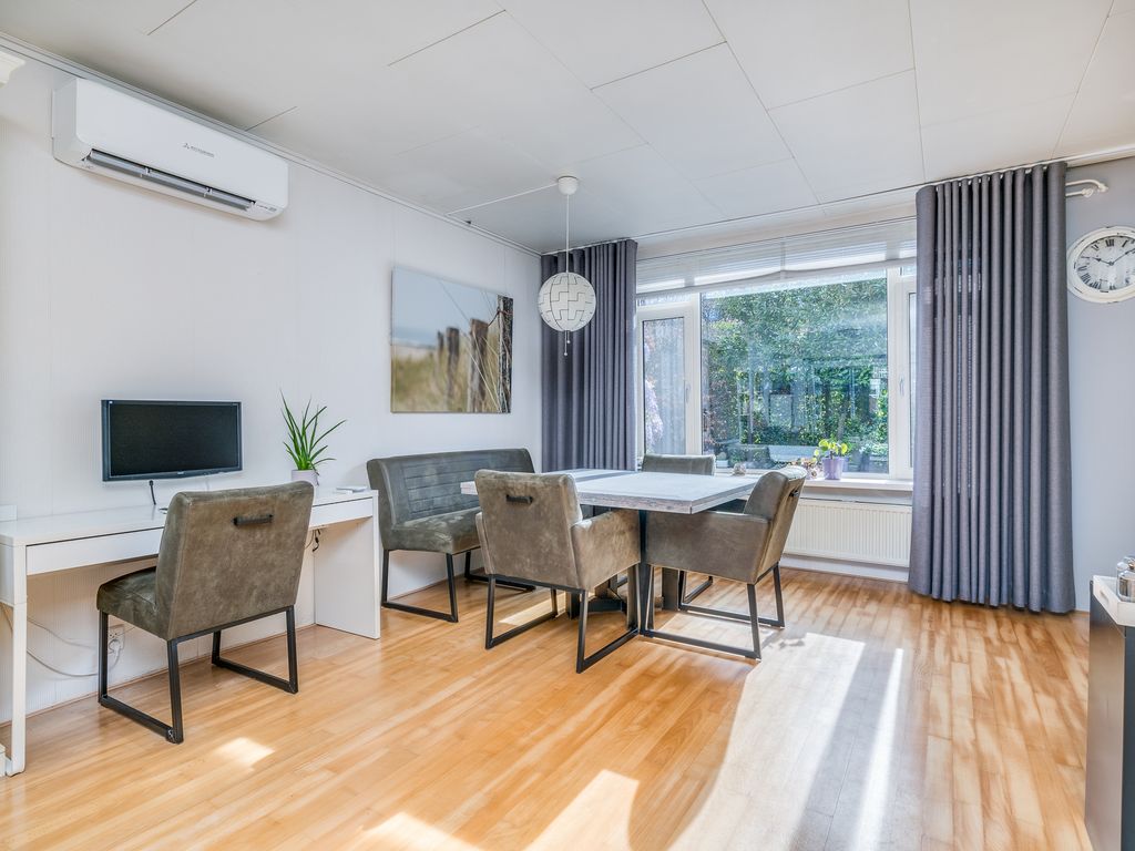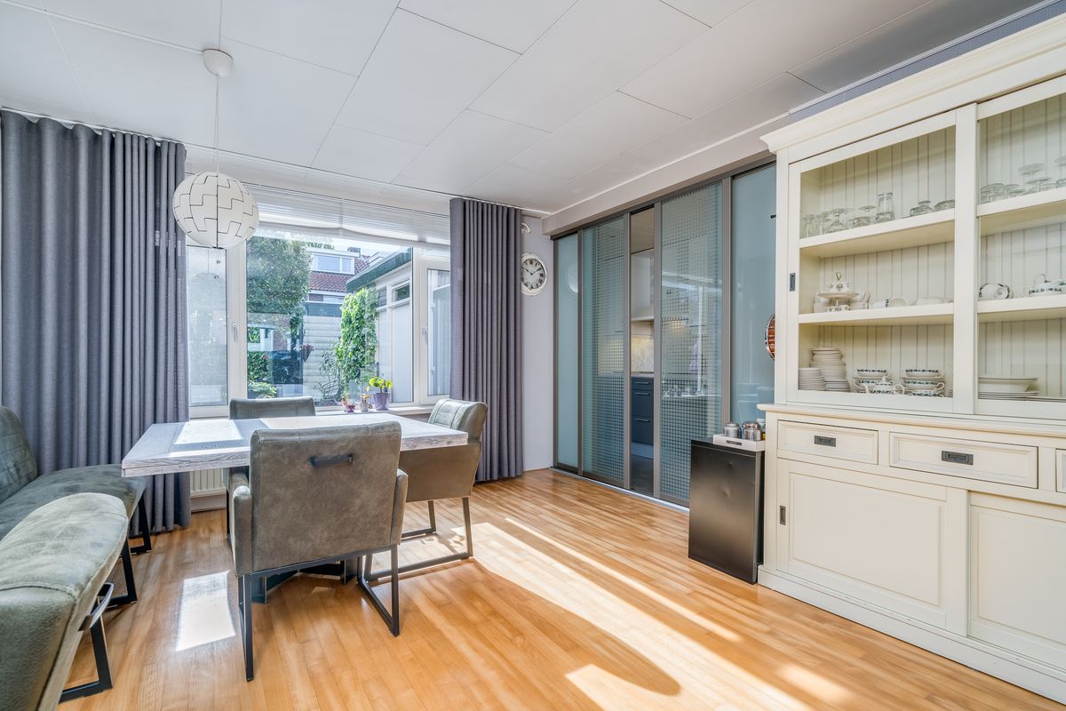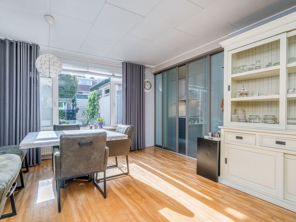 De royale doorzon woonkamer met erkerraam aan de voorzijde heeft een prettige sfeer dankzij veel natuurlijk lichtinval. De keuken is gelegen aan de achterzijde van de woning en is middels glazen schuifdeuren af te sluiten van de woonkamer. Dit zorgt voor een rustig beeld en een ruimtelijk gevoel. De temperatuur wordt gecontroleerd door de airco en alle ramen zijn voorzien van zonneschermen en horren.