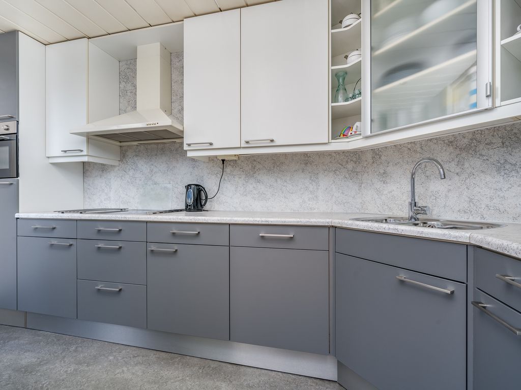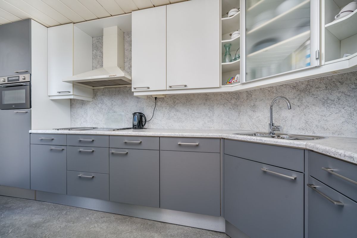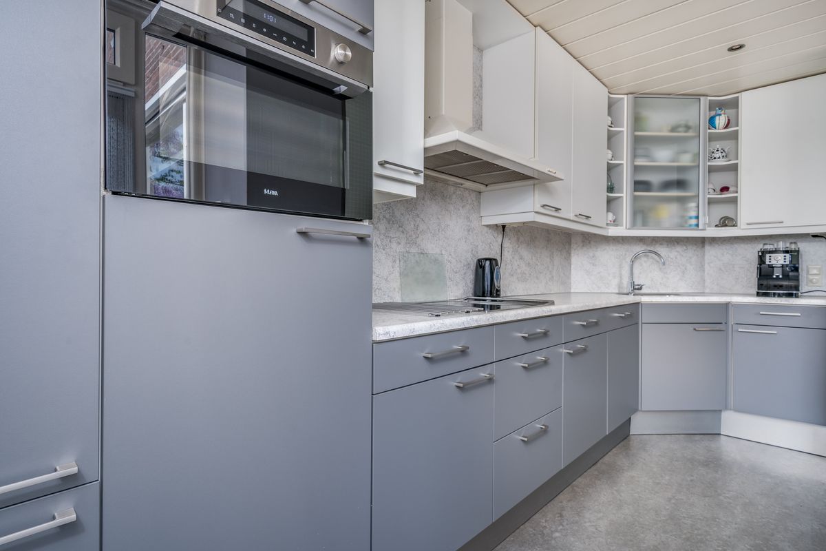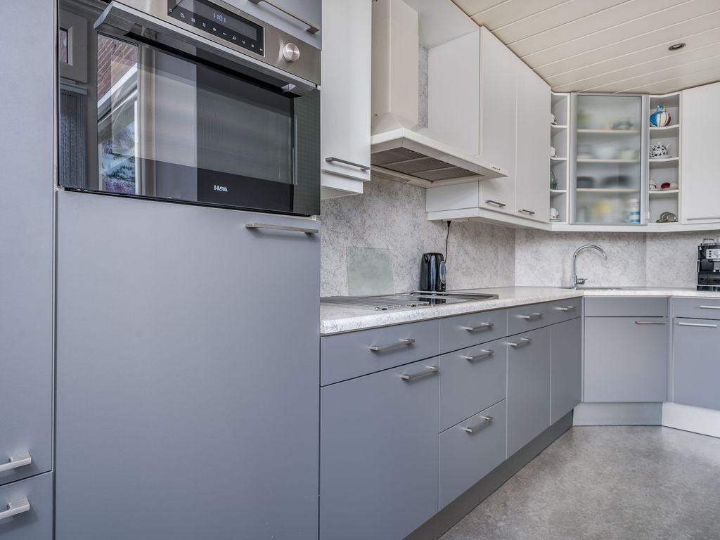De keuken is uitgevoerd in een hoekopstelling en is voorzien van ruim voldoende werk- en kastruimte. Deze beschikt over de volgende inbouwapparatuur: combi oven/magnetron, keramische kookplaat, afzuigkap, vaatwasmachine en koelkast. Vanuit de keuken heb je toegang tot de achtertuin en tot de aangebouwde bijkeuken. De vloer is voorzien van marmoleum.