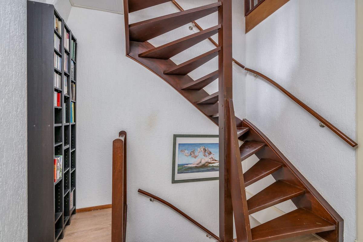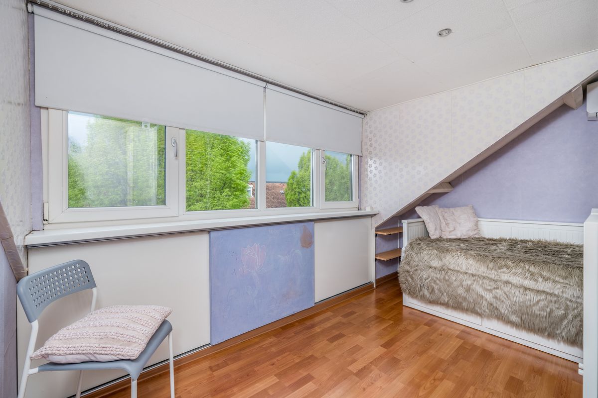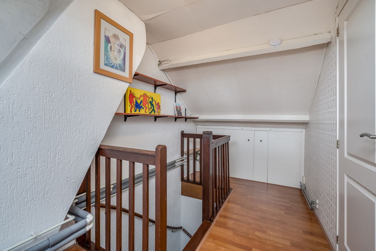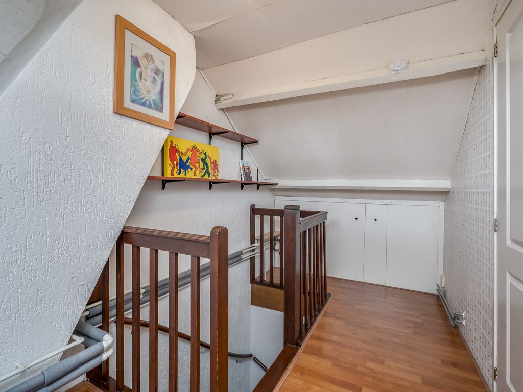 De ruime overloop geeft toegang tot 2 slaapkamers. Hier is ook de opstelplaats van de cv-ketel. Over de volle breedte van de woning is aan beide zijden extra bergruimte onder de schuine daken aangebracht. Het schuine vlizo-raam zorgt voor natuurlijke lichtinval. De vloer is voorzien van kersenhouten kliklaminaat, dat in beide slaapkamers doorloopt.