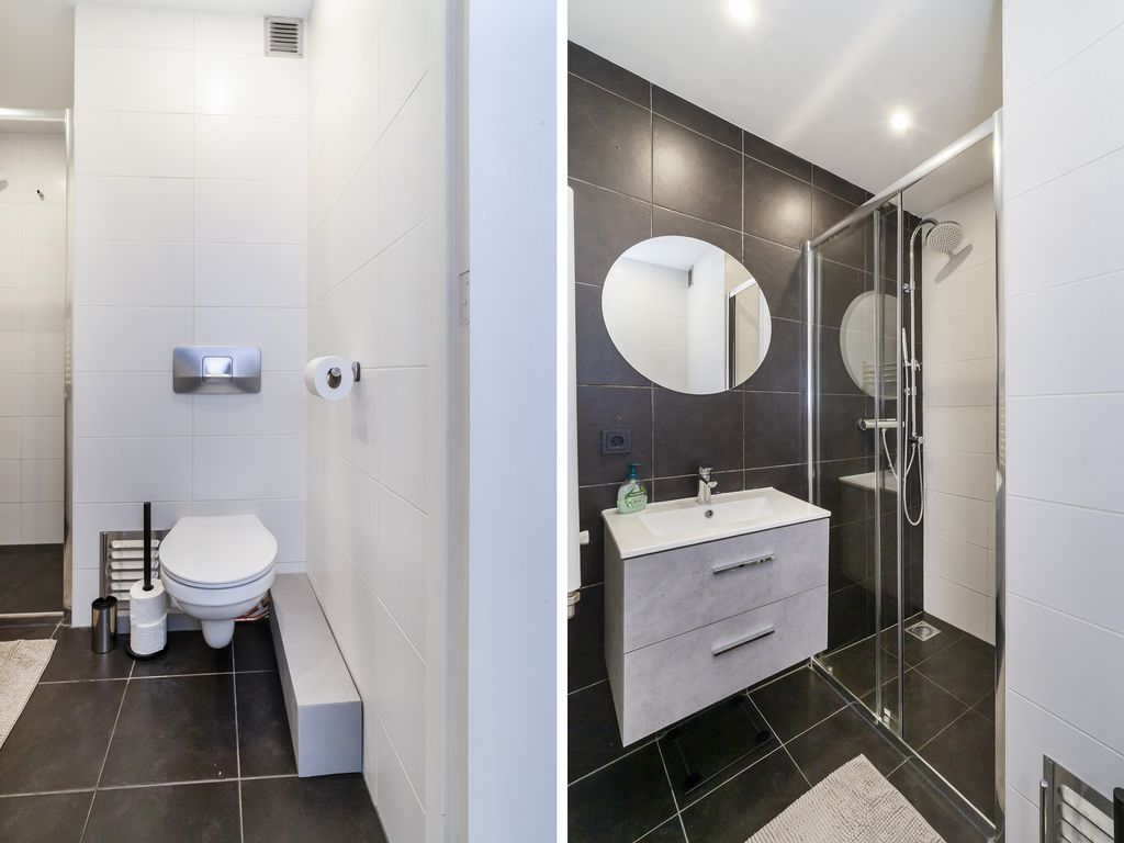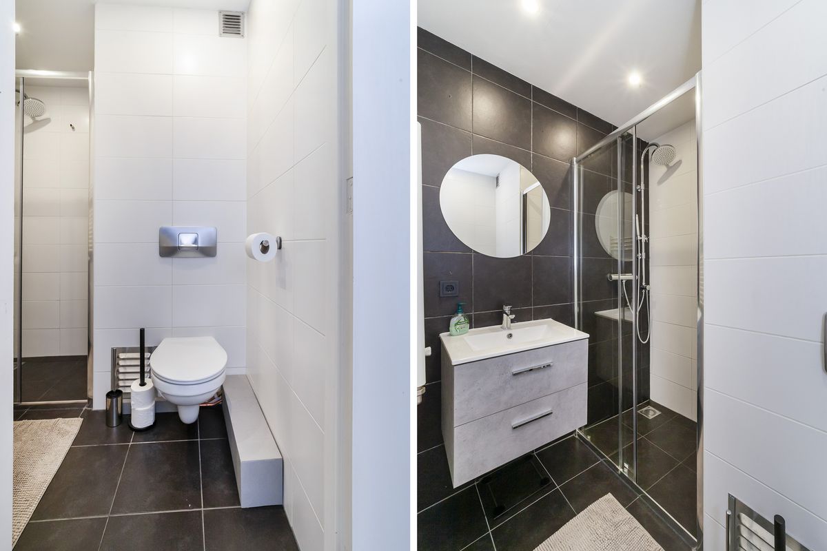 De moderne badkamer is volledig betegeld en voorzien van een wastafelmeubel, douchehoek met thermostaatkraan, een hangend toilet, designradiator en een verlaagd plafond met inbouwspots.
