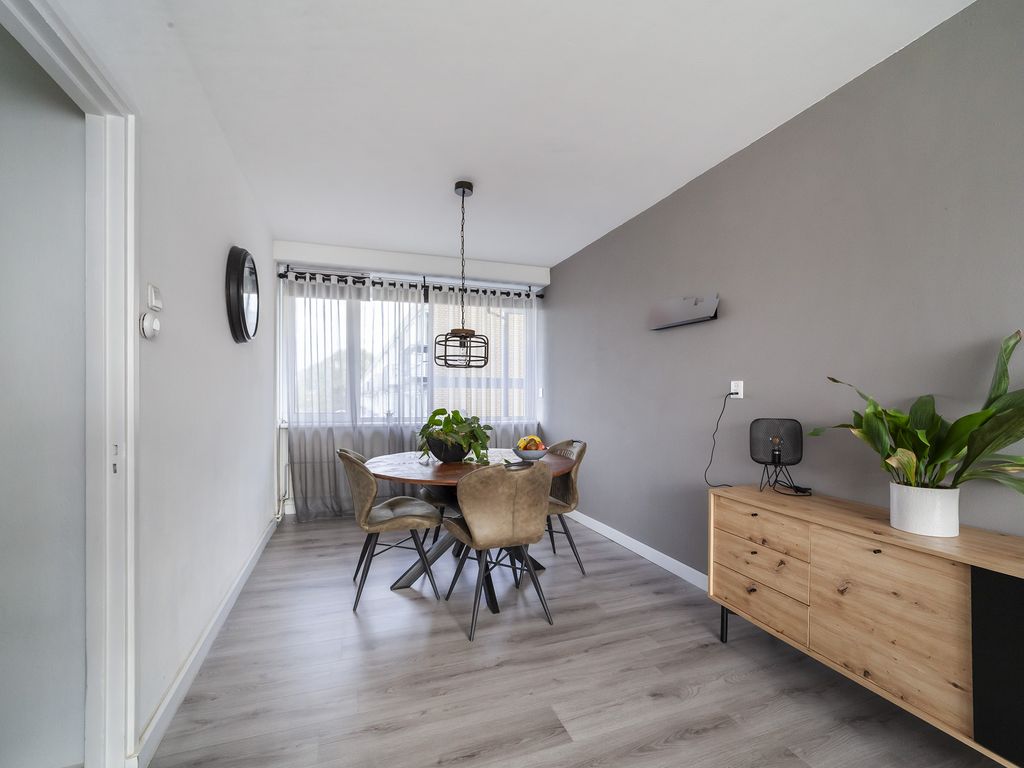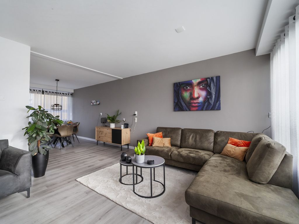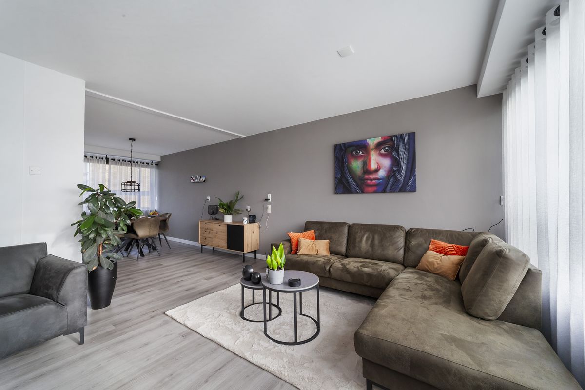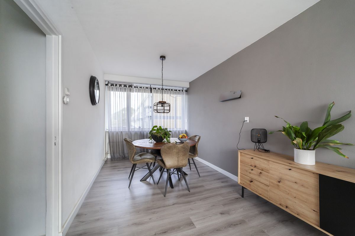 De ruime en lichte woonkamer in L-vorm is voorzien van een nette laminaatvloer, nette wandafwerking en nieuwe radiatoren.