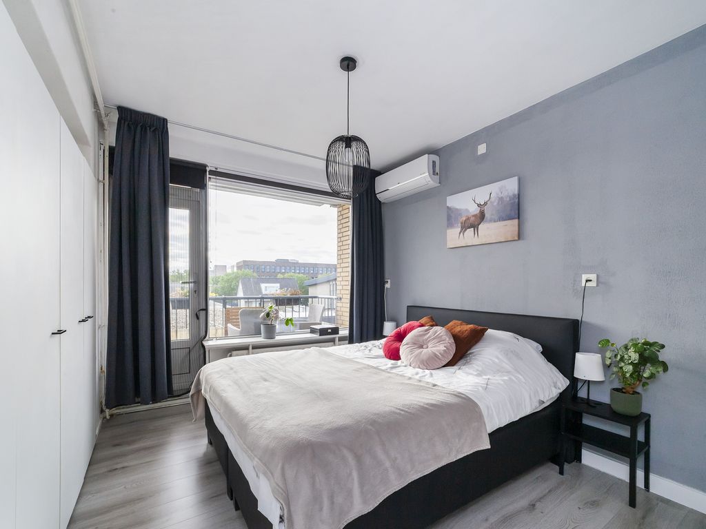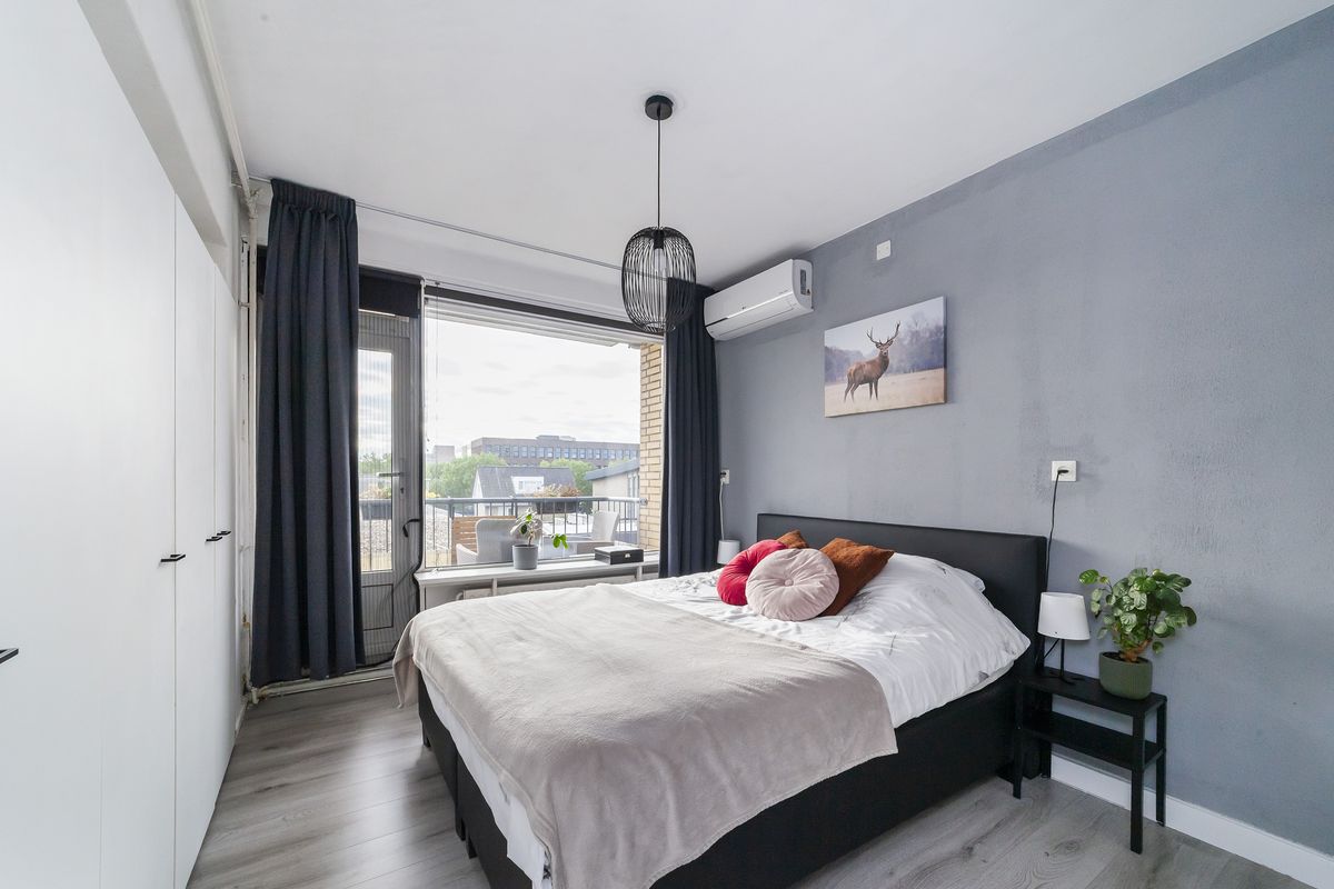 Slaapkamer 1; gelegen aan de achterzijde met kastenwand en toegang tot het balkon.