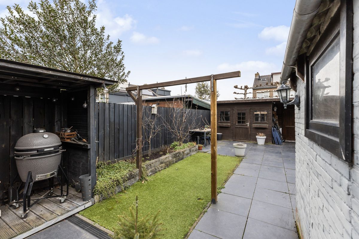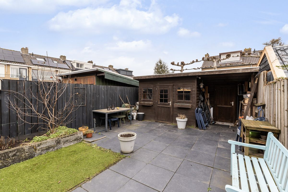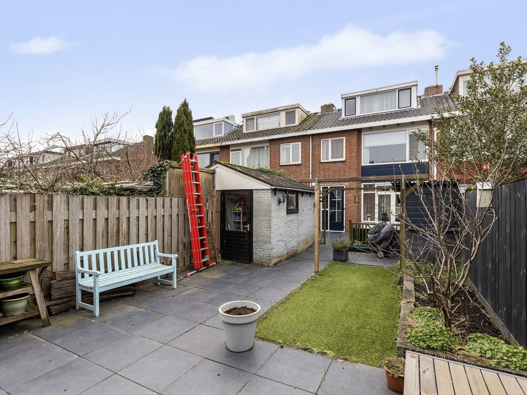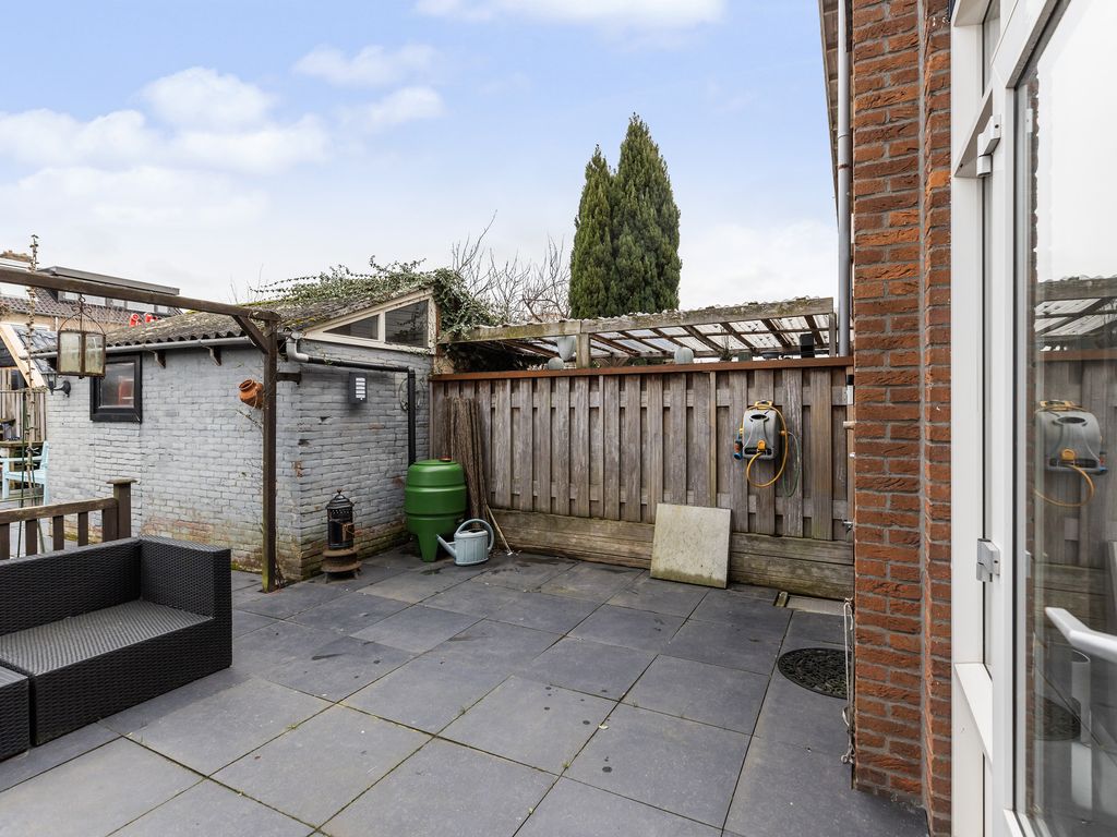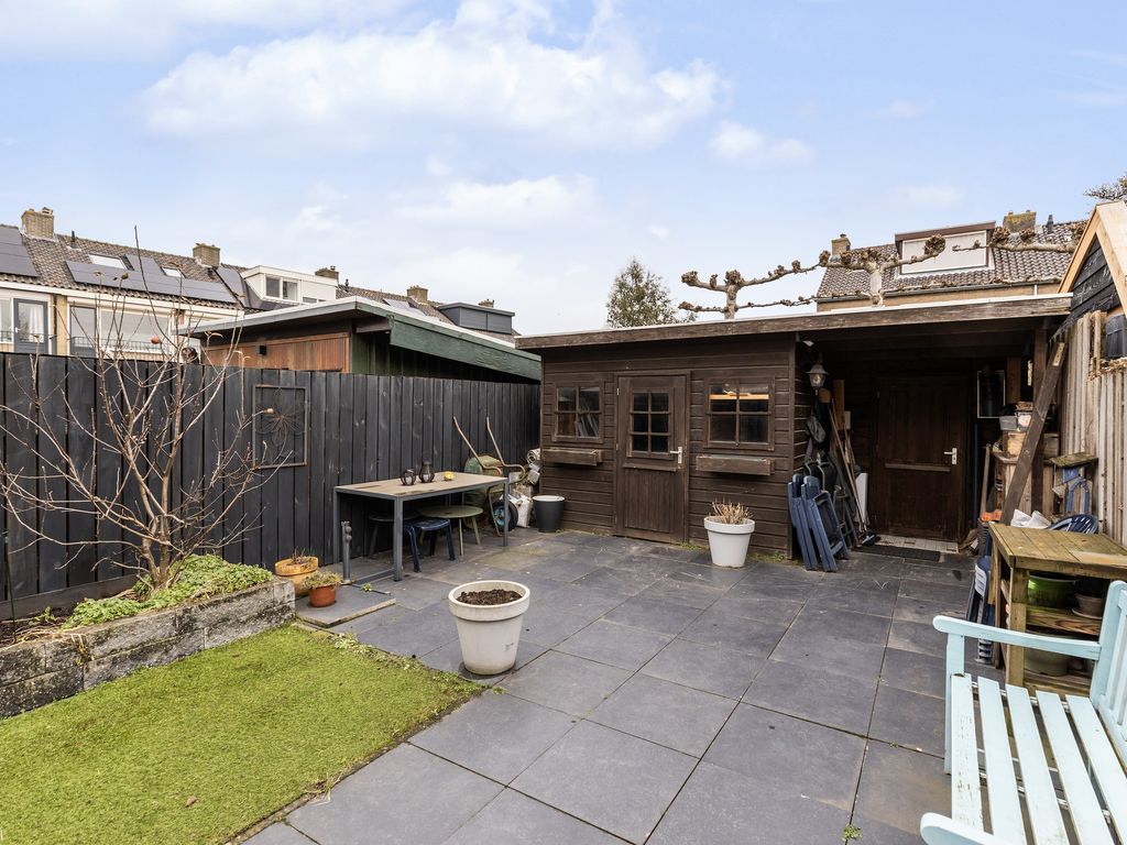 De tuin beschikt over een achterom en twee praktische bergingen: één van circa 2,90 x 1,90 m met overkapping achterin de tuin en één van circa 4,03 x 1,52 m — ideaal voor fietsen en extra opslag.