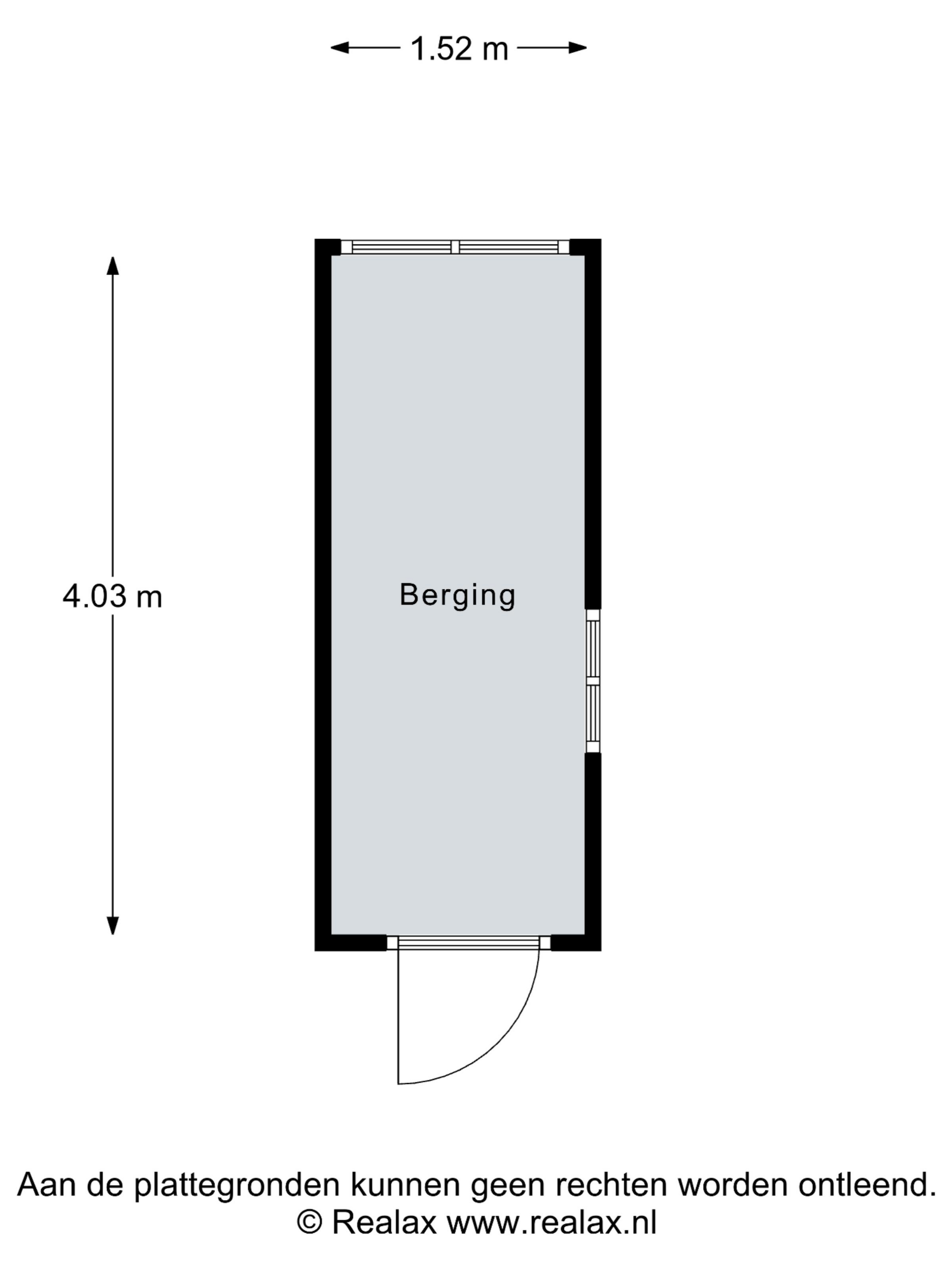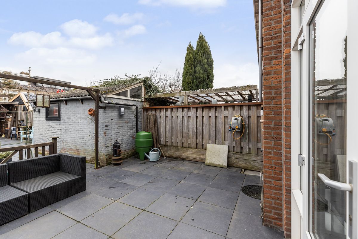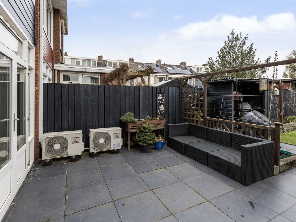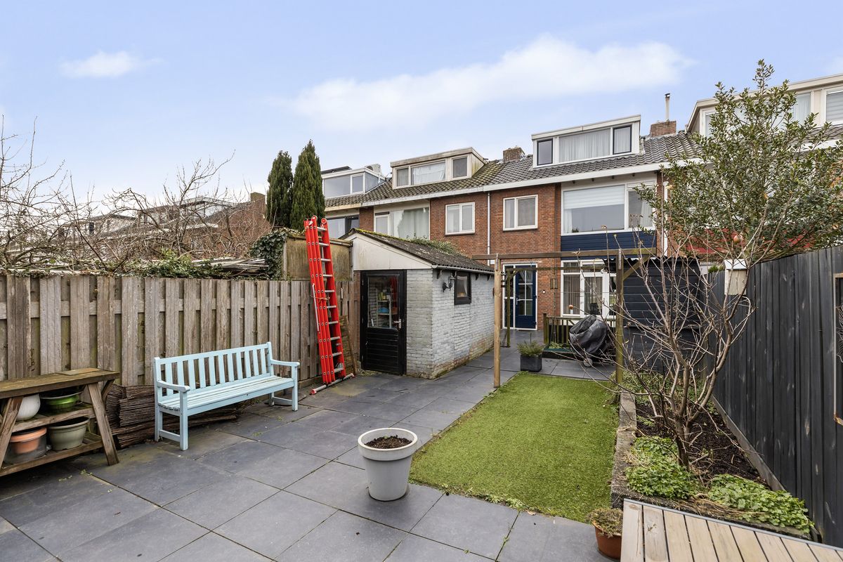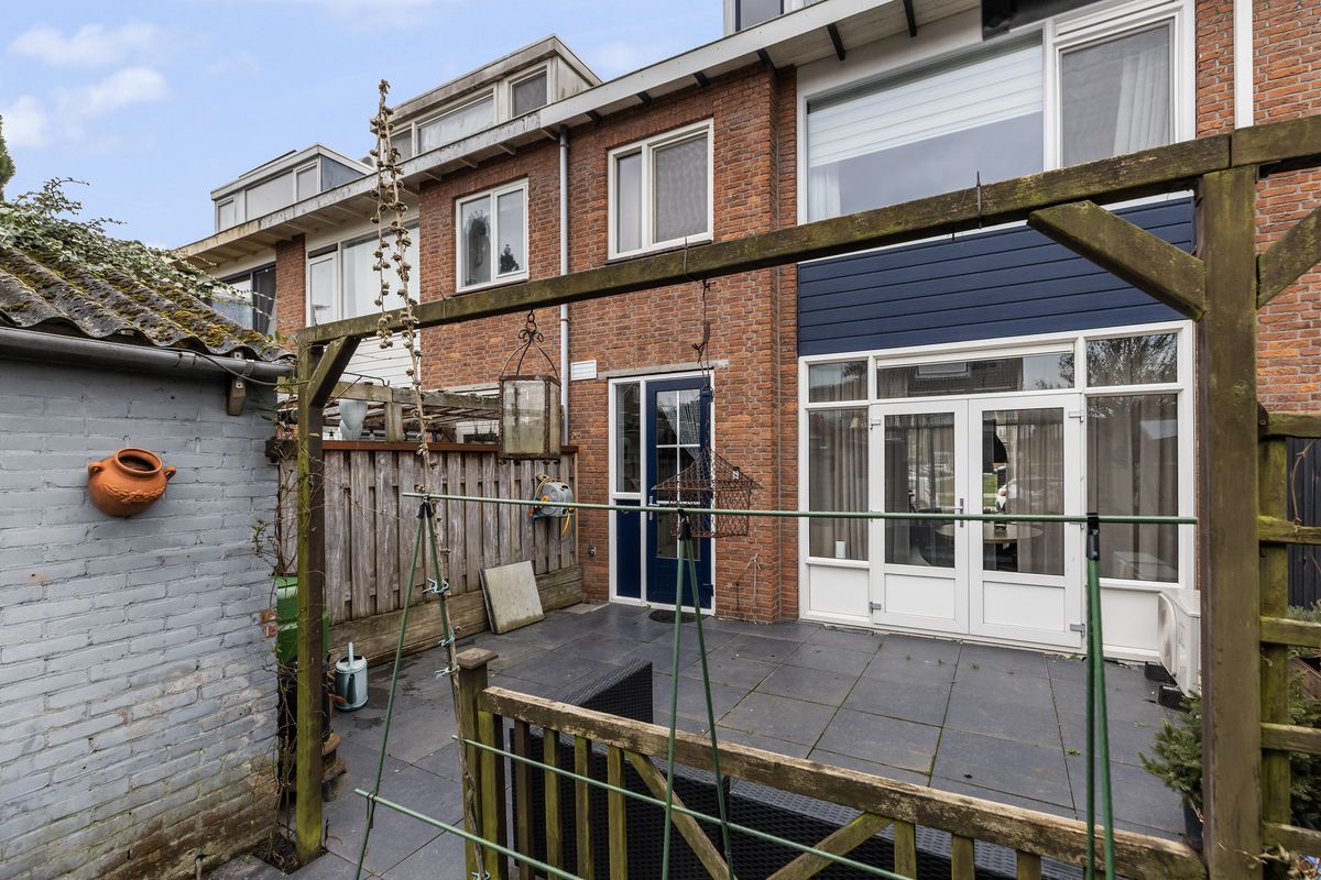 De tuin beschikt over een achterom en twee praktische bergingen: één van circa 2,90 x 1,90 m met overkapping achterin de tuin en één van circa 4,03 x 1,52 m — ideaal voor fietsen en extra opslag.
