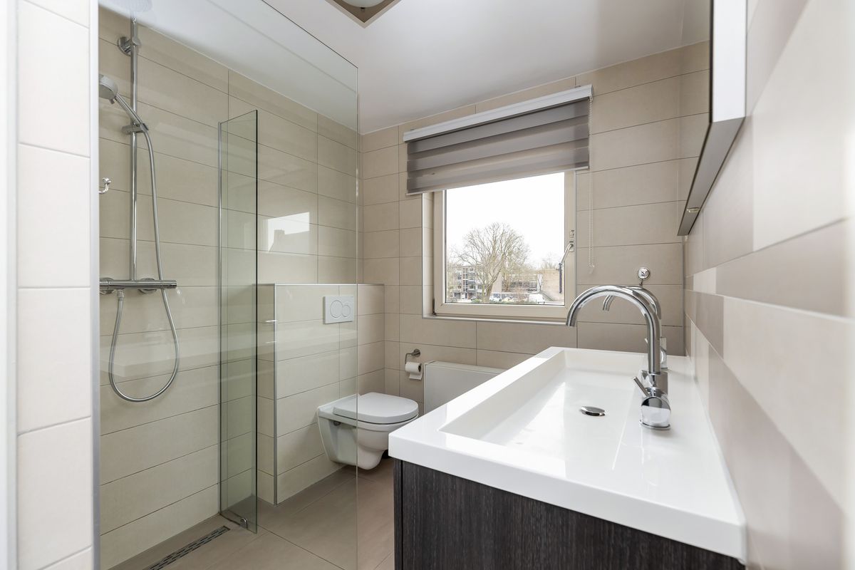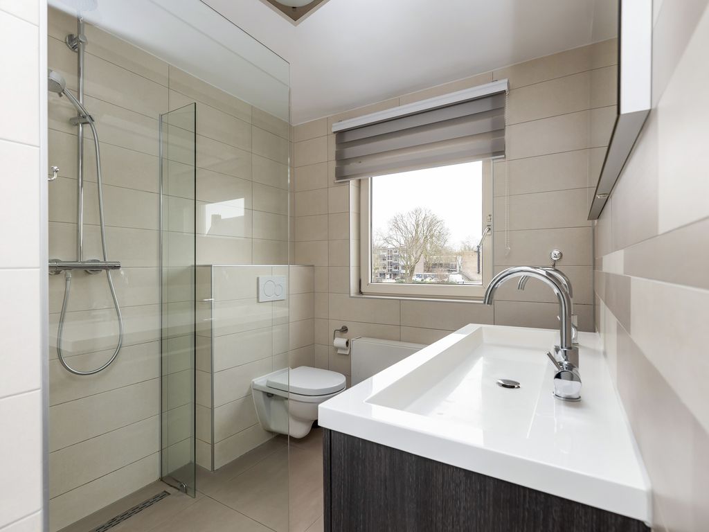 De badkamer (2014) heeft een afmeting van circa 2,06 x 2,05 m en is uitgevoerd met een inloopdouche, toilet en een wastafelmeubel met dubbele wastafel.