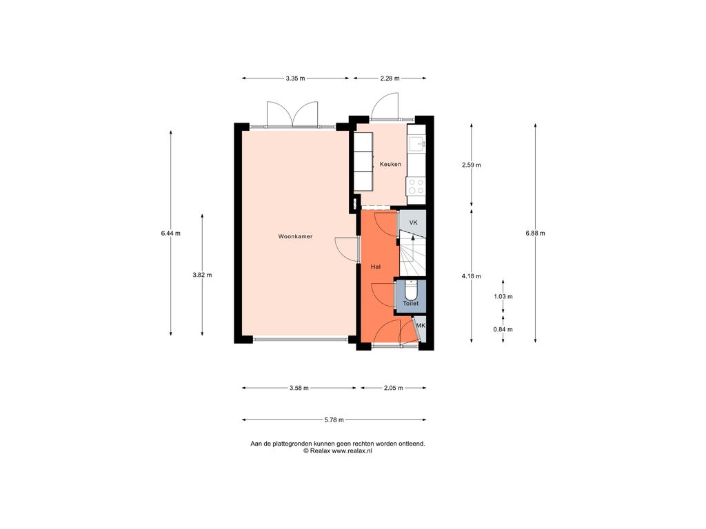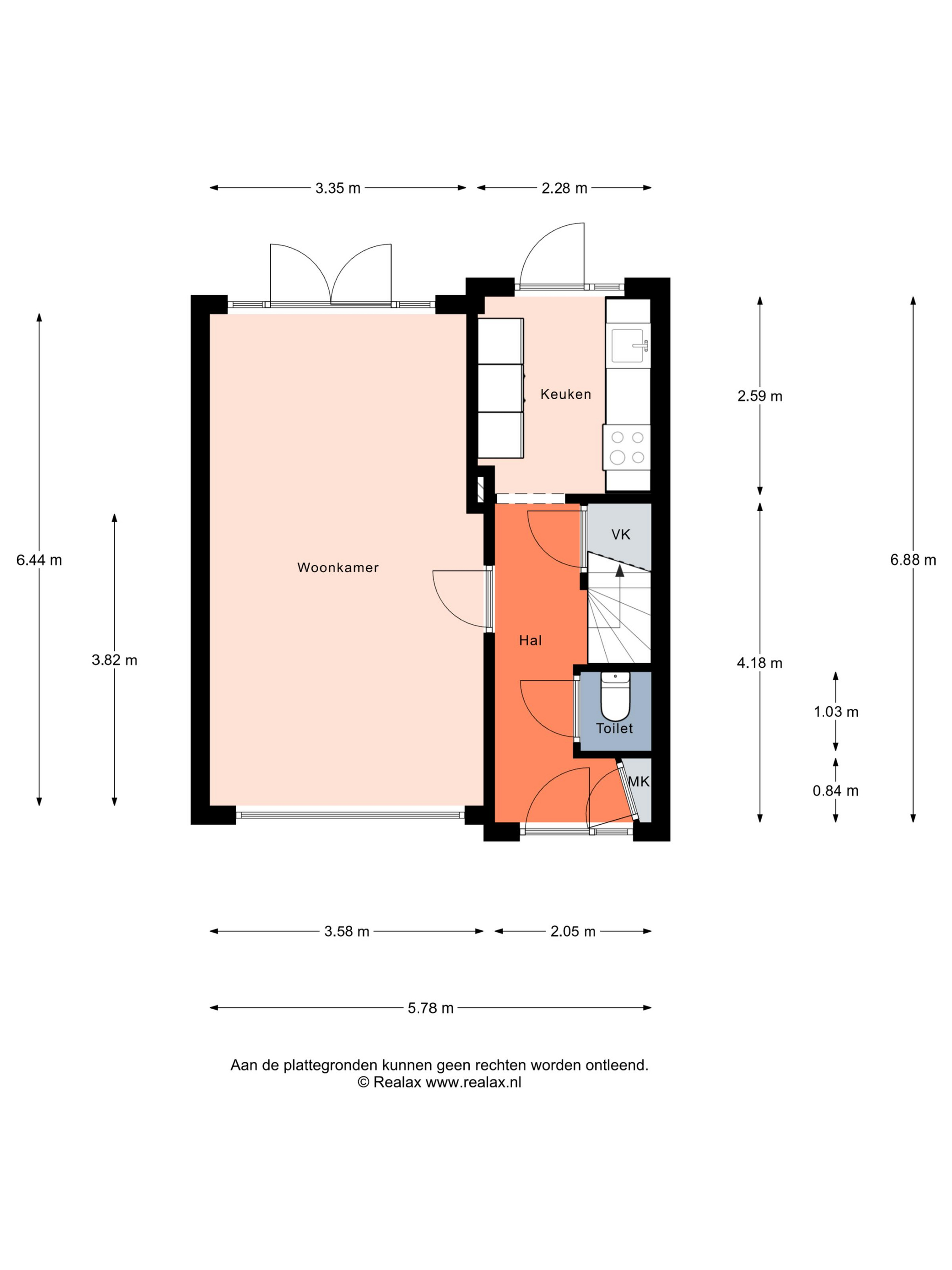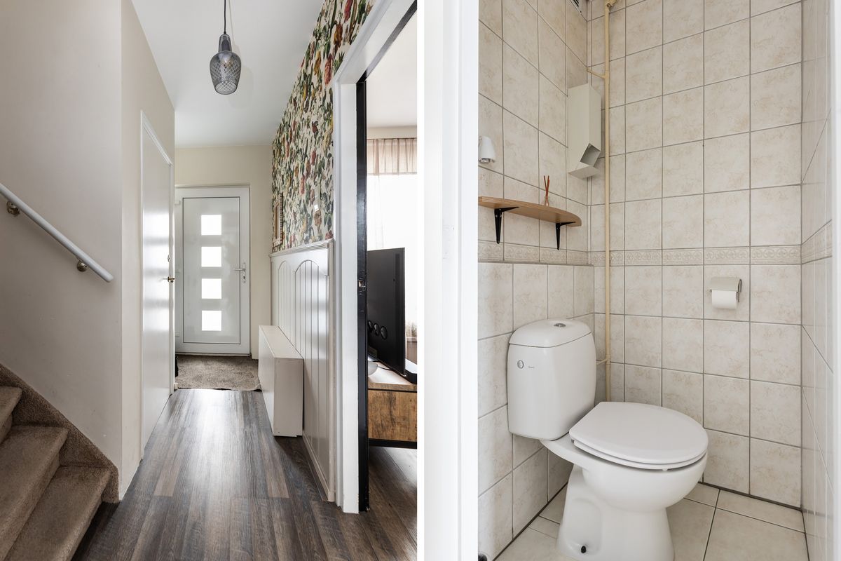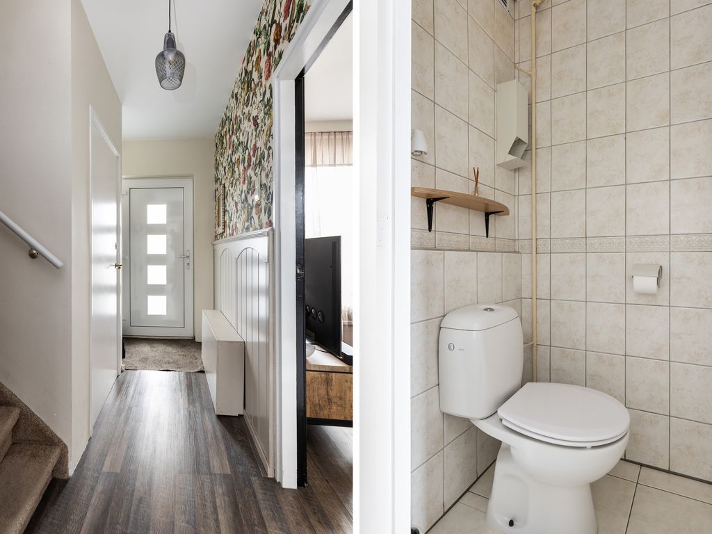 Via de entree kom je in de hal met toegang tot de toiletruimte, de meterkast, de trapopgang naar de eerste verdieping, toegang tot keuken en de woonkamer.