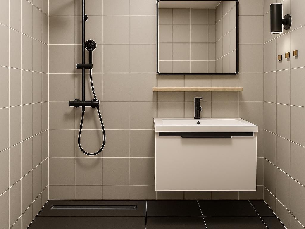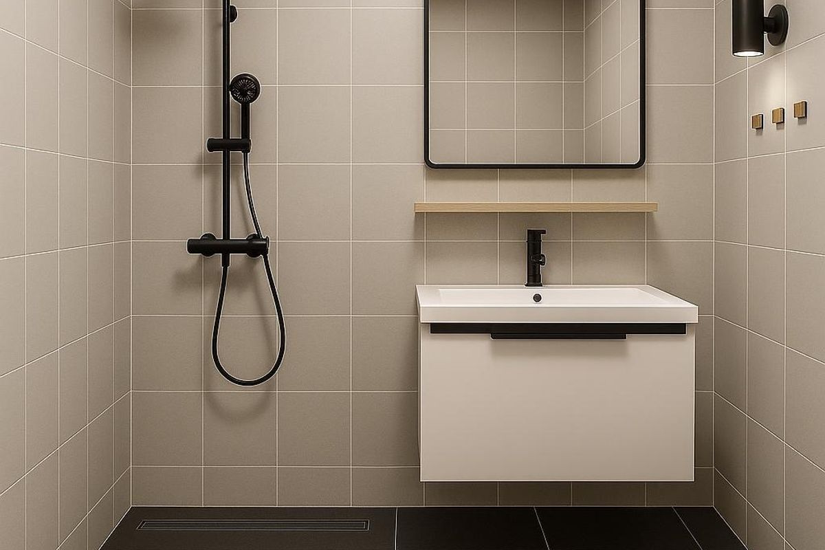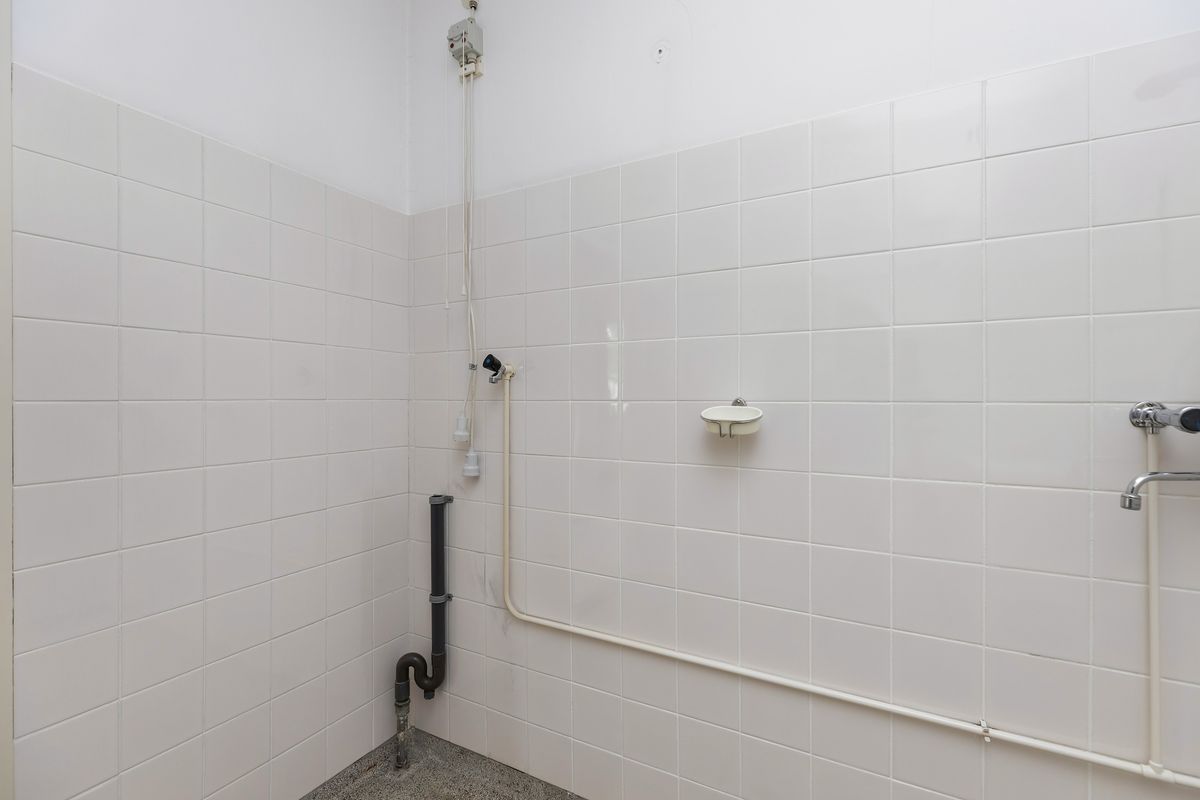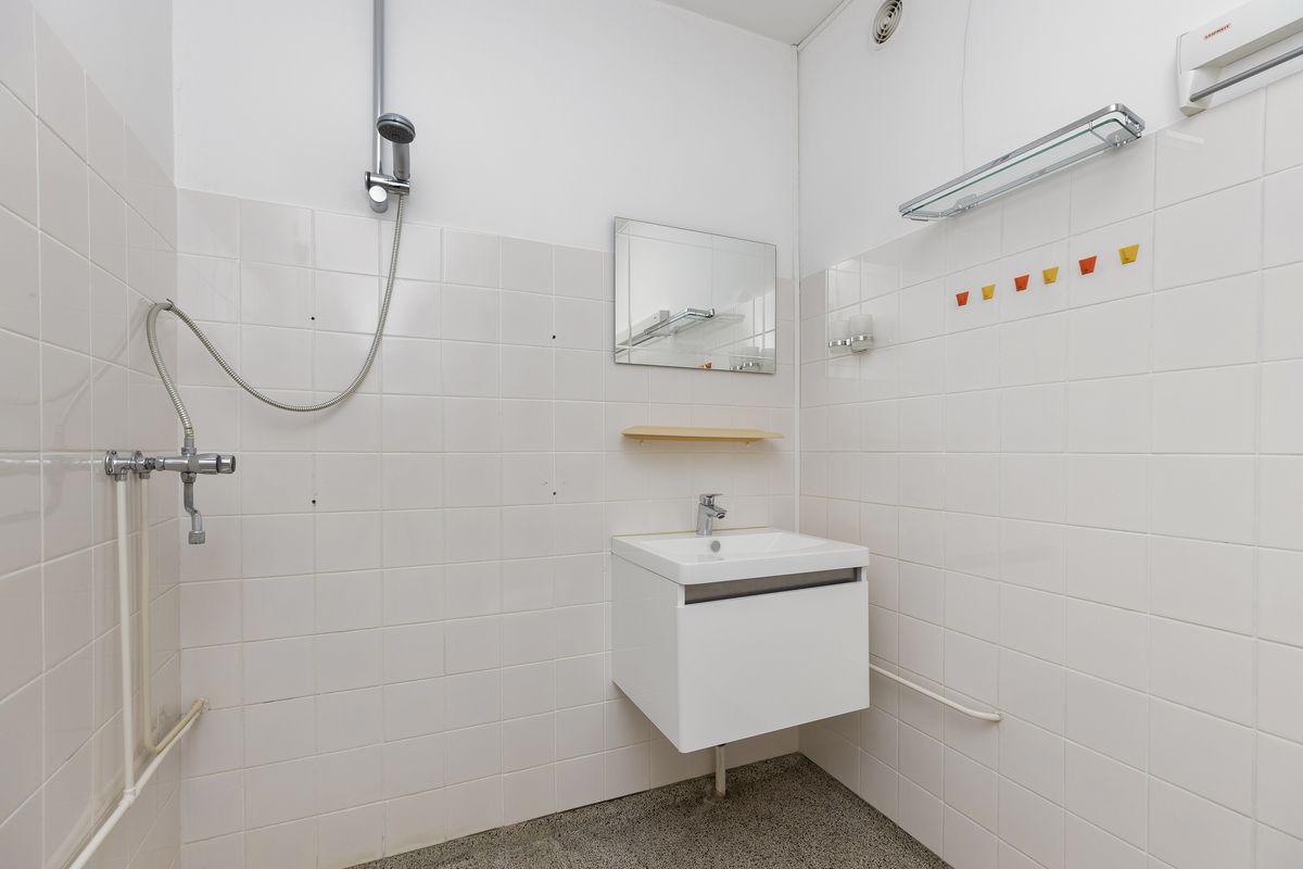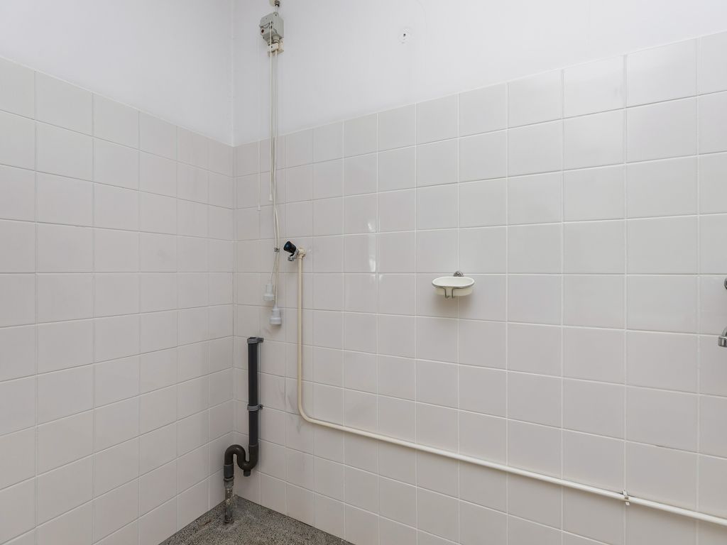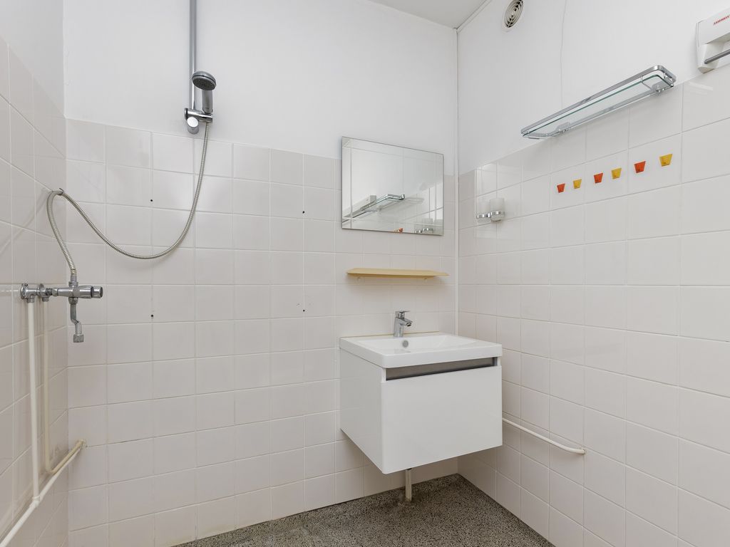 Gedeeltelijk licht betegelde badkamer (ca. 2,19 x 1,78 m) voorzien van een douche, wastafel en aansluiting voor wasapparatuur.