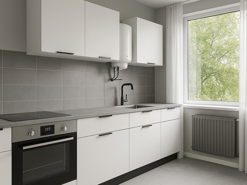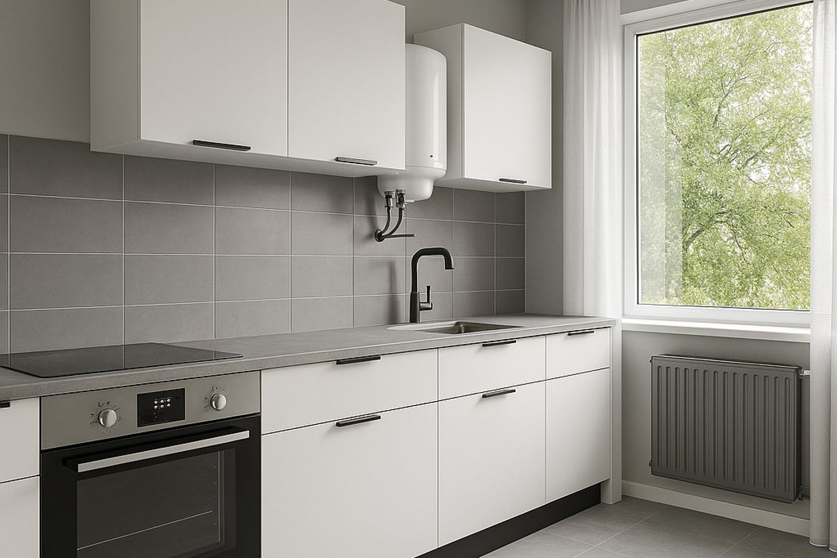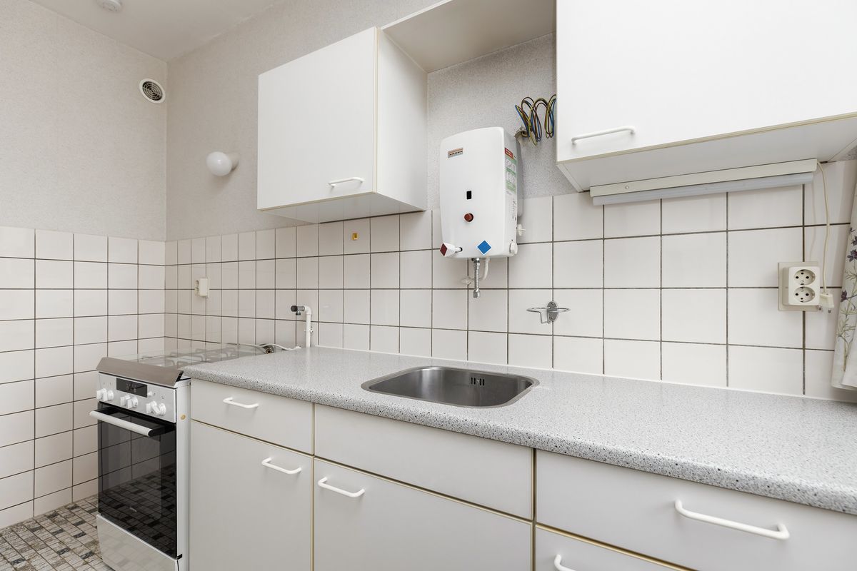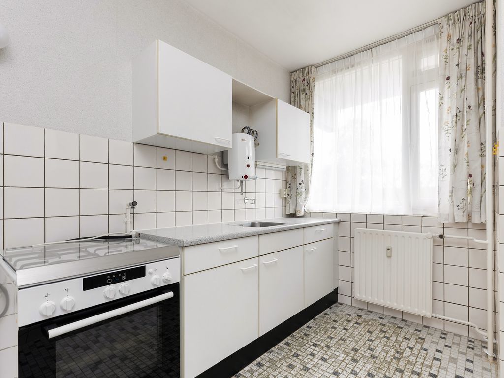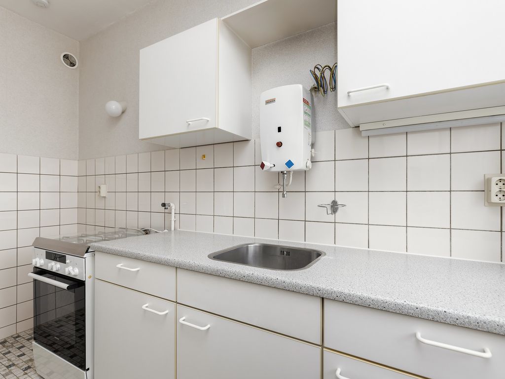De keuken (ca. 3,34 x 2,19 m) is gesitueerd aan de galerijzijde en is voorzien van een eenvoudig keukenblok.