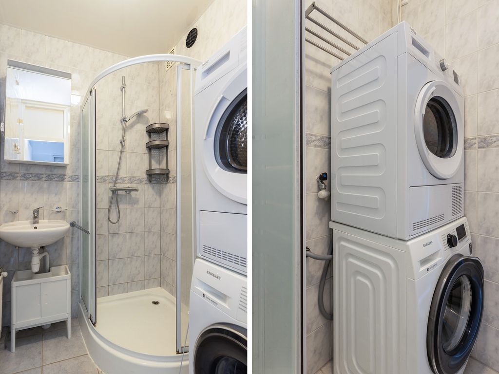 De badkamer is lichtgrijs betegeld en voorzien van een douchecabine en wastafel.