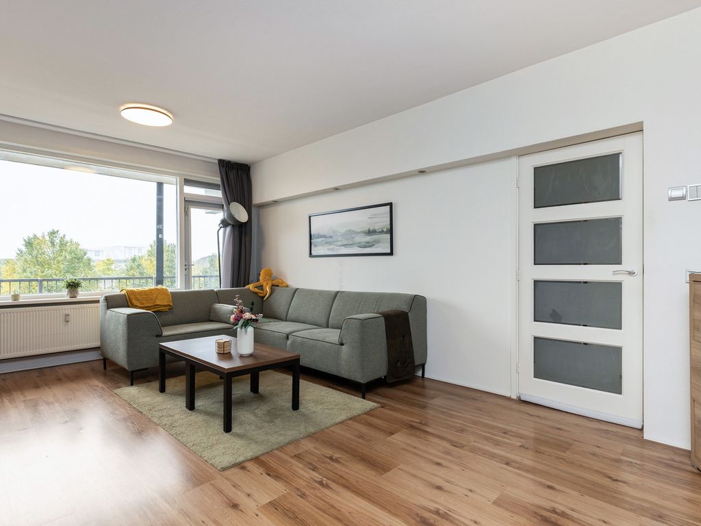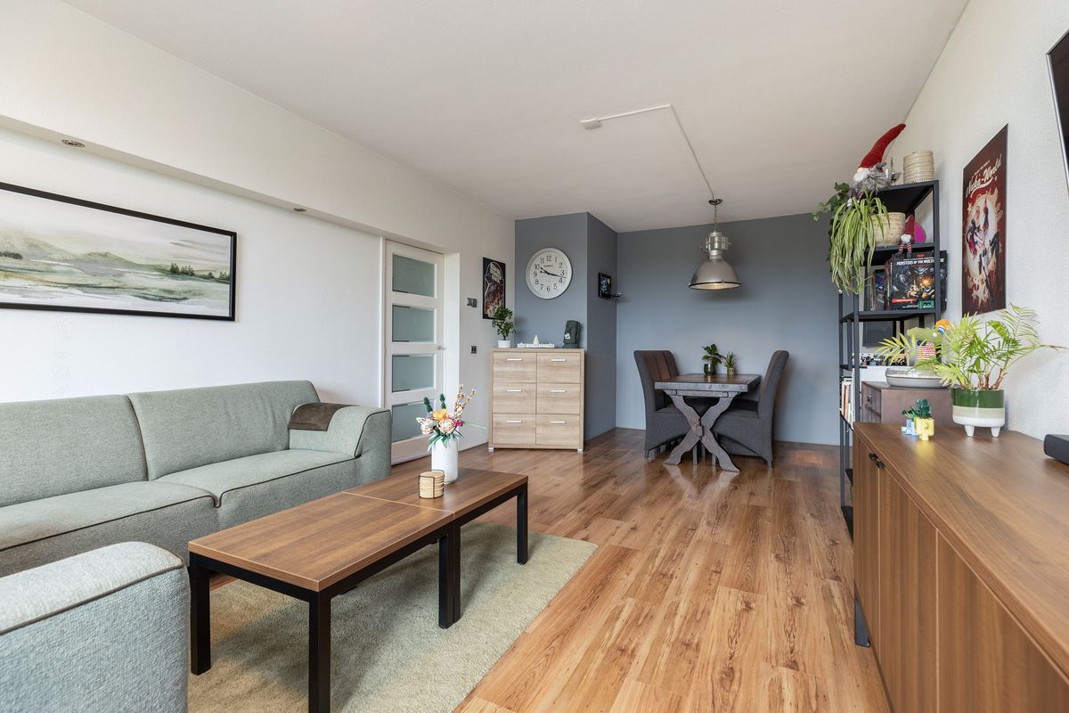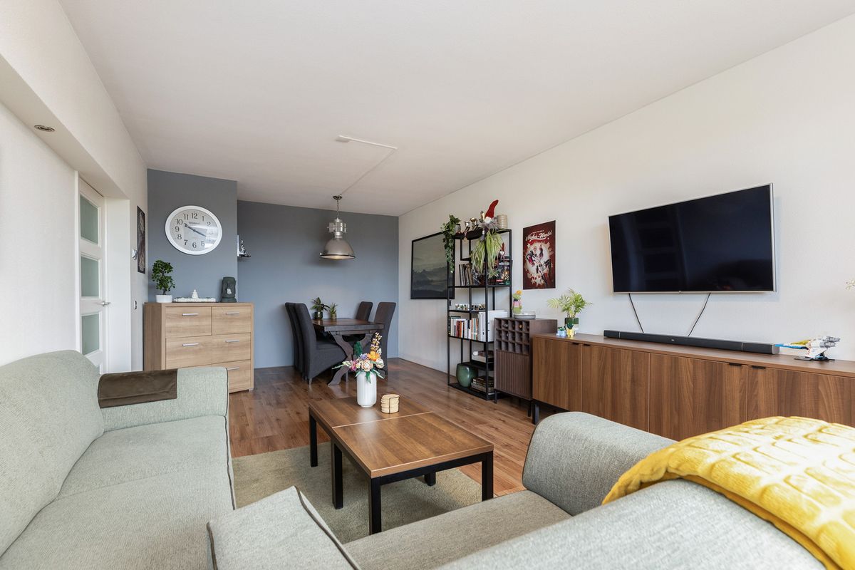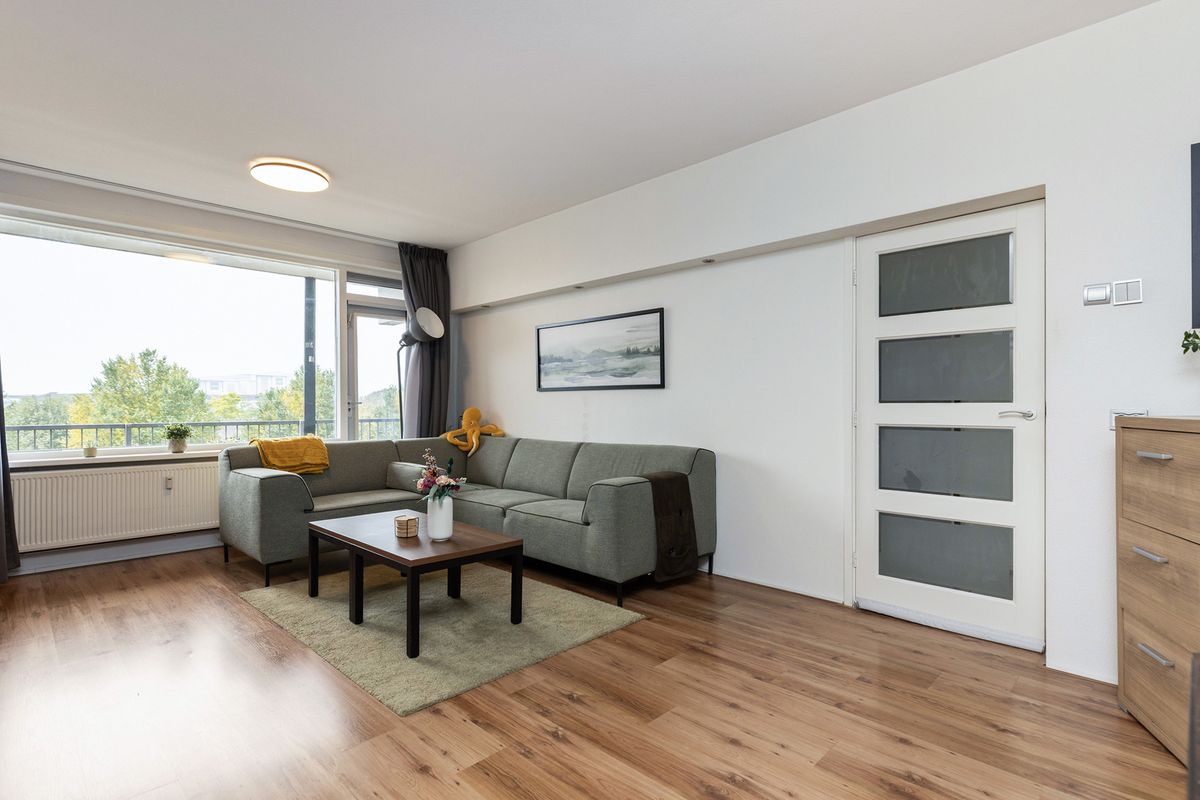 De ruime woonkamer (ca. 7,30 x 3,88 m) is vergroot en voorzien van een nette laminaatvloer. Vanuit de woonkamer heb je toegang tot het balkon met uitzicht op groen en het winkelend publiek.