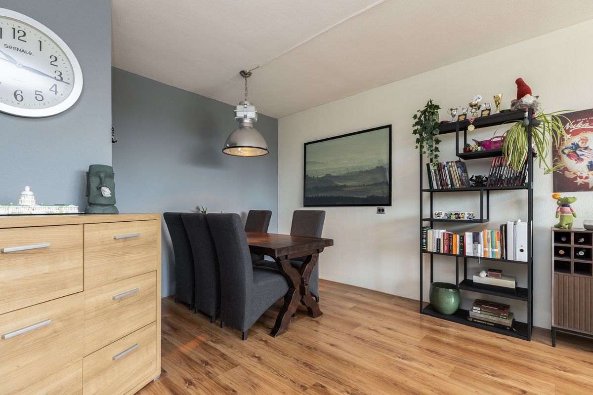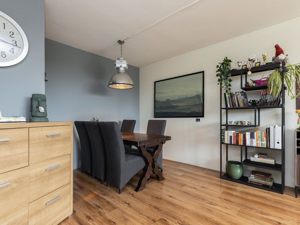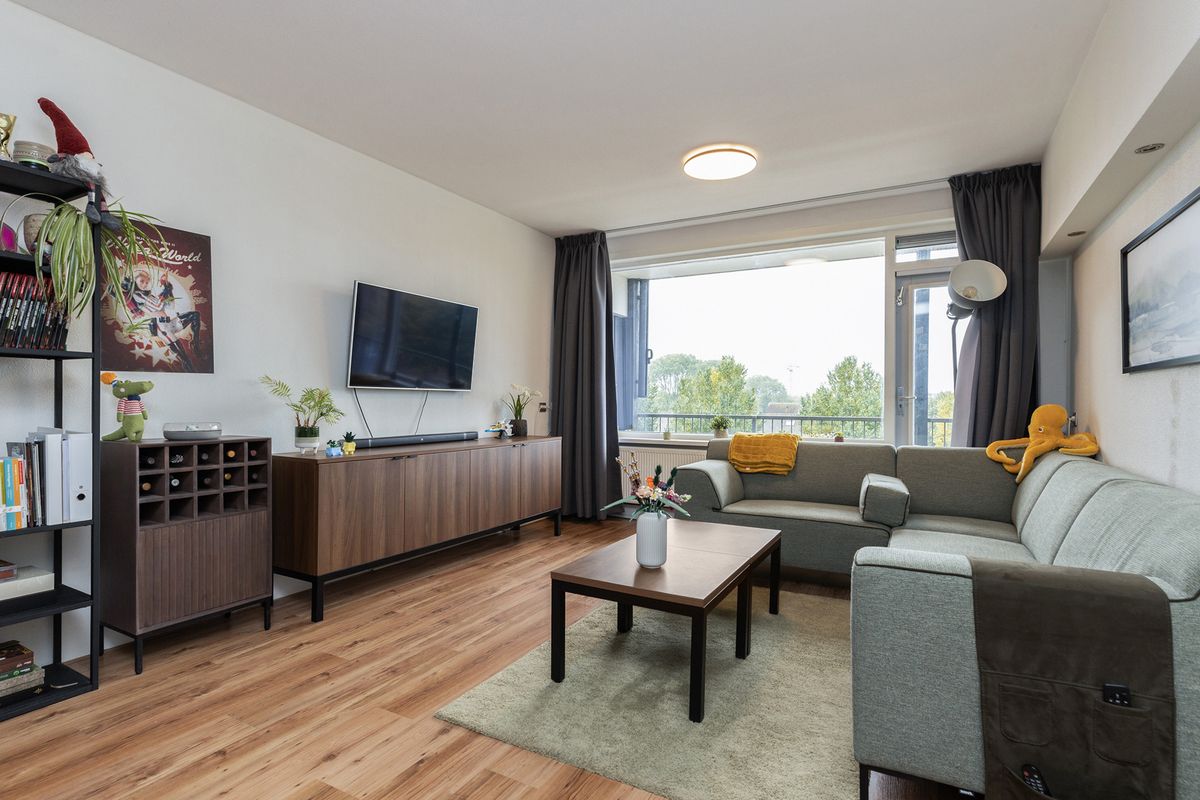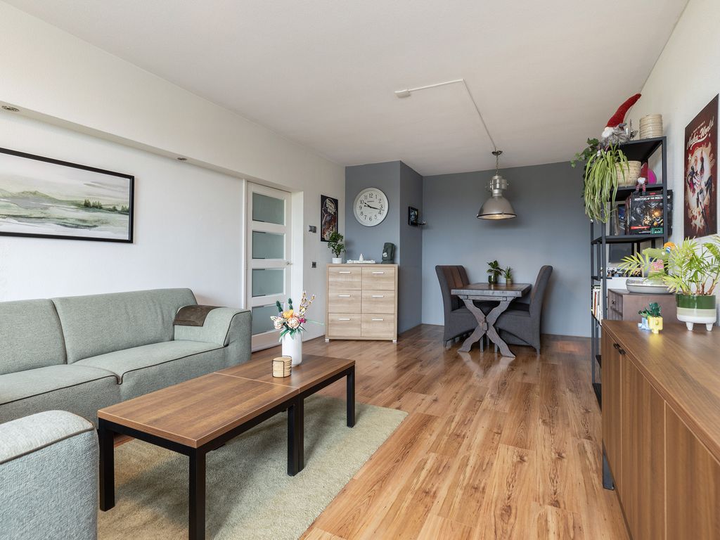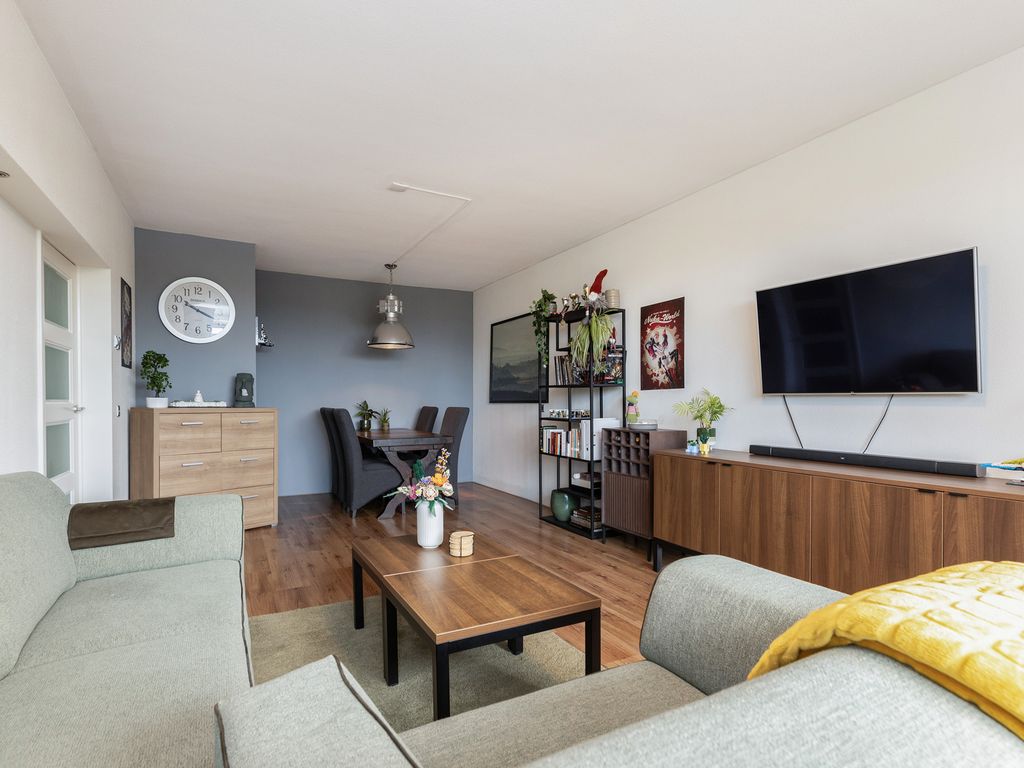 De ruime woonkamer (ca. 7,30 x 3,88 m) is vergroot en voorzien van een nette laminaatvloer. Vanuit de woonkamer heb je toegang tot het balkon met uitzicht op groen en het winkelend publiek.