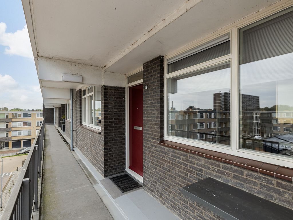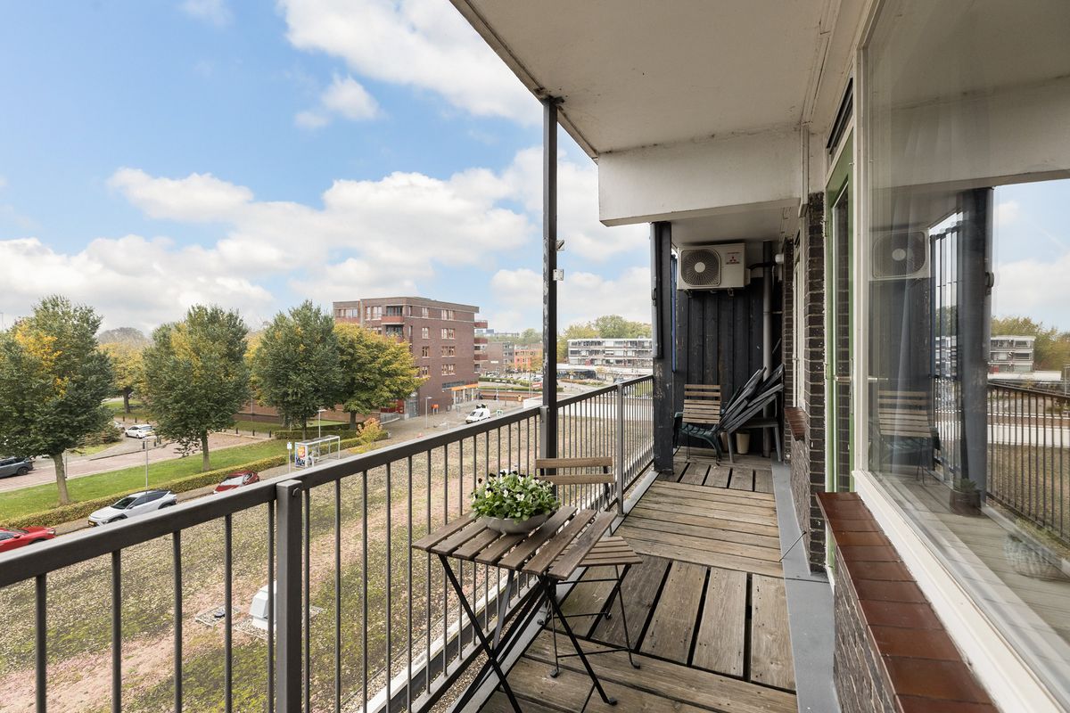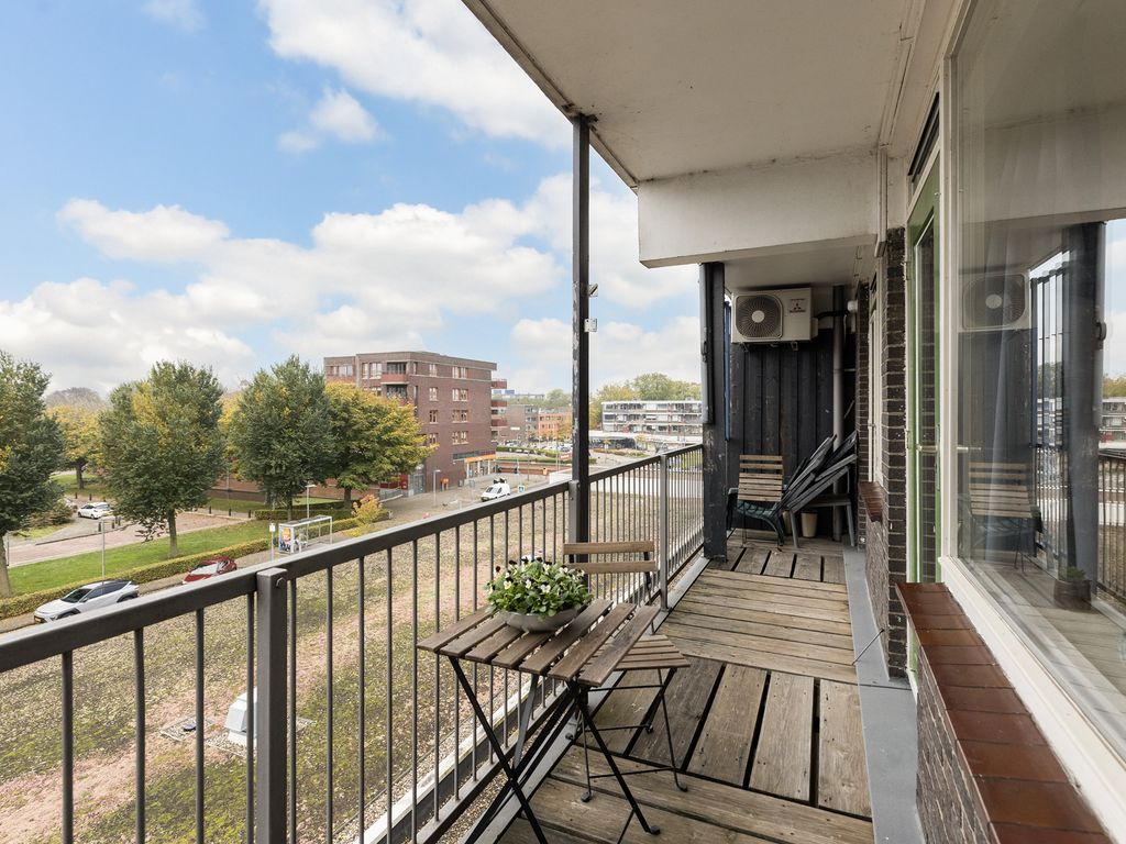 Een heerlijk ruim en zonnig balkon op het zuidwesten (ca. 7,5 m breed) met uitzicht op groen en de levendige winkelstraat. De vloer is afgewerkt met steigerhouten vlonders en de privacy schermen zijn vernieuwd.
