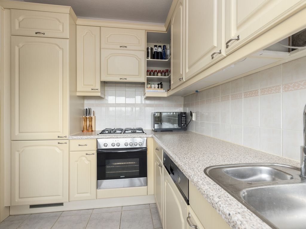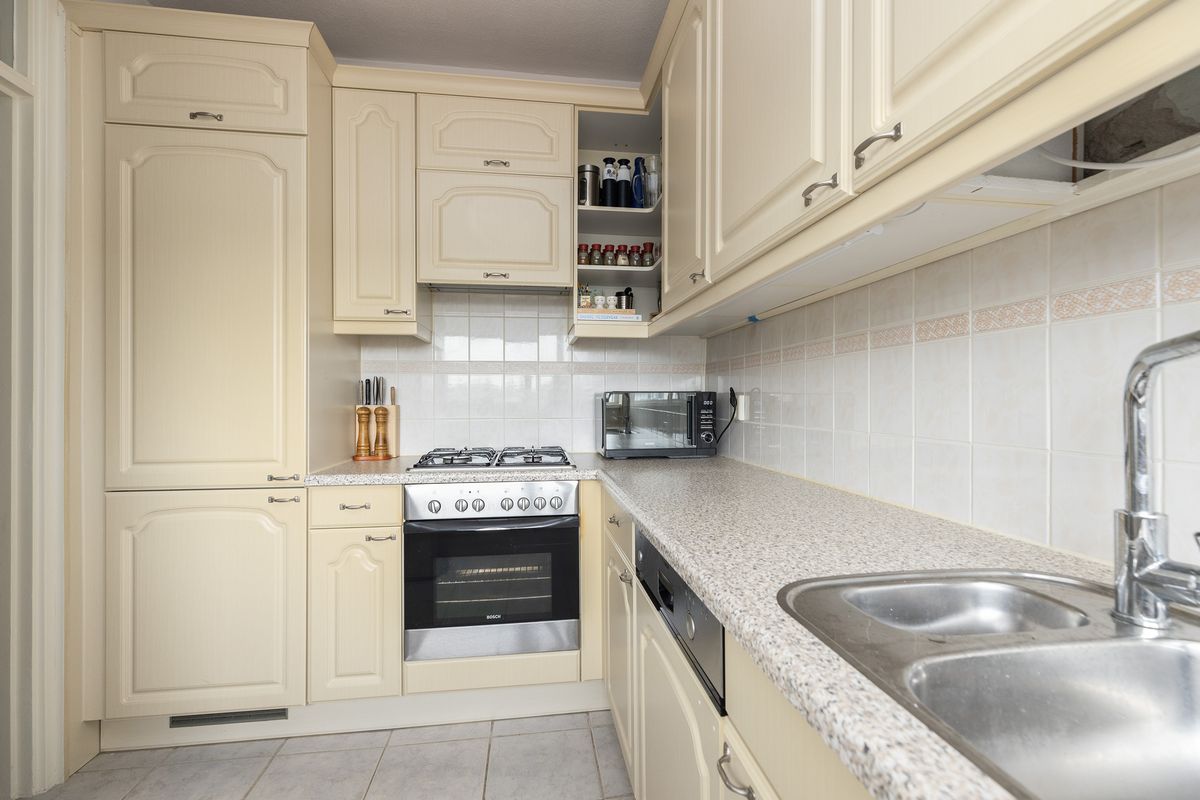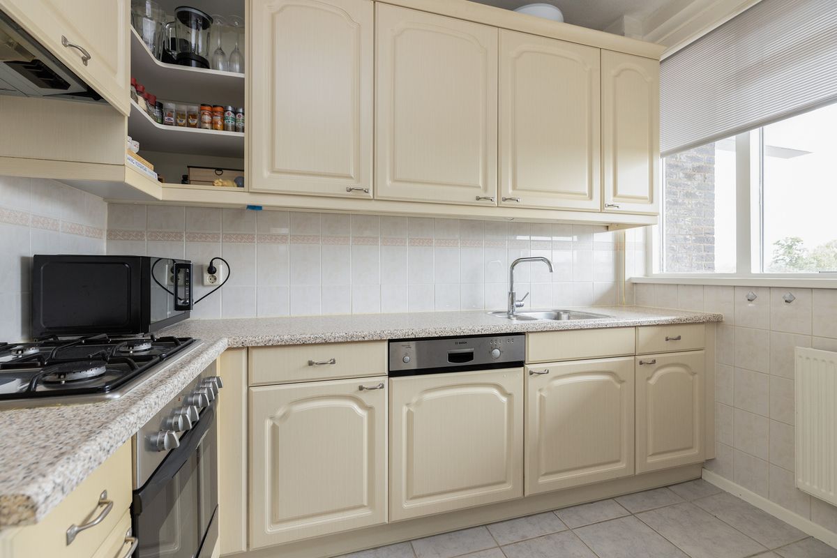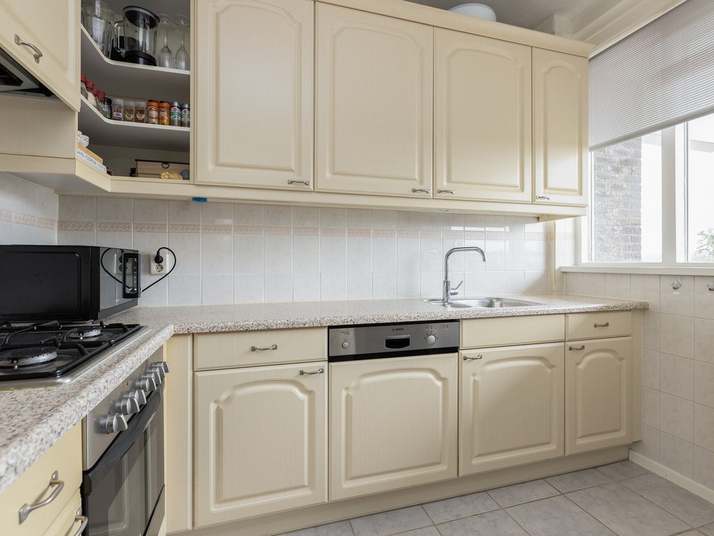 De keuken (ca. 2,97 x 2,29 m) is gelegen aan de galerijzijde en is uitgevoerd in een hoekopstelling met gaskookplaat, elektrische oven, koel-/vriescombinatie en vaatwasmachine.