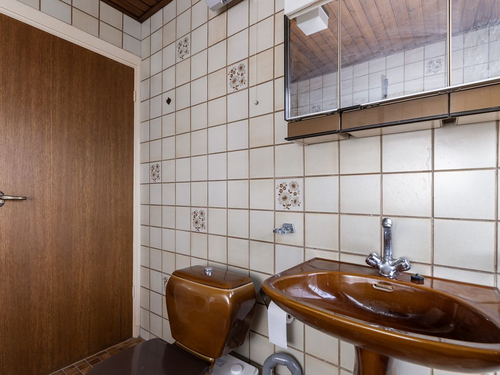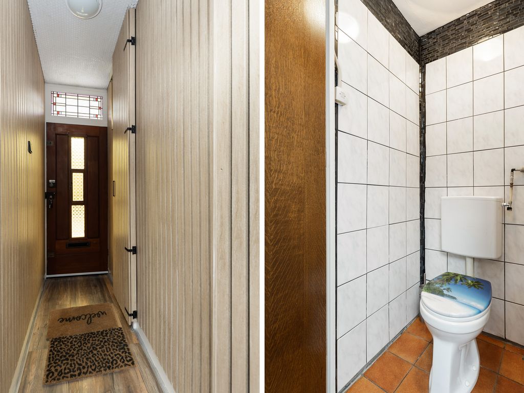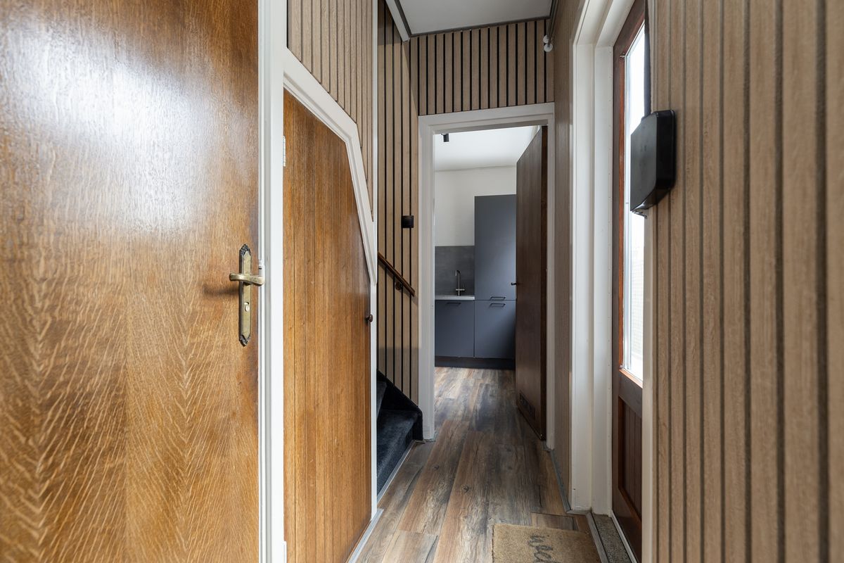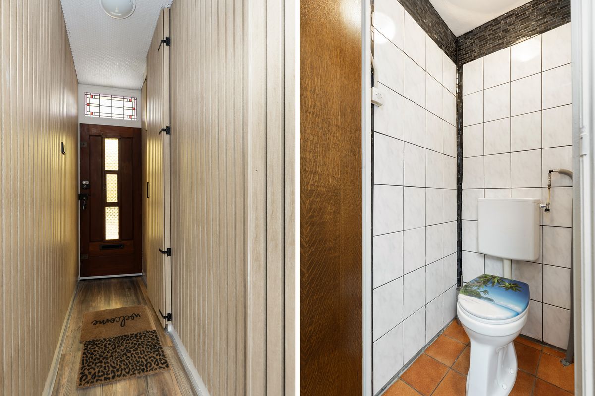 Aansluitend bevindt zich het achter portaal met toegang tot de toiletruimte, de kelderkast, trap naar de verdieping en toegang tot de keuken.