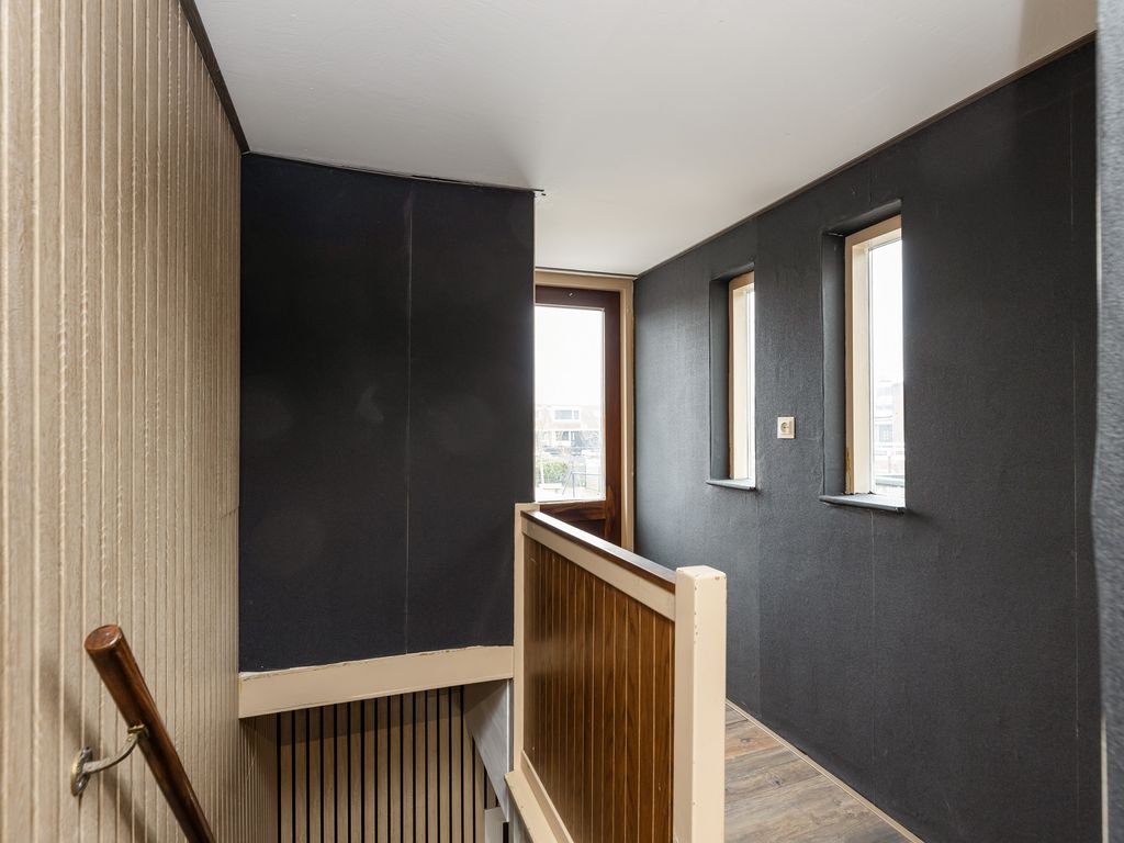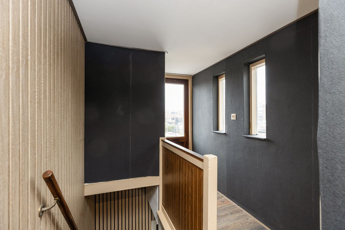 De overloop is keurig afgewerkt met een lattenwand en geeft toegang tot de vertrekken.