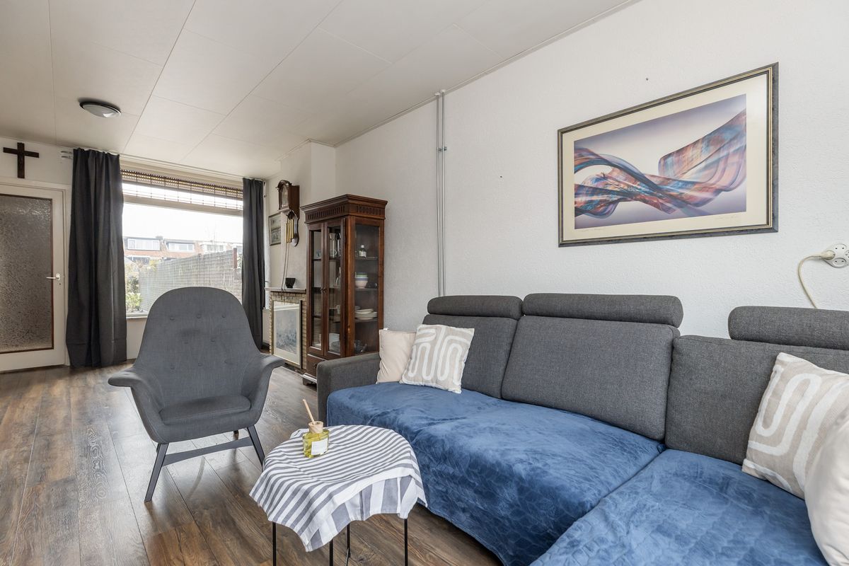 De woonkamer is afgewerkt met een laminaatvloer en granol wanden.
