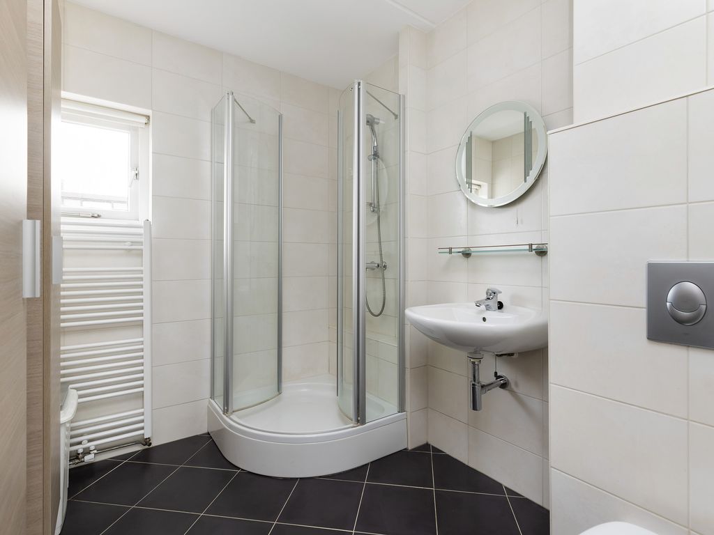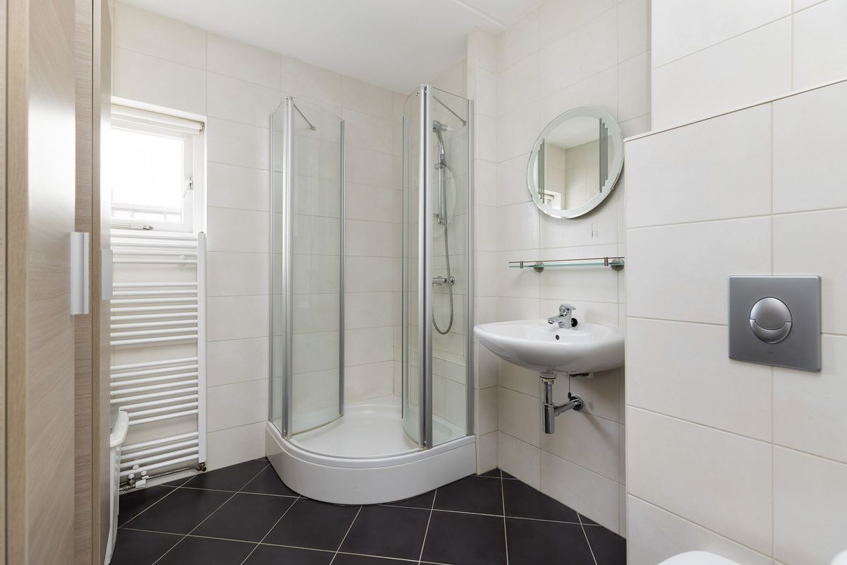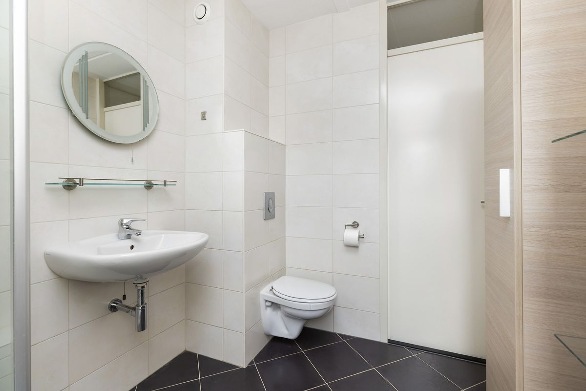 De badkamer is licht betegeld en voorzien van een douchecabine, wastafel en hangend toilet.