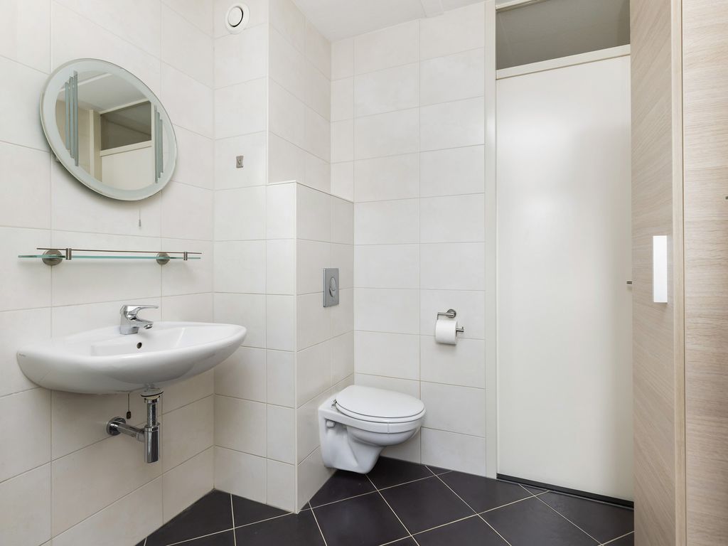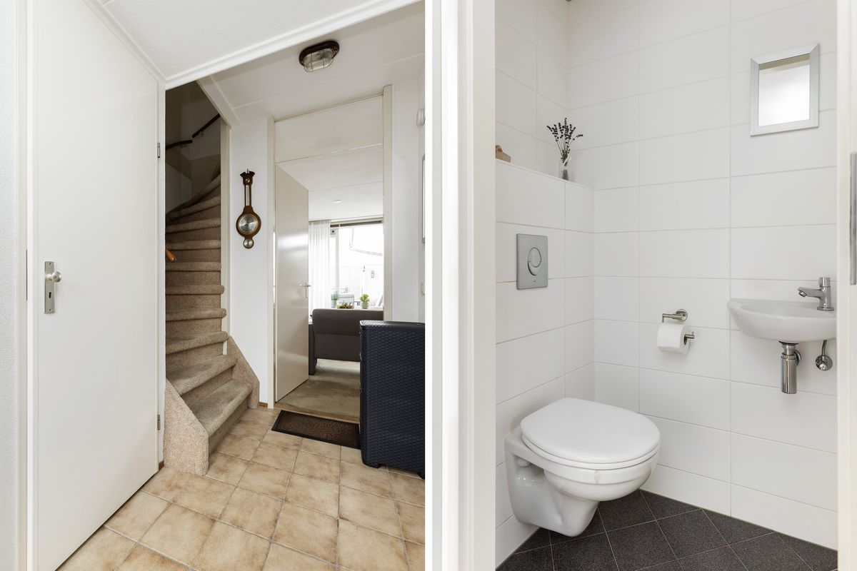 Toiletruimte, volledig licht betegeld en voorzien van hangend toilet en fonteintje.