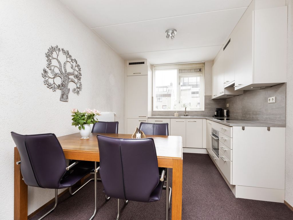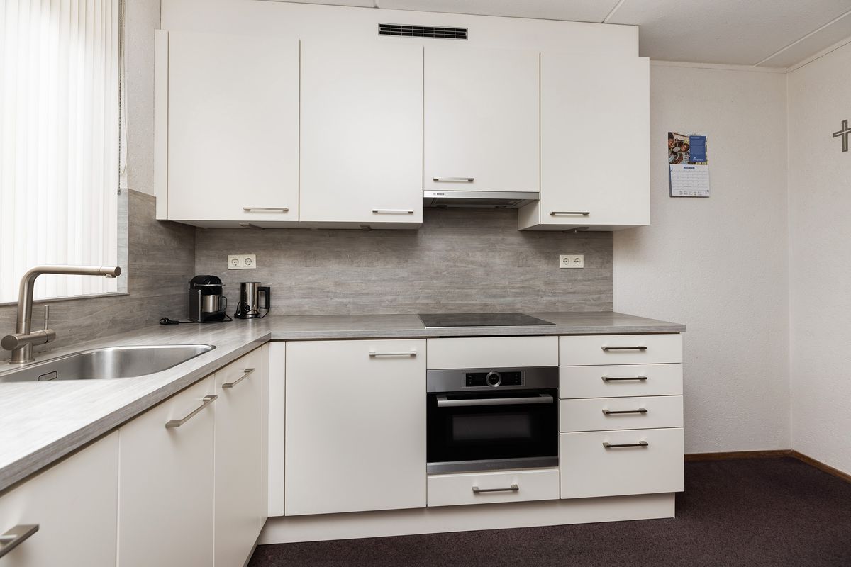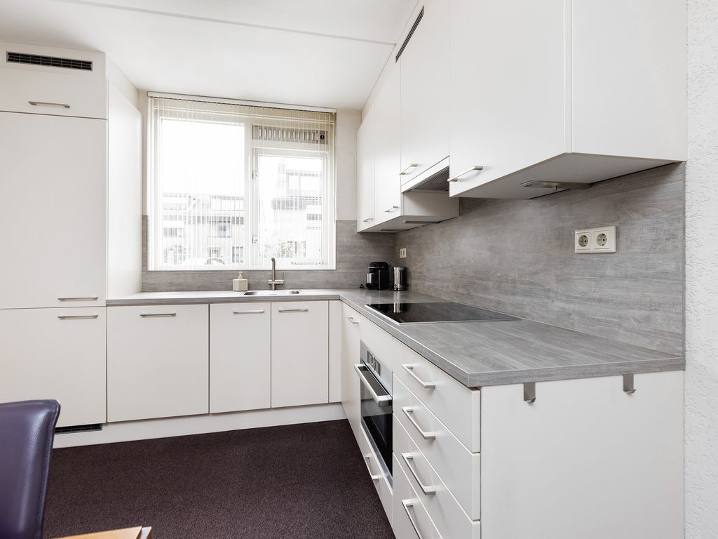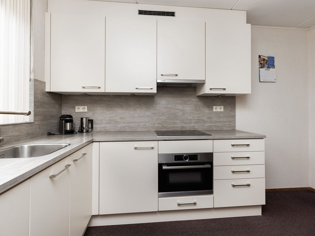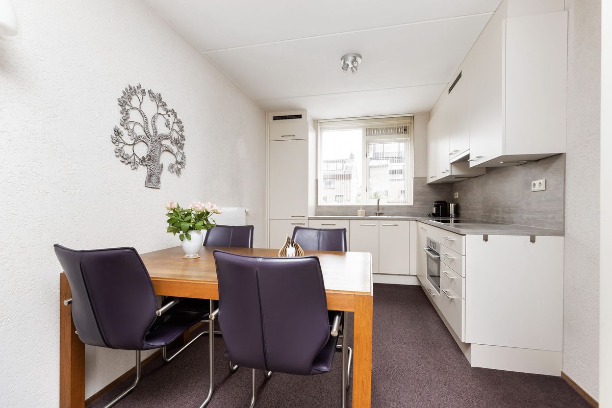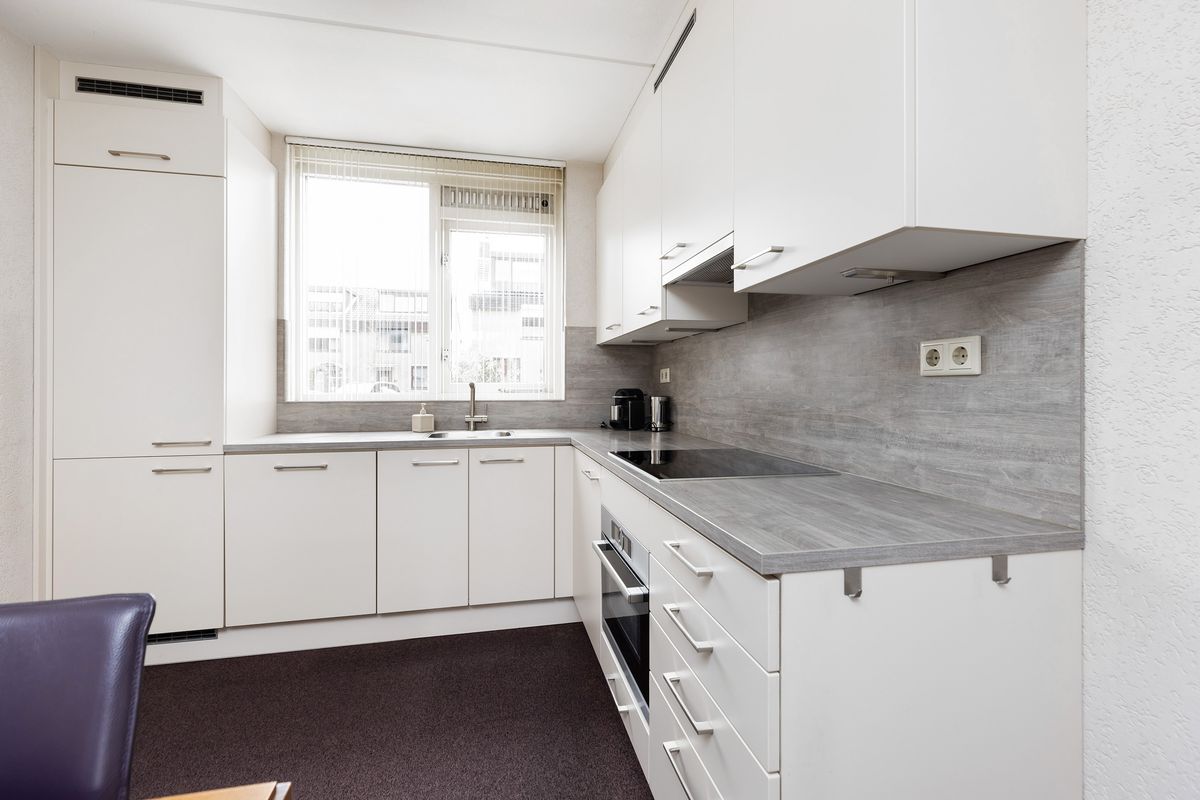 De nette open keuken heeft een afmeting van ca 2,71 x 3,64 m, is gelegen aan de voorzijde en uitgevoerd in een L-opstelling voorzien van diverse inbouwapparatuur: inductie kookplaat, combi-oven/magnetron, vlakscherm afzuigkap, koelkast met vriezer en vaatwasser.