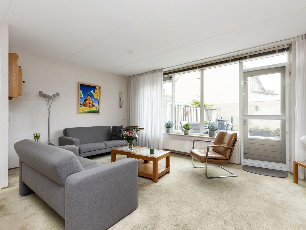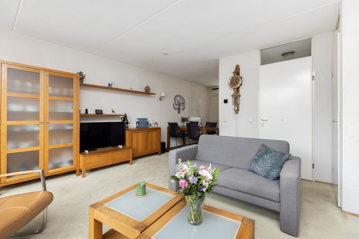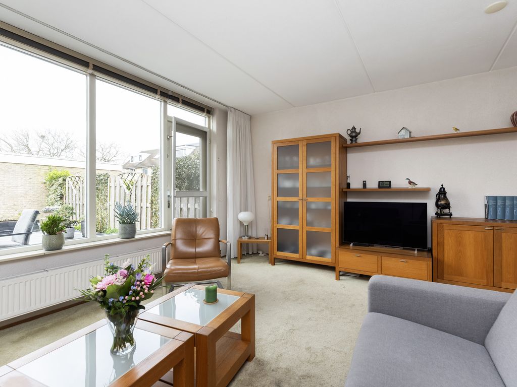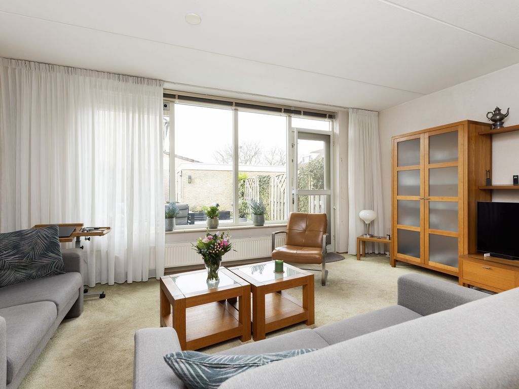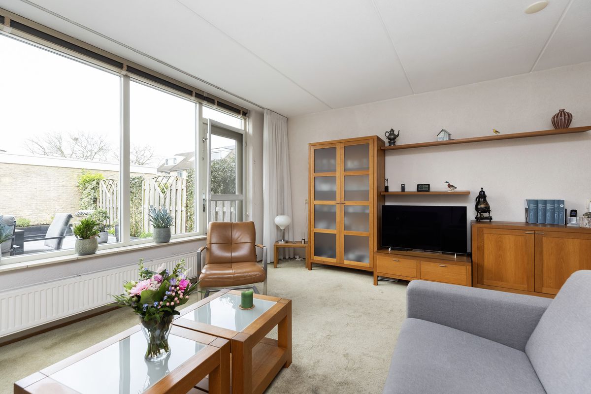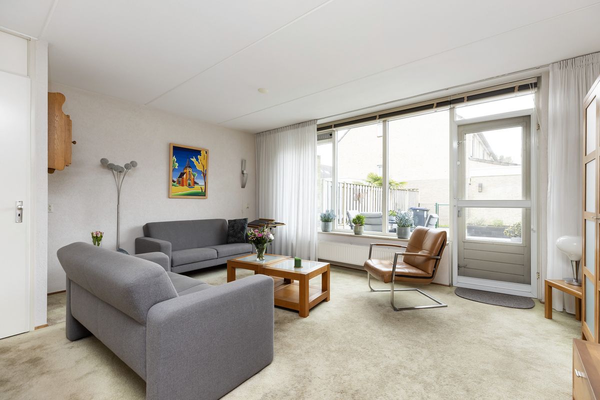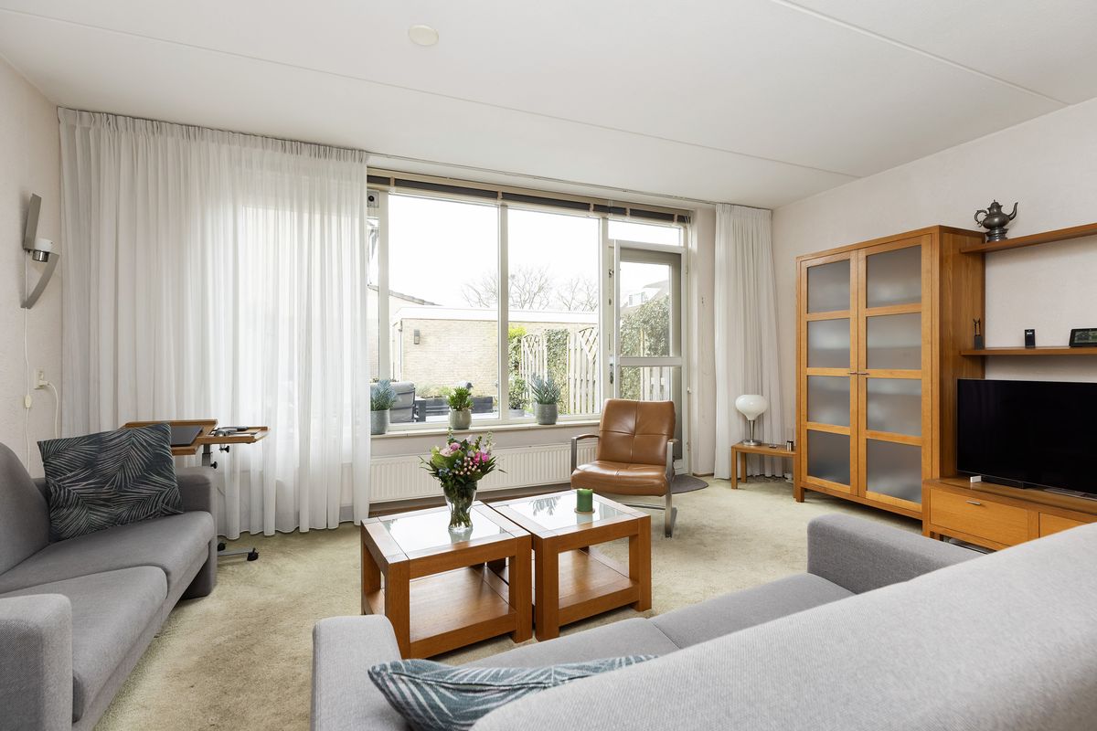 De tuingerichte woonkamer heeft een afmeting van ca. 5,14 x 4,39 m en is voorzien van een provisiekast en toegang tot de achtertuin.