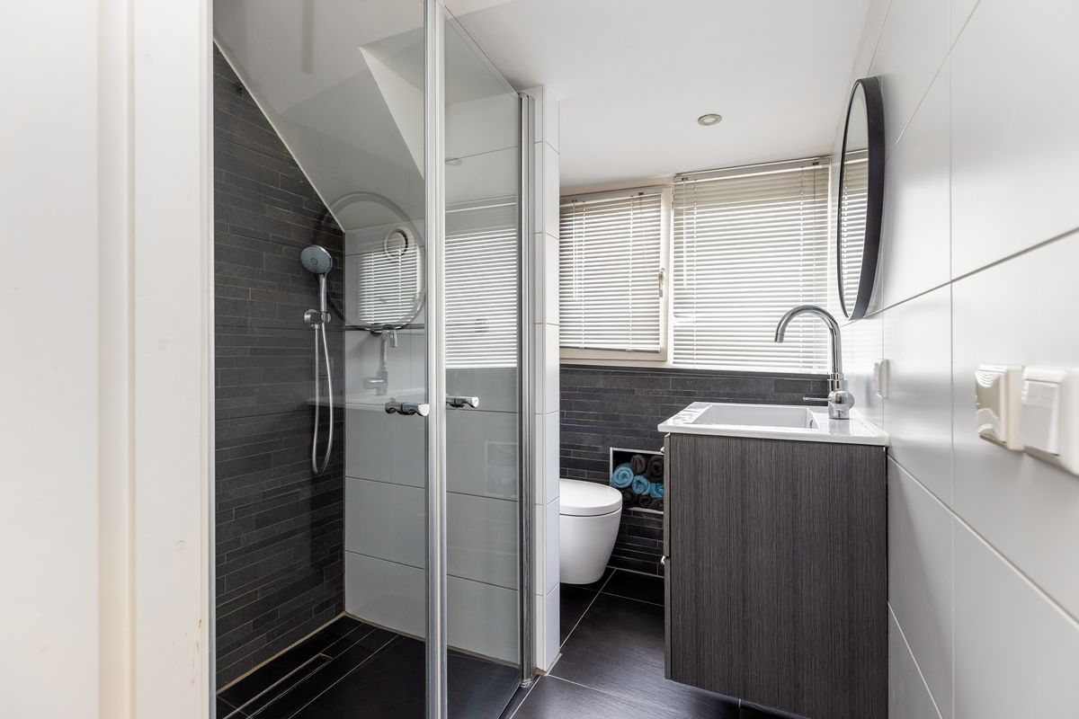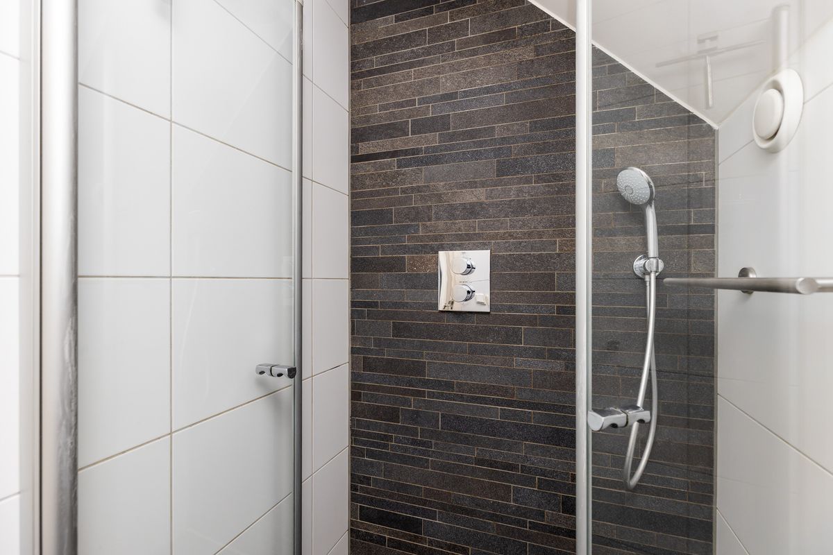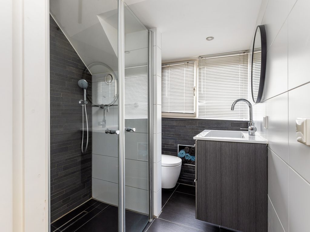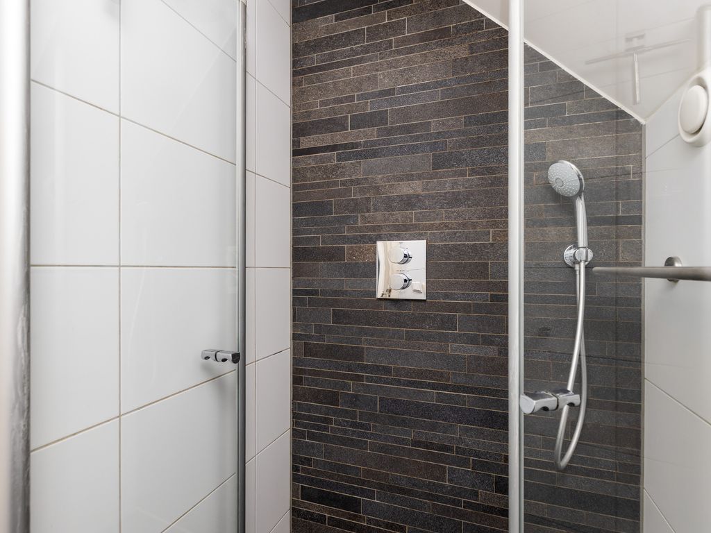 De moderne badkamer (circa 1,96 x 1,82 m) is keurig betegeld en uitgerust met een douche, toilet en wastafel.