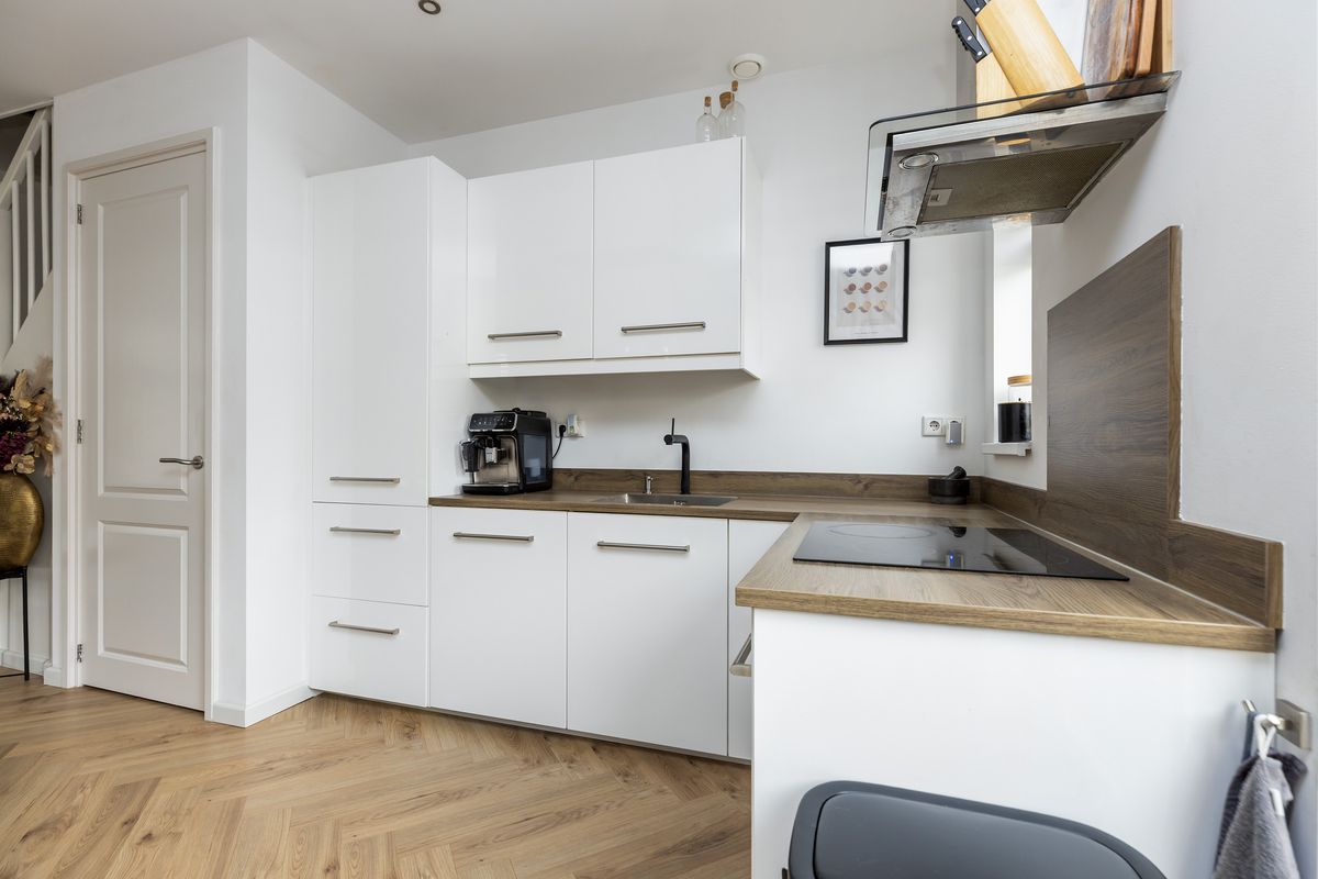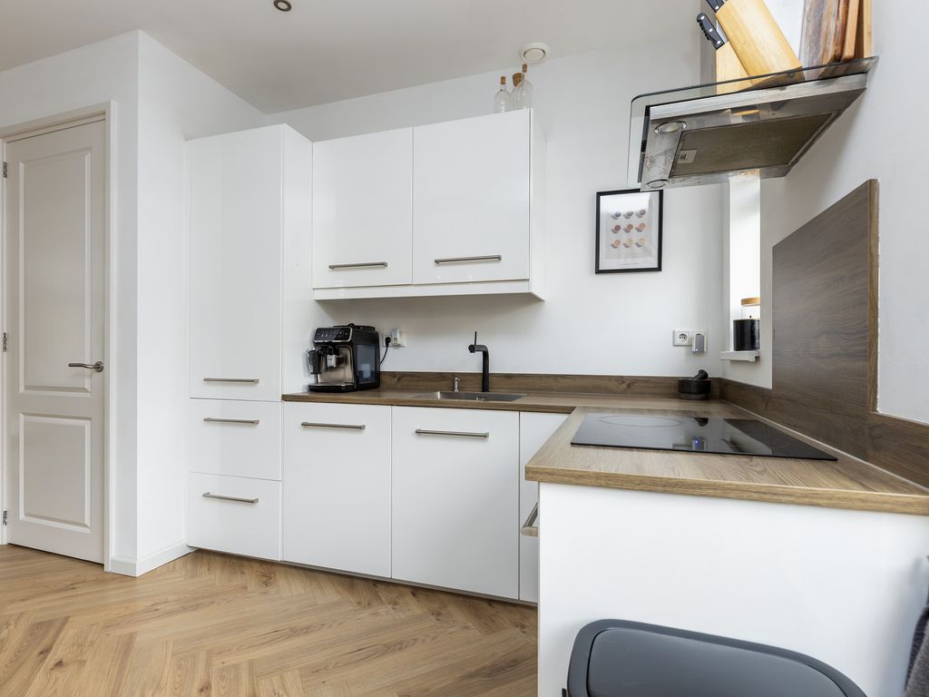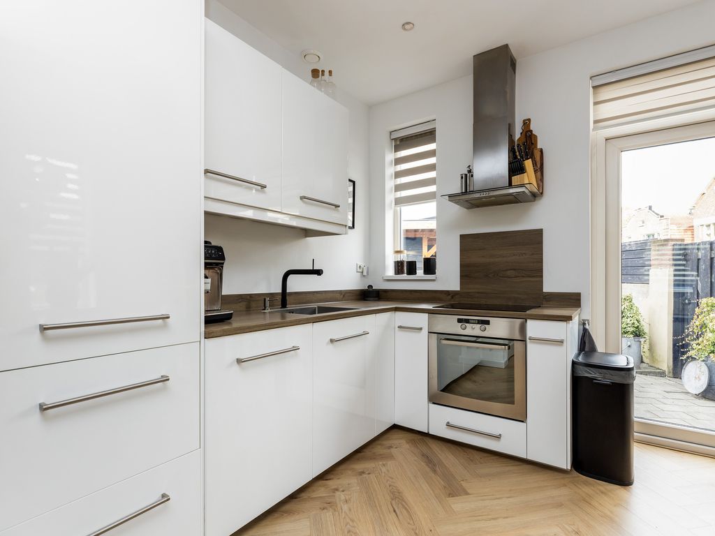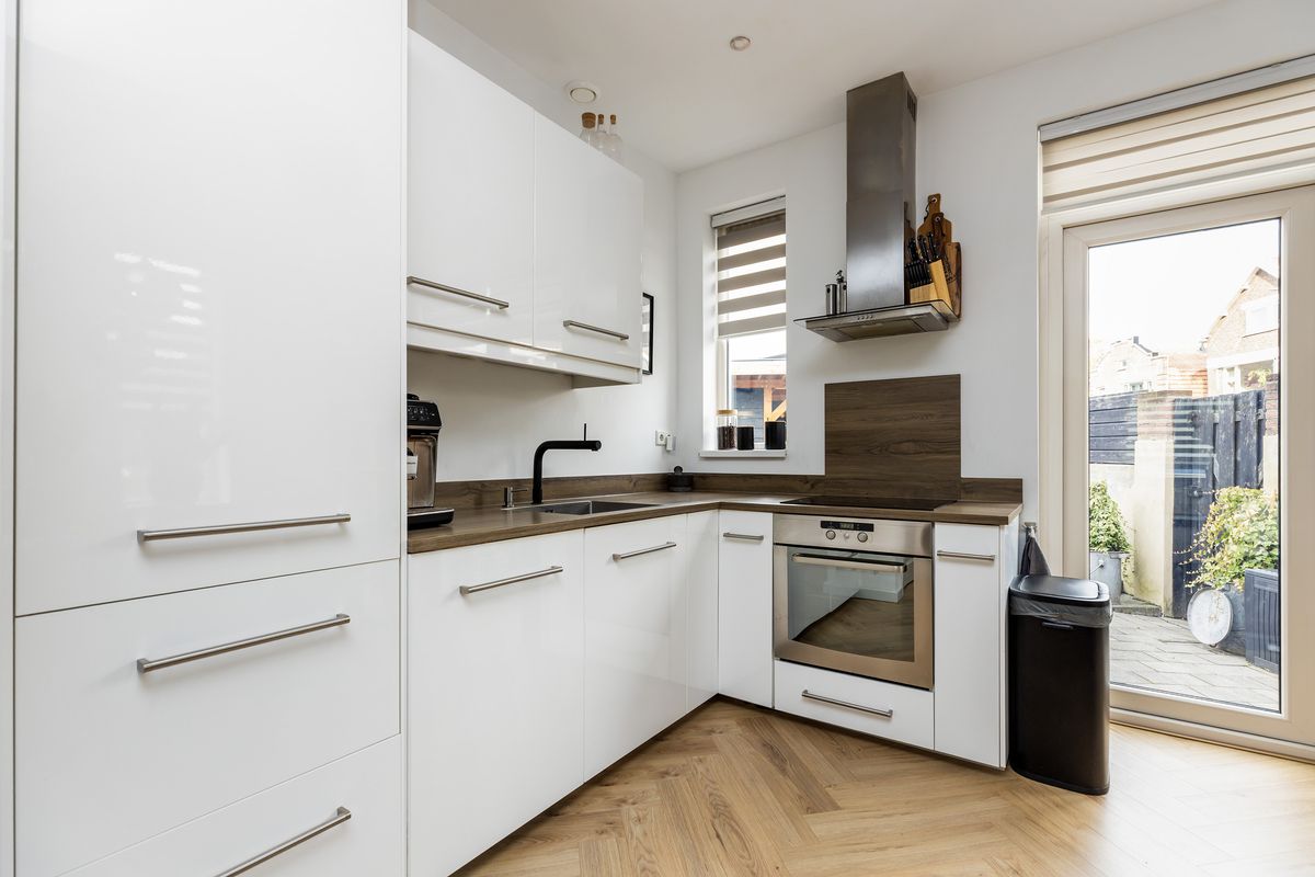 De moderne, in hoekopstelling geplaatste keuken is voorzien van diverse inbouwapparatuur en heeft een lichte uitstraling. Vanuit de keuken is er directe toegang tot de tuin.