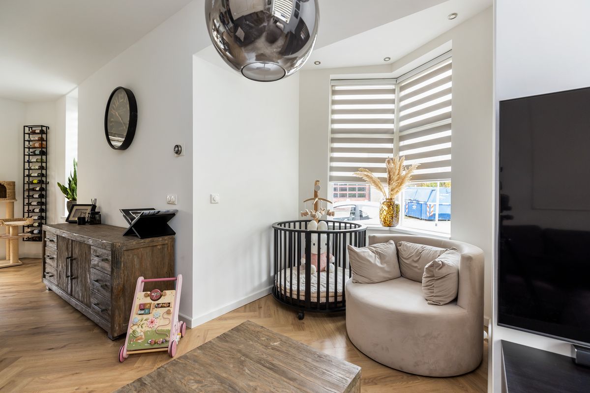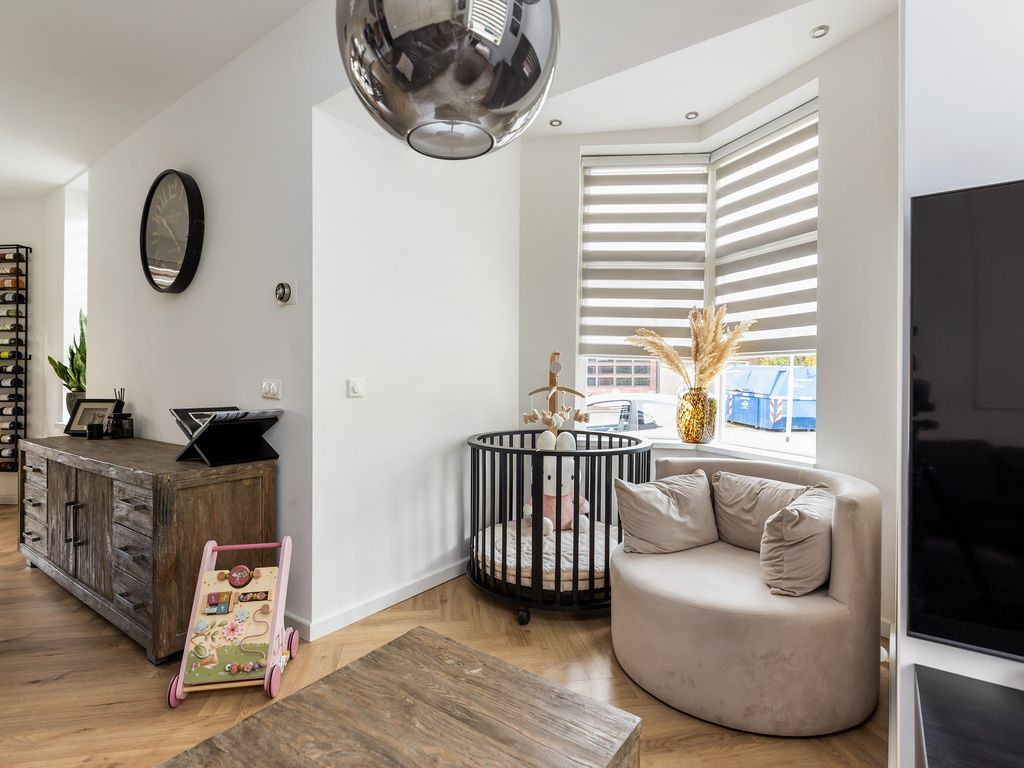 De woonkamer heeft een oppervlakte van circa 34 m² (inclusief open keuken) en is licht en speels dankzij de karakteristieke zijerker.