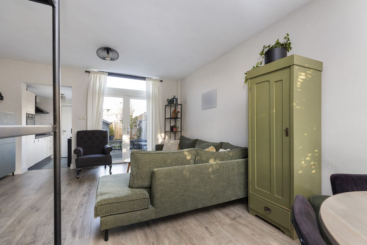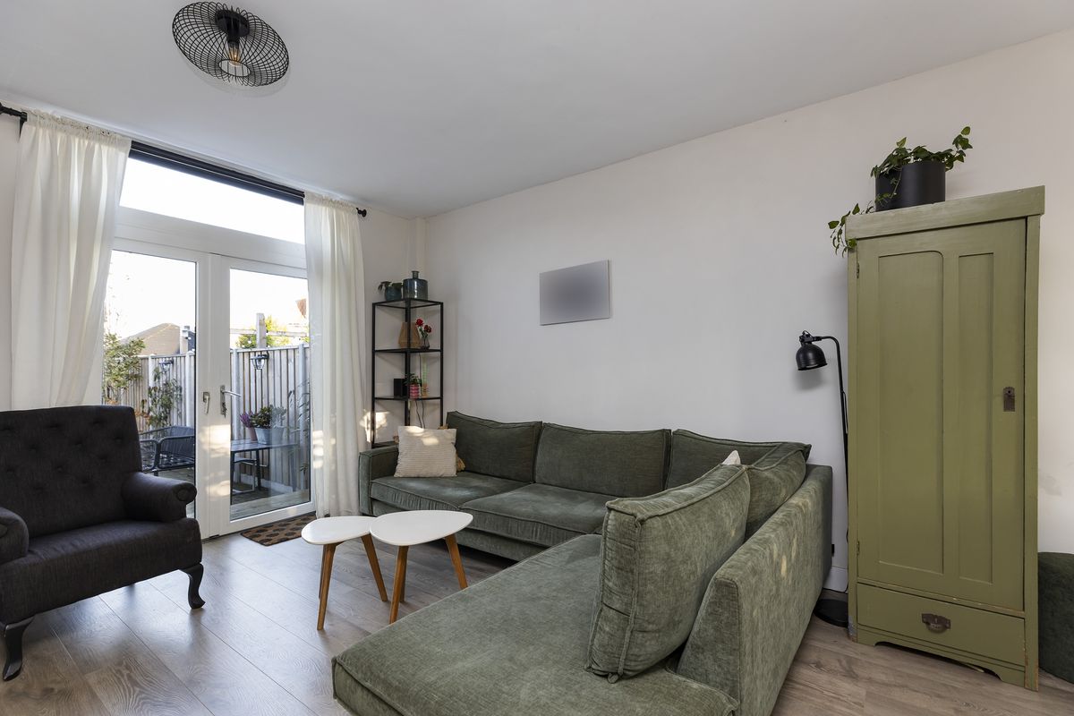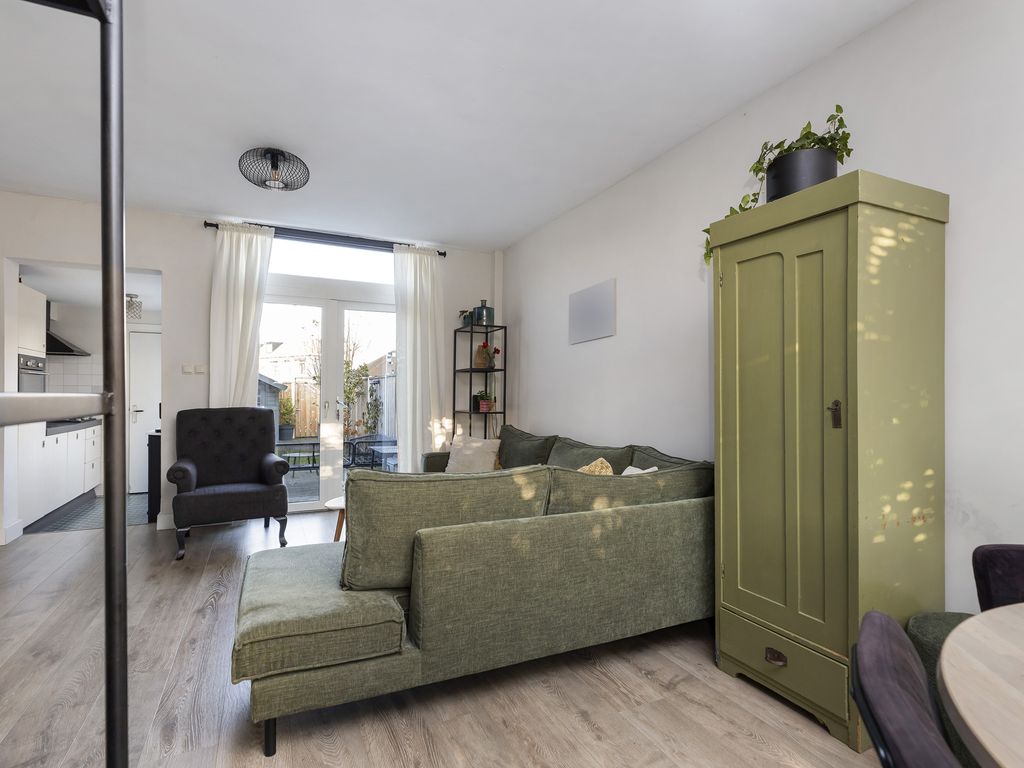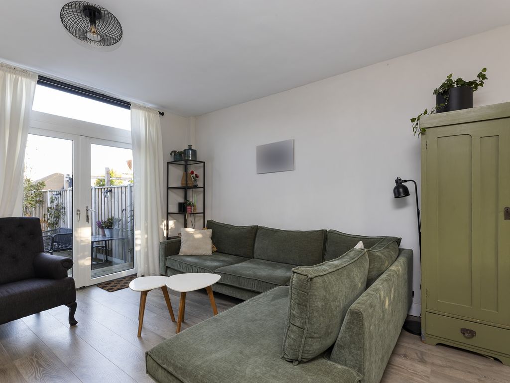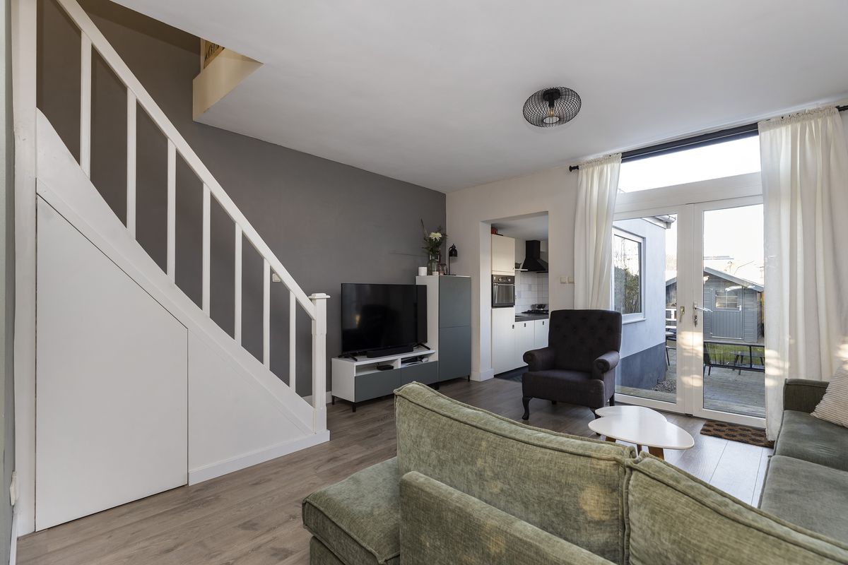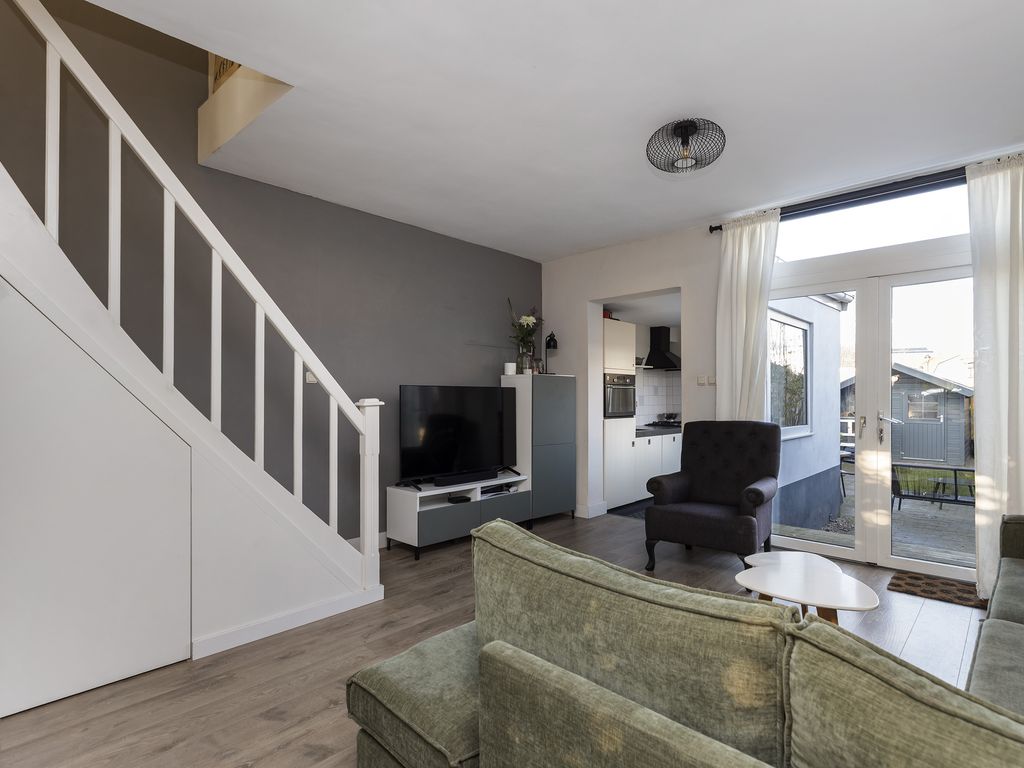De woning beschikt o.a. over een gezellige woonkamer met openslaande deuren naar de achtertuin, een aangebouwde keuken met vloerverwarming, een bijkeuken/wasruimte en een diepe zonnige achtertuin met houten berging en achterom. Op de verdieping bevinden zich 2 slaapkamers en de badkamer.