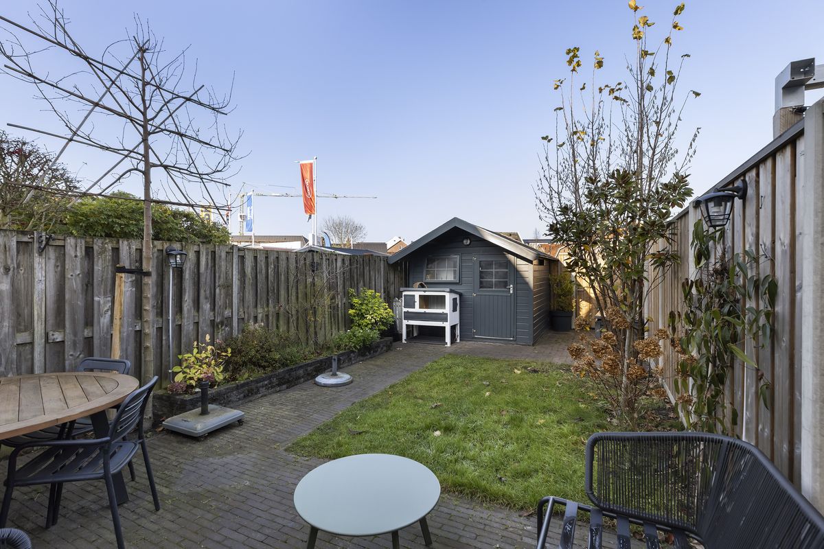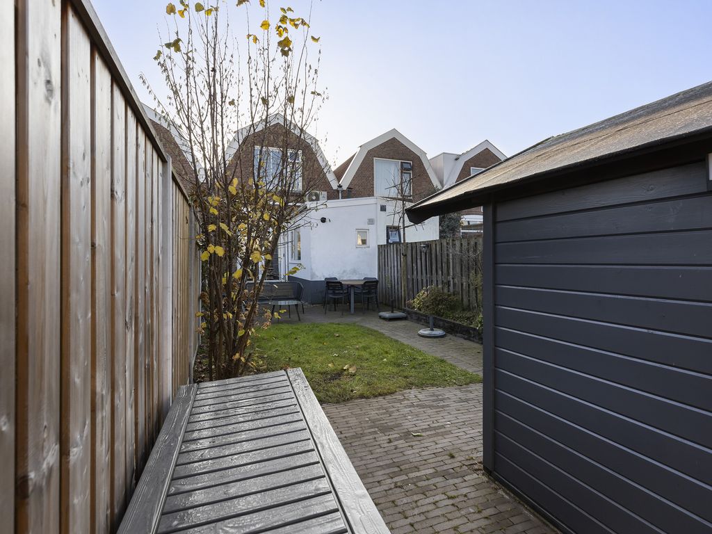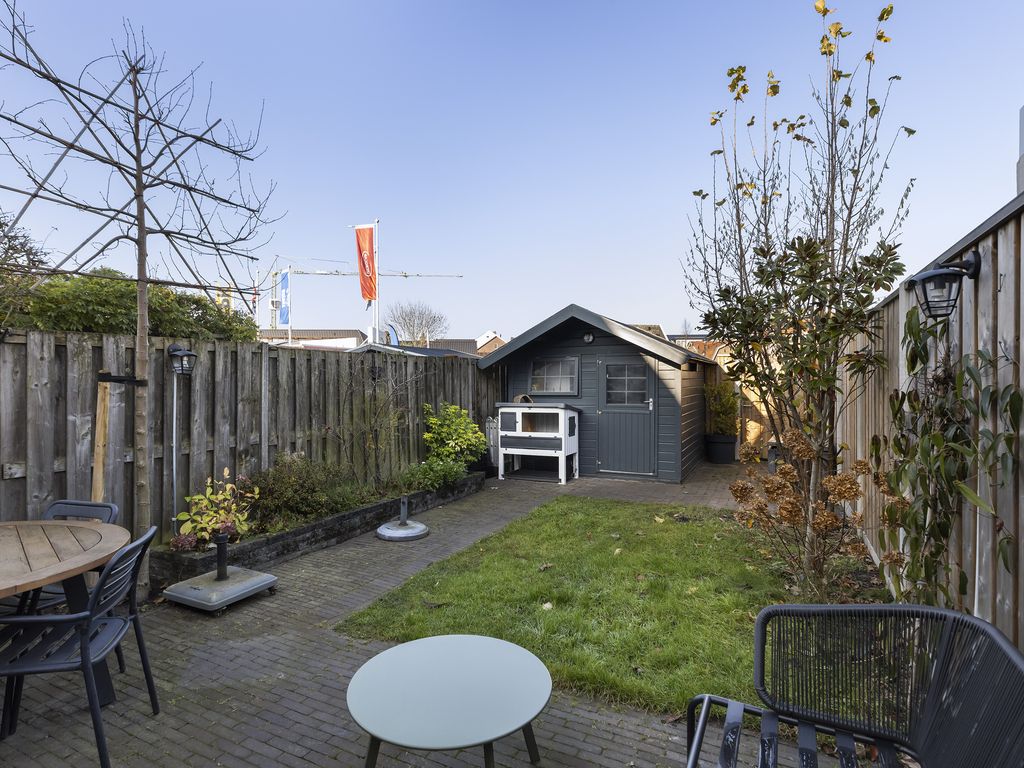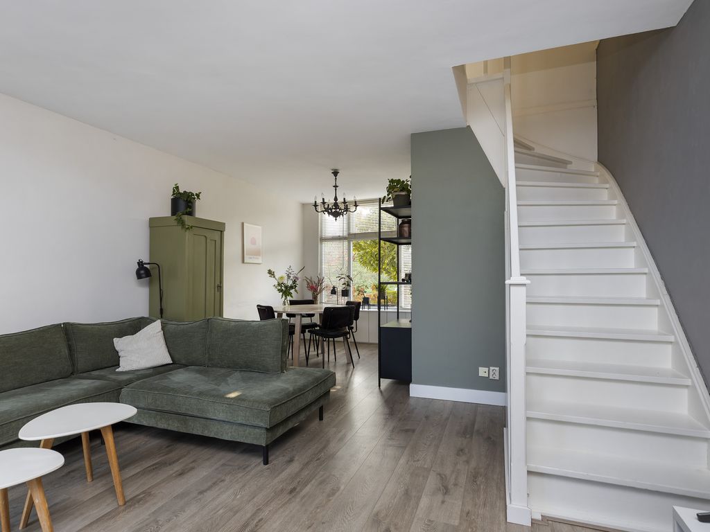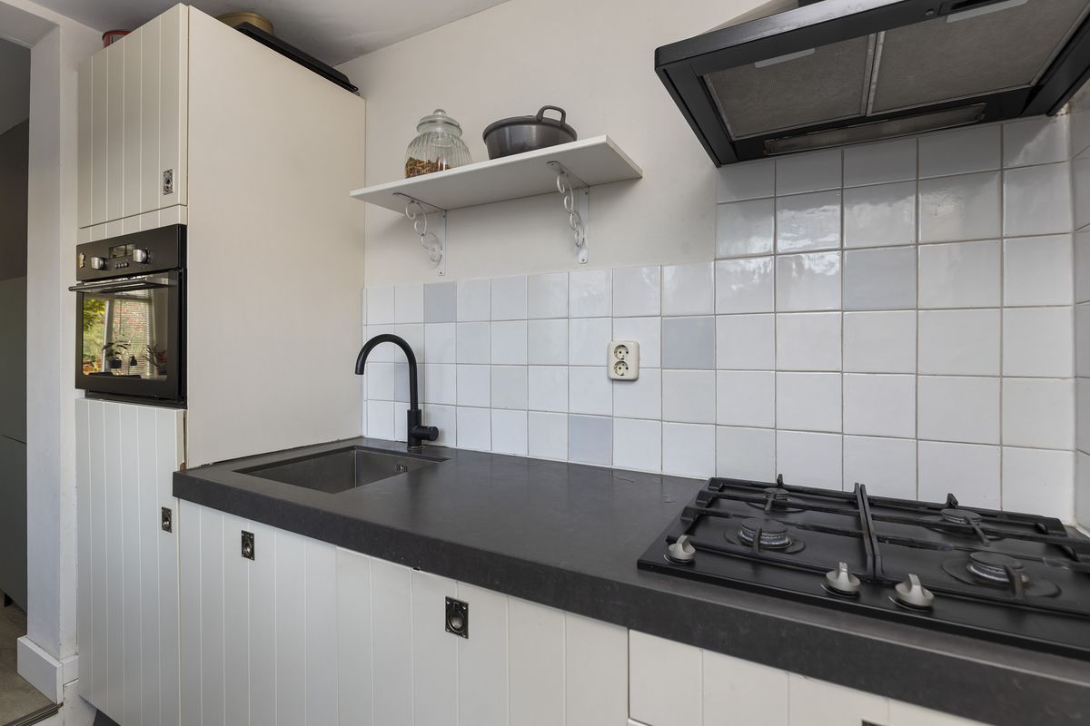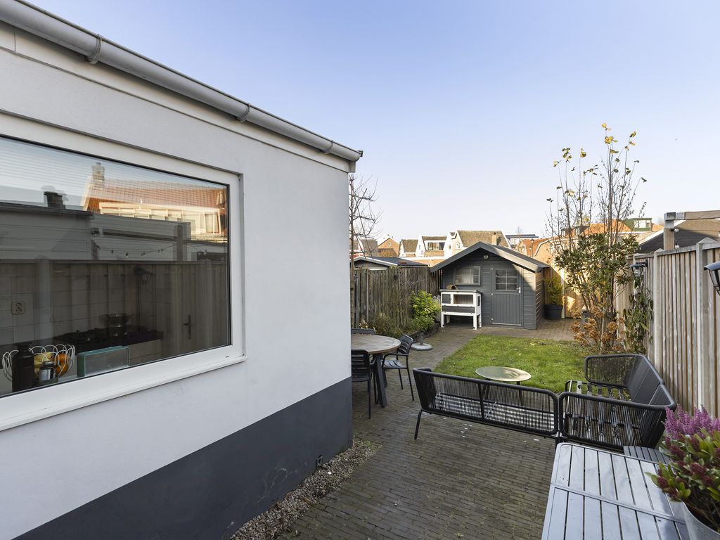 De woning beschikt o.a. over een gezellige woonkamer met openslaande deuren naar de achtertuin, een aangebouwde keuken met vloerverwarming, een bijkeuken/wasruimte en een diepe zonnige achtertuin met houten berging en achterom. Op de verdieping bevinden zich 2 slaapkamers en de badkamer.