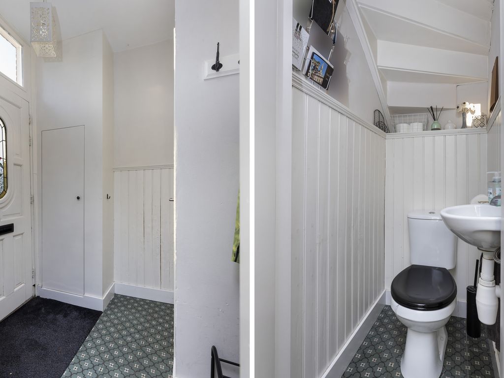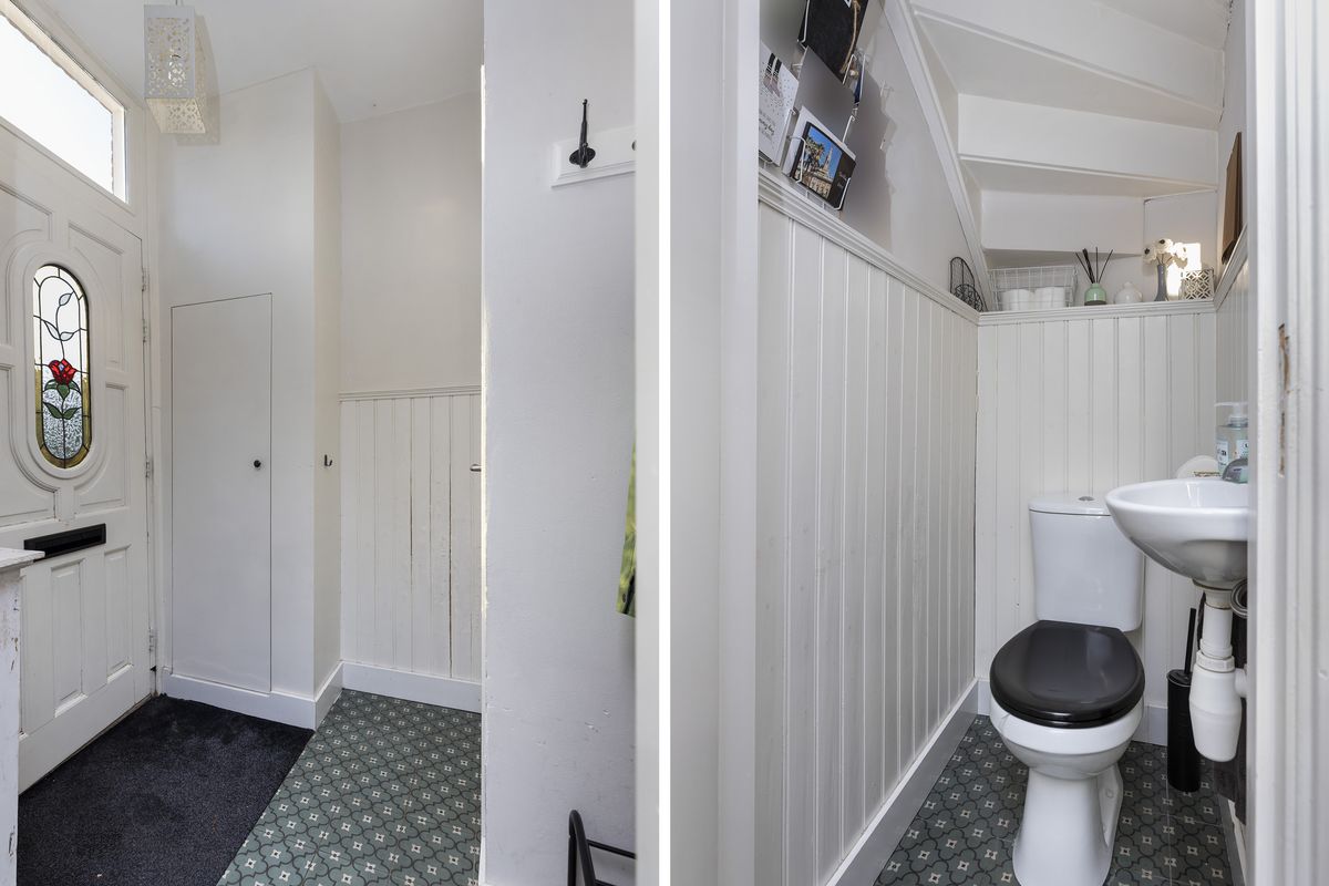 Entree/hal met in 2025 vernieuwde gemoderniseerde meterkast (6 groepen + aardlekschakelaar) en een keurige toiletruimte vv fonteintje.