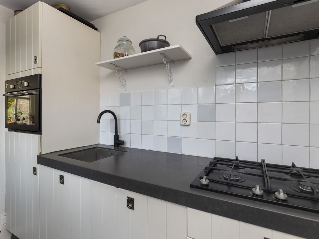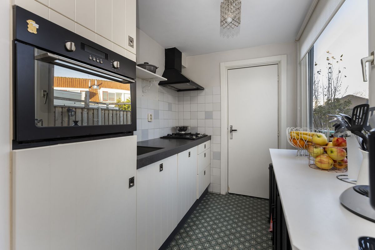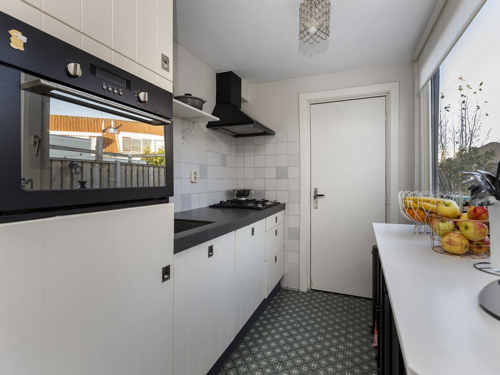 De keuken bevindt zicht in de uitbouw (ca. 2,49 x 1,83 m) en beschikt over een wand opgesteld keukenblok in lichte kleurstelling met o.a. gaskookplaat, afzuigkap, koelkast, oven en vaatwasser.
