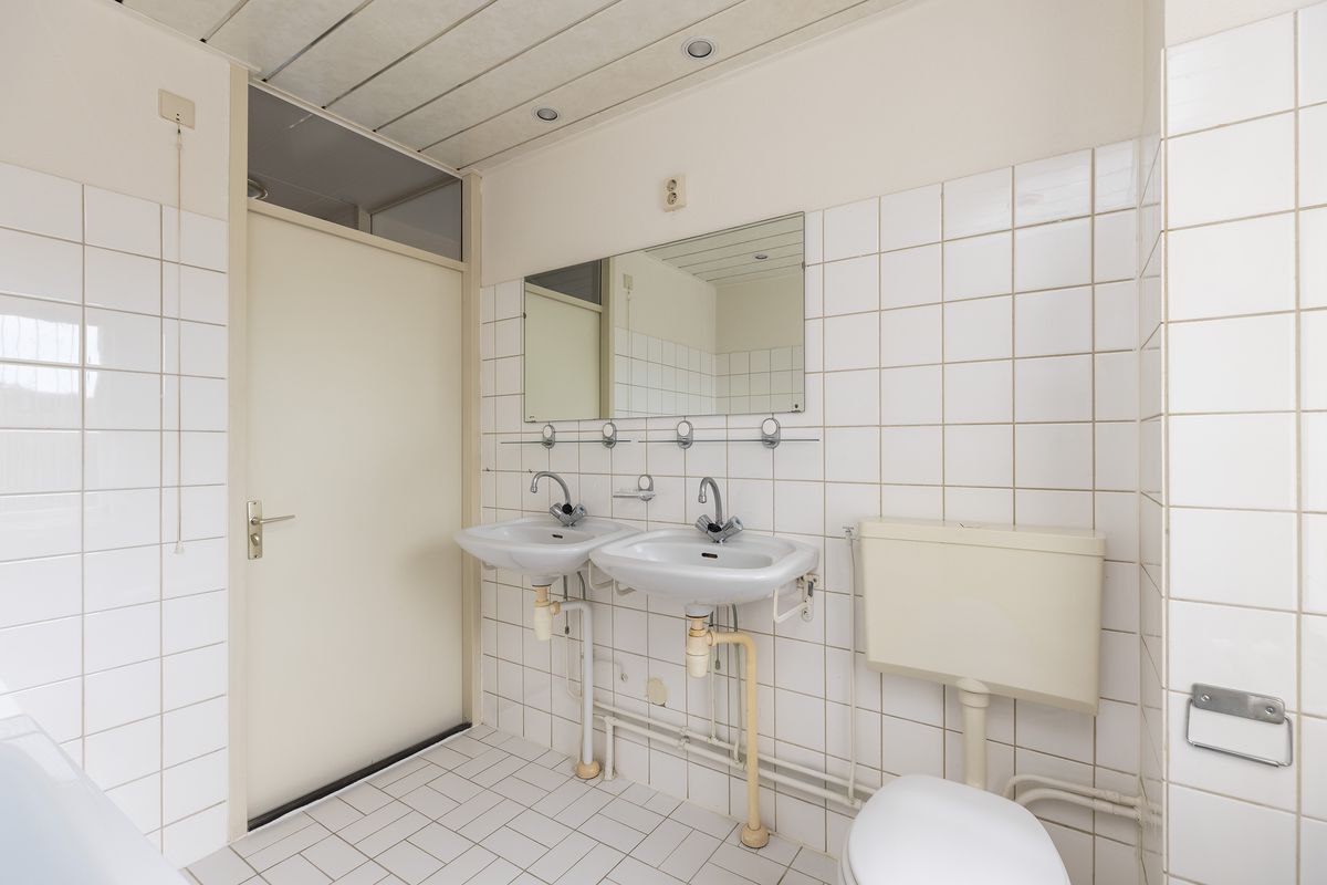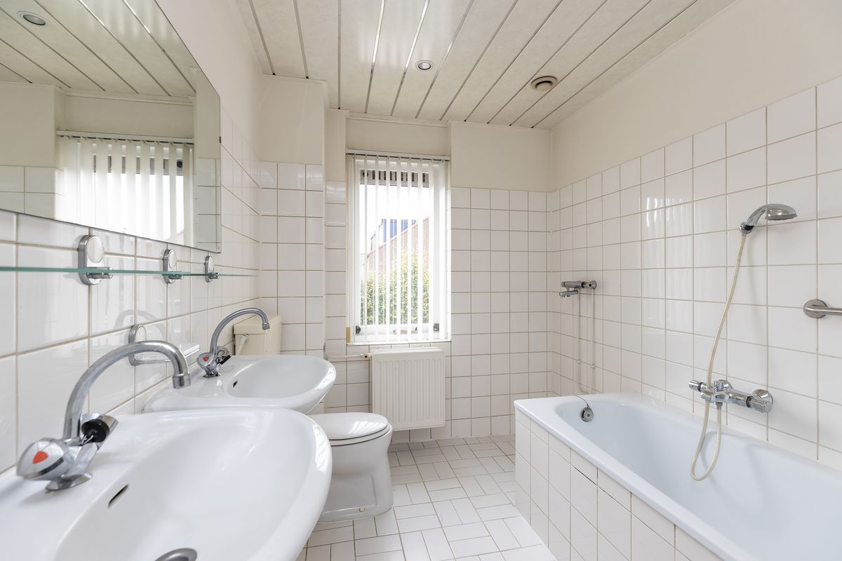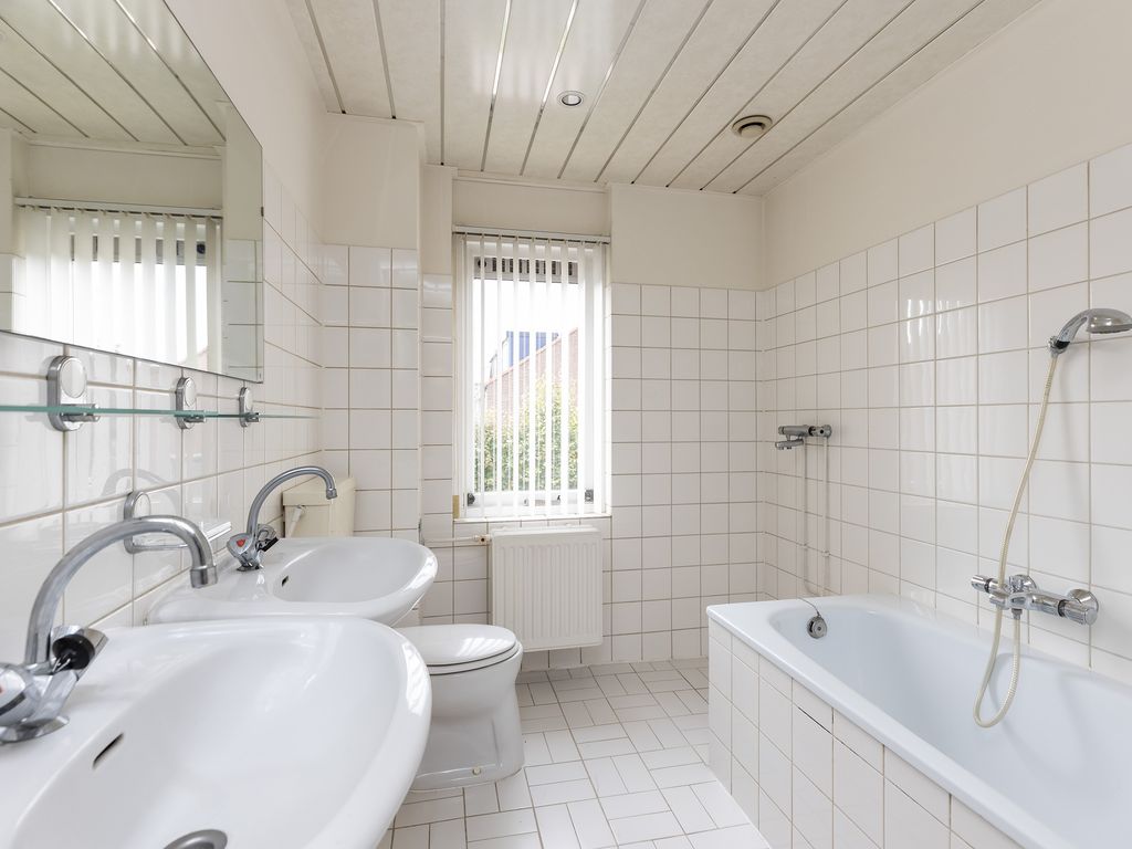 De badkamer (ca. 2,54 x 2,04 m) is ingericht met een ligbad, douche, toilet en dubbele wastafel.