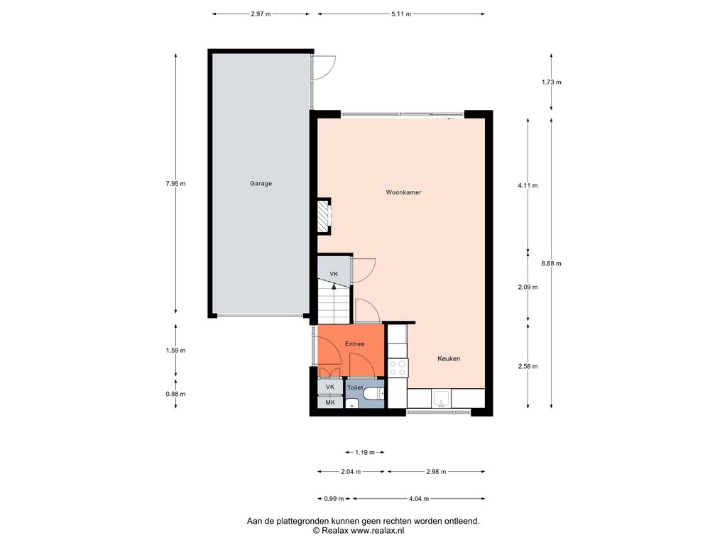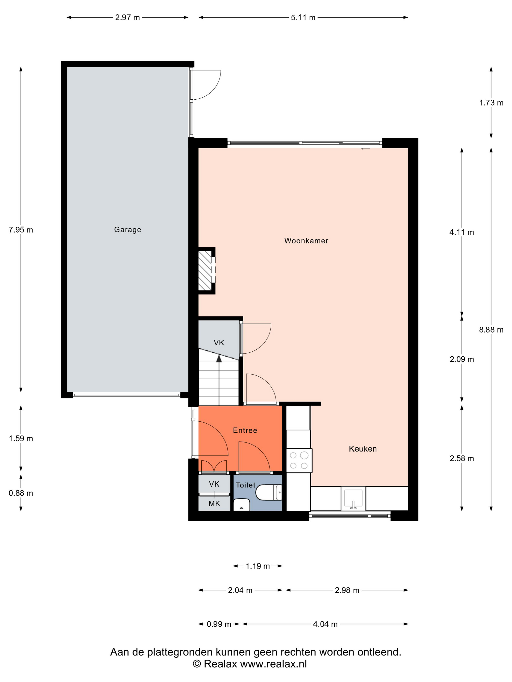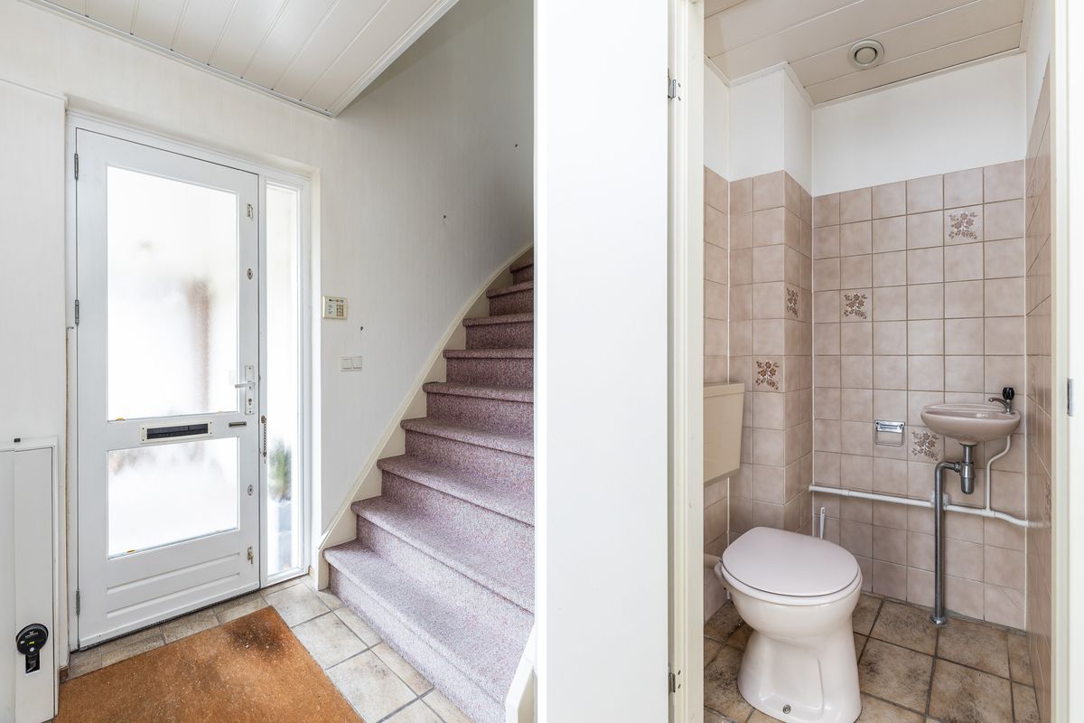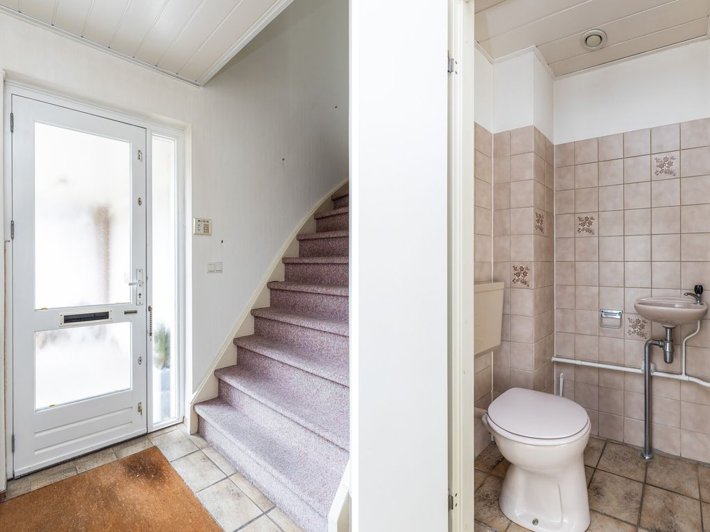 Via de entree kom je in de hal met trapopgang naar de eerste verdieping, de meterkast en een toiletruimte. Vanuit de hal heb je toegang tot de woonkamer.