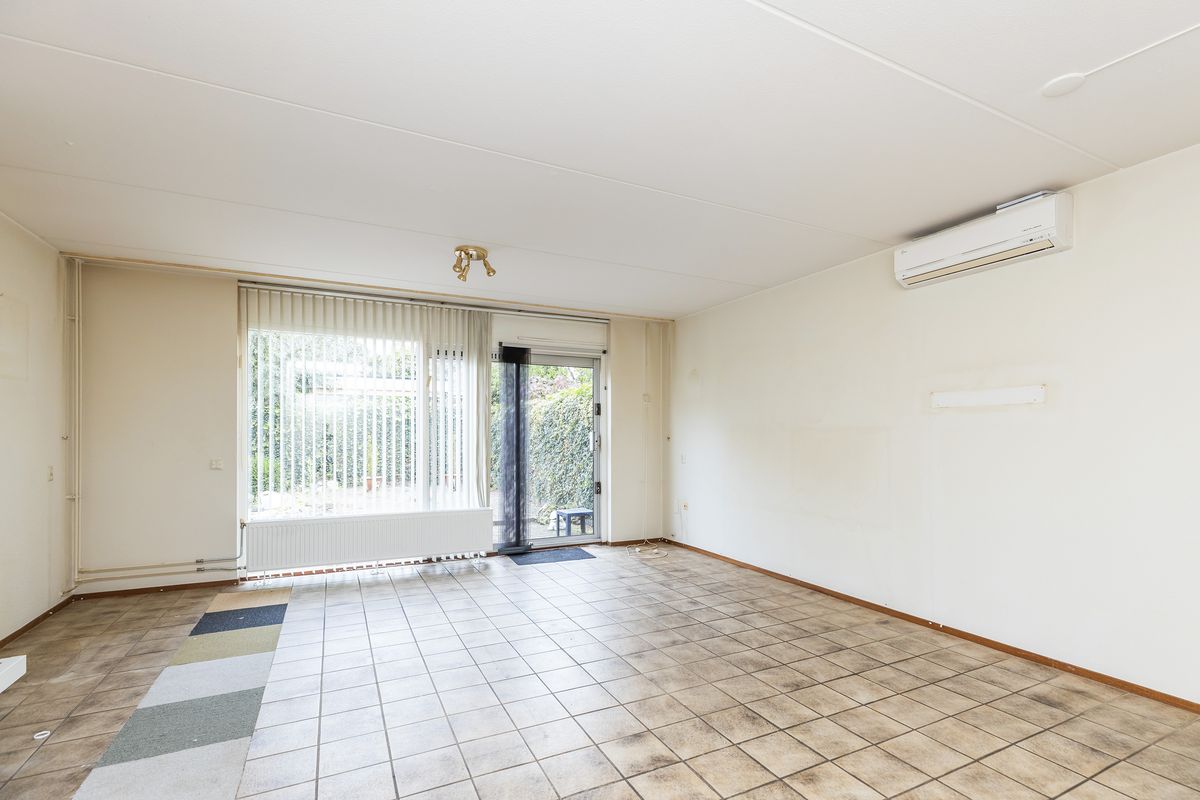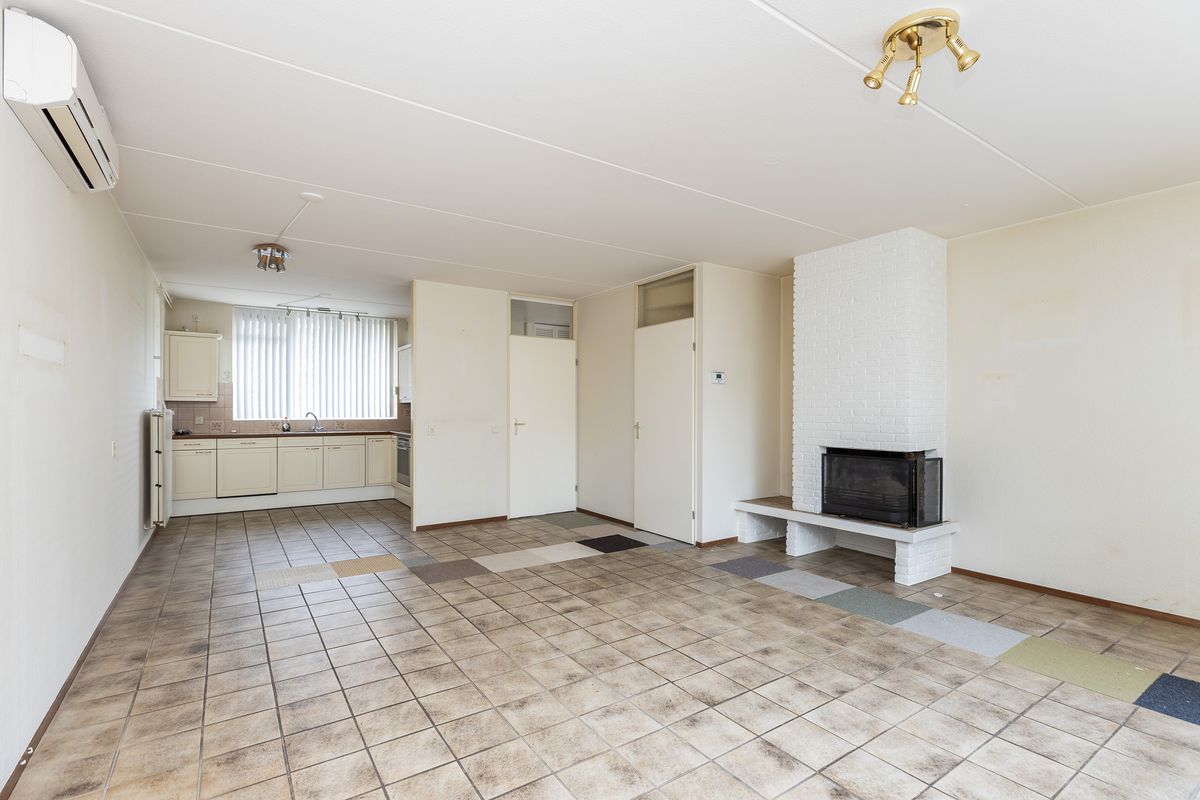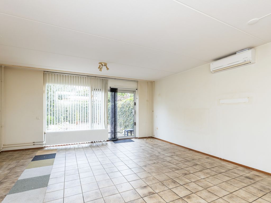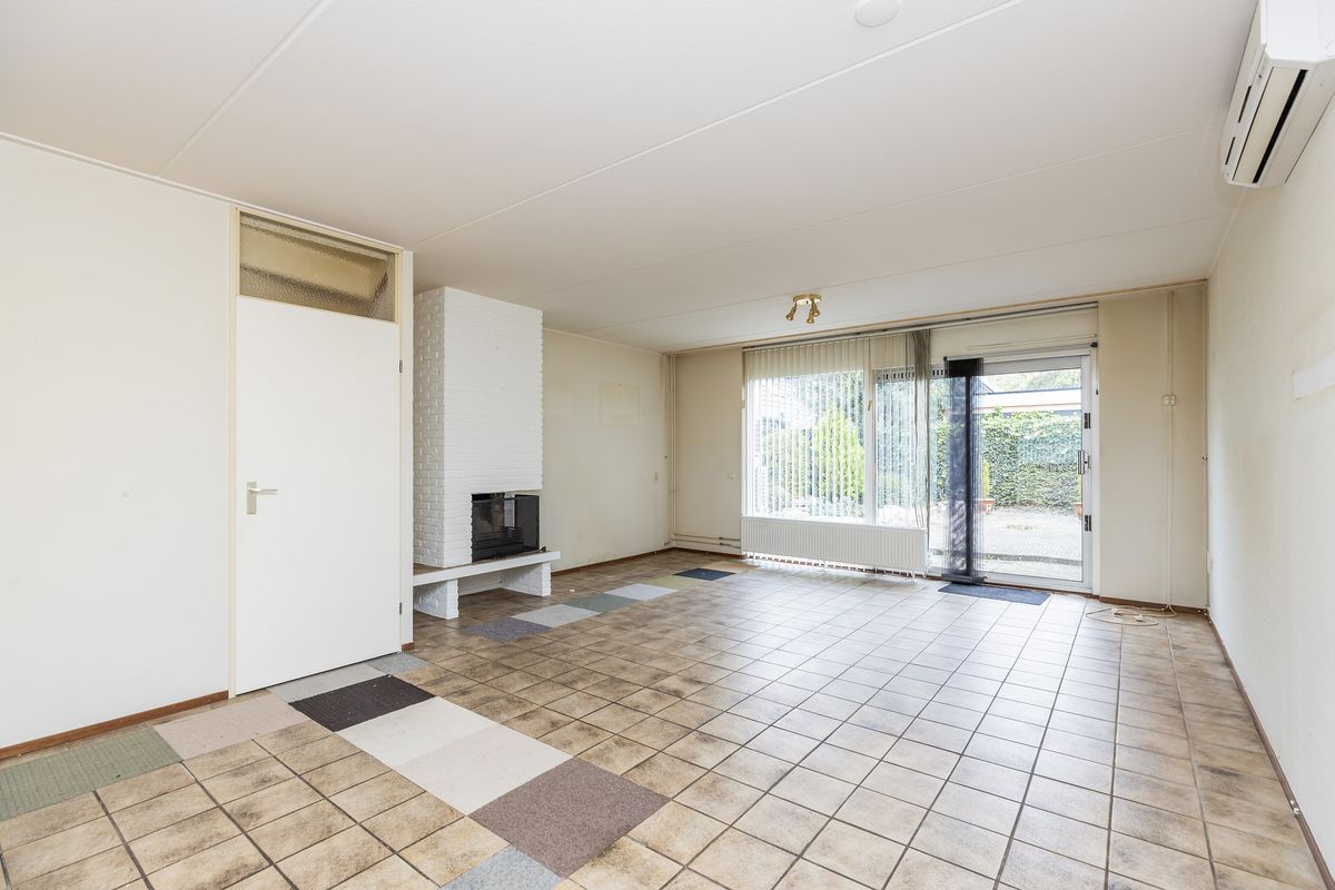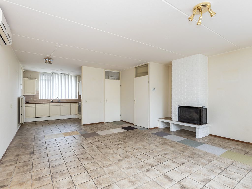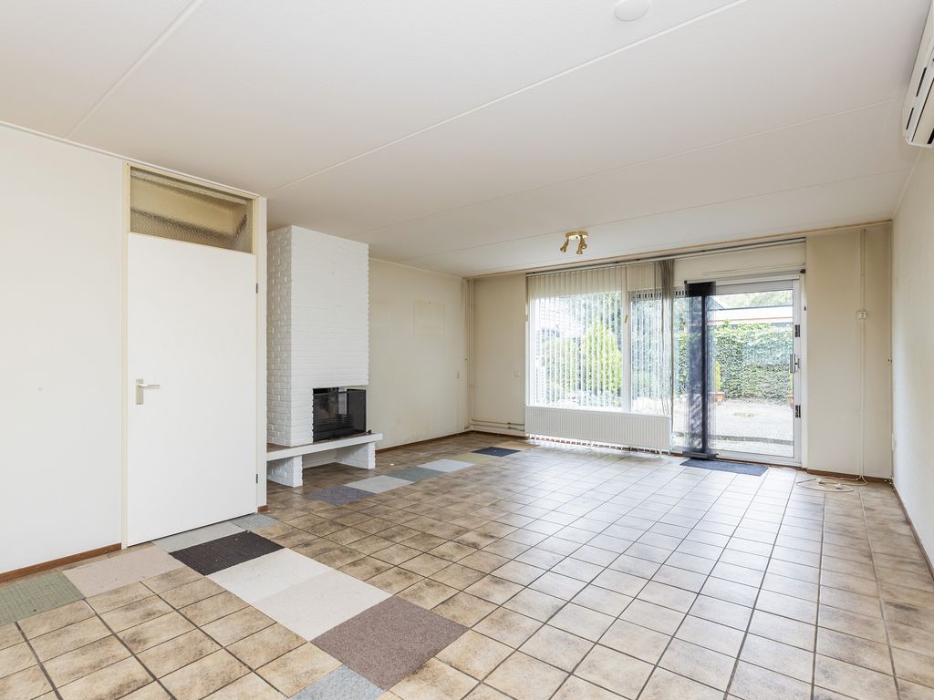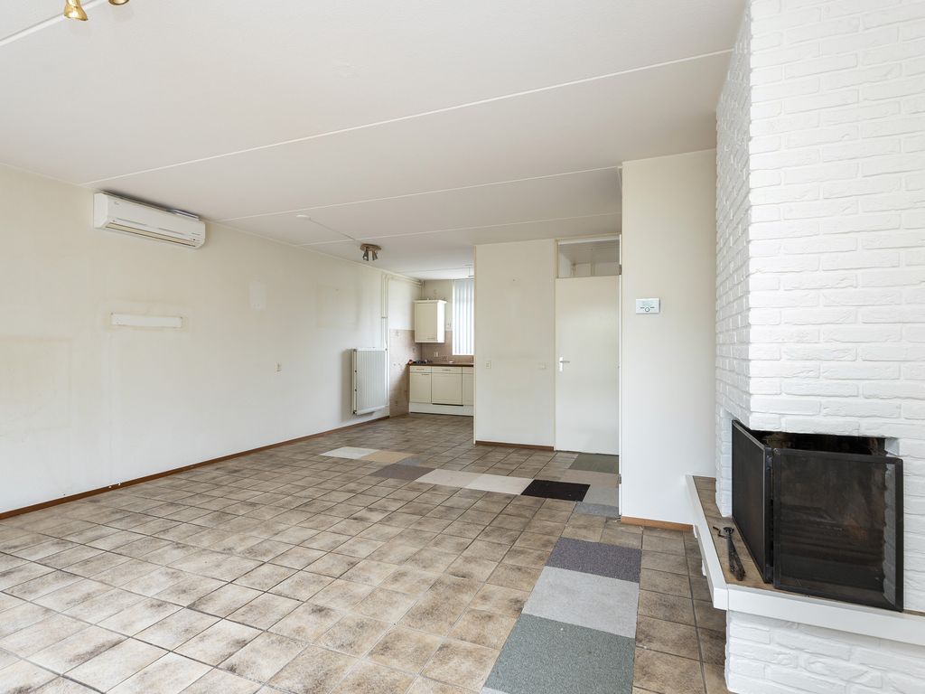 De woonkamer (ca. 30 m²) is voorzien van een plavuizenvloer, een open haard, airco en een schuifpui naar de tuin. Onder de trap is een provisiekast gesitueerd.