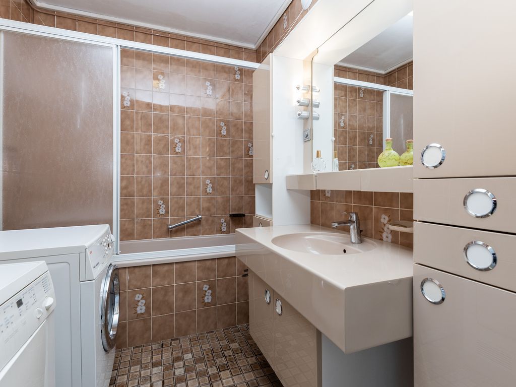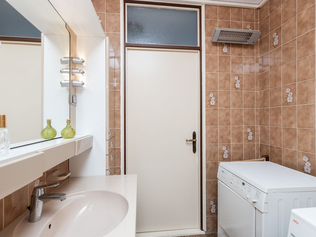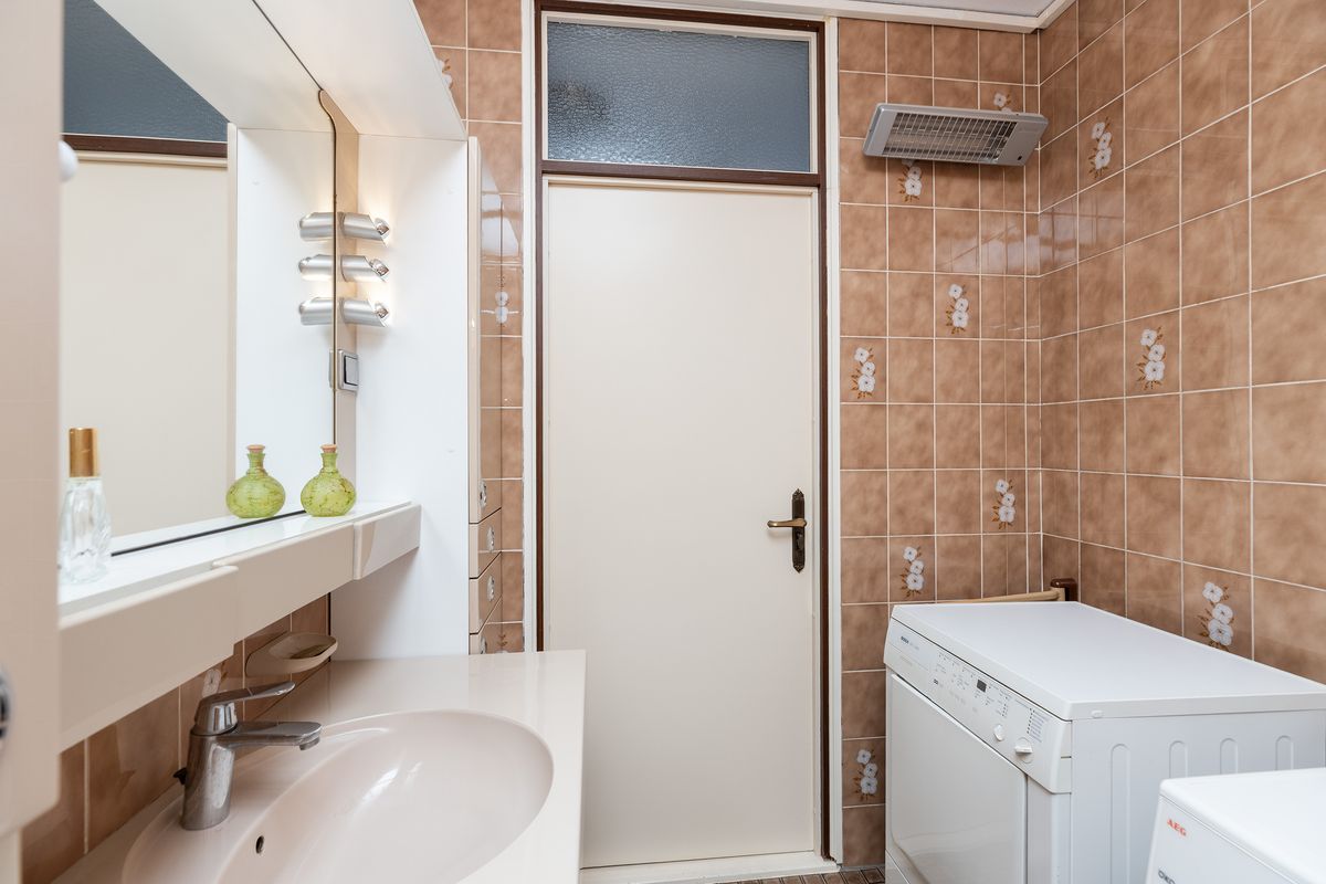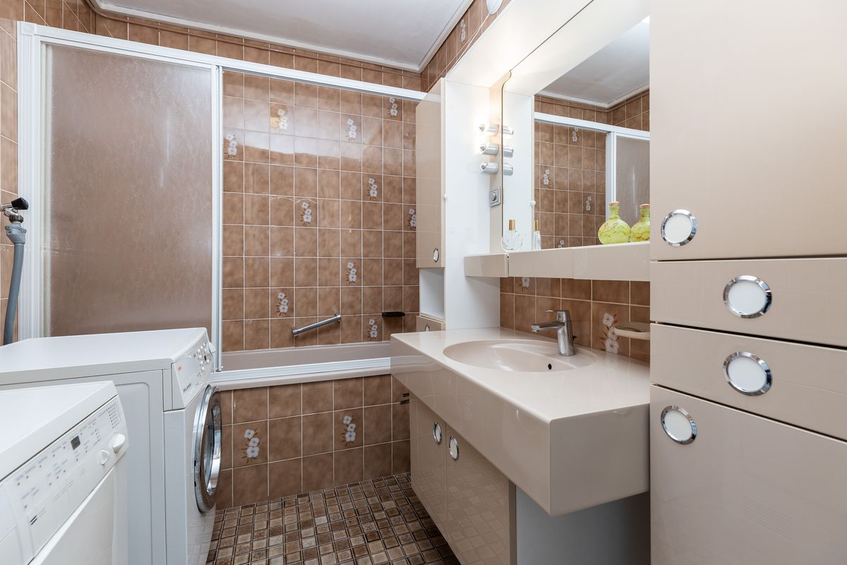 De badkamer is tot het plafond betegeld en uitgerust met een ligbad, badkamermeubel met wastafel en een aansluiting voor de wasmachine en droger.