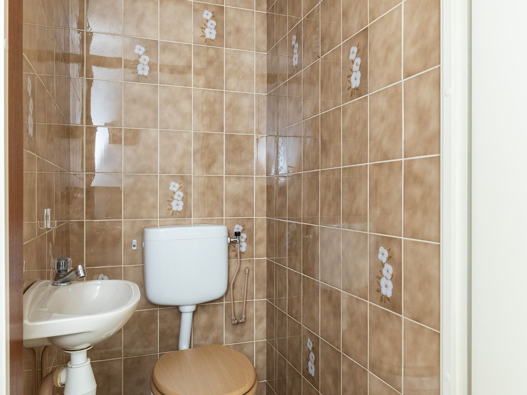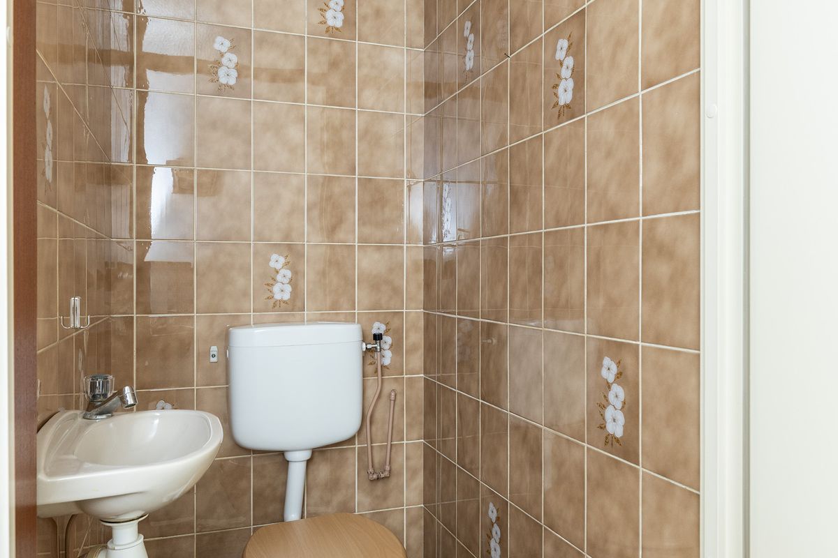 De separate toiletruimte is eveneens geheel betegeld en voorzien van een fonteintje.