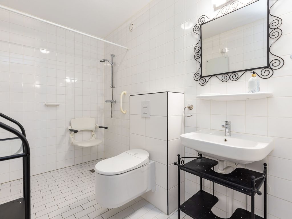 De badkamer is licht afgewerkt en voorzien van een inloopdouche, wastafel en 2e toilet.