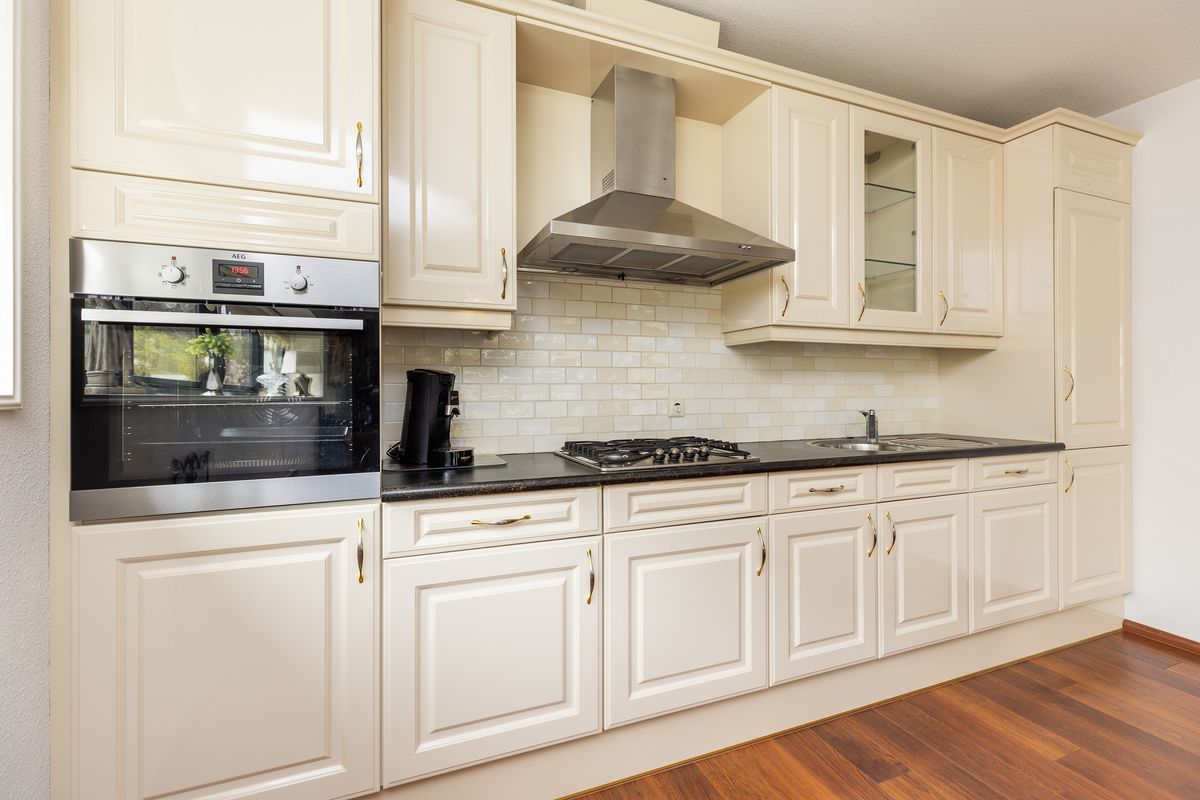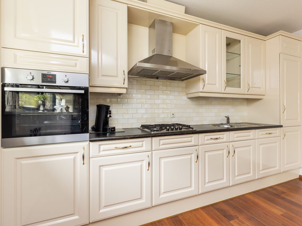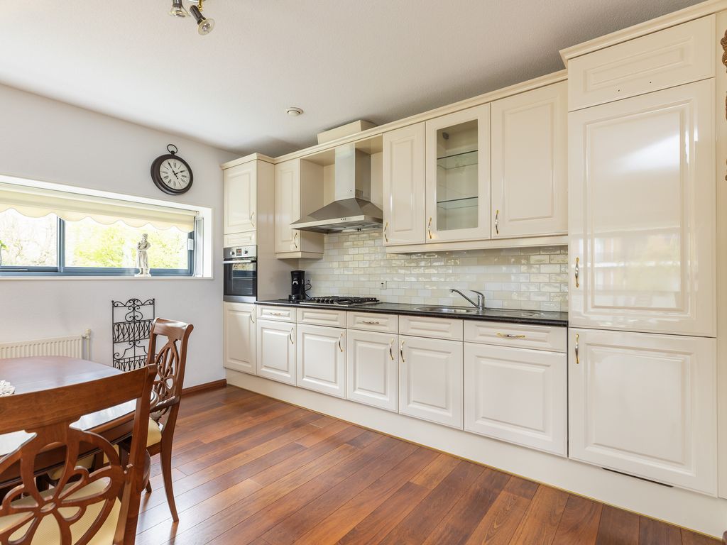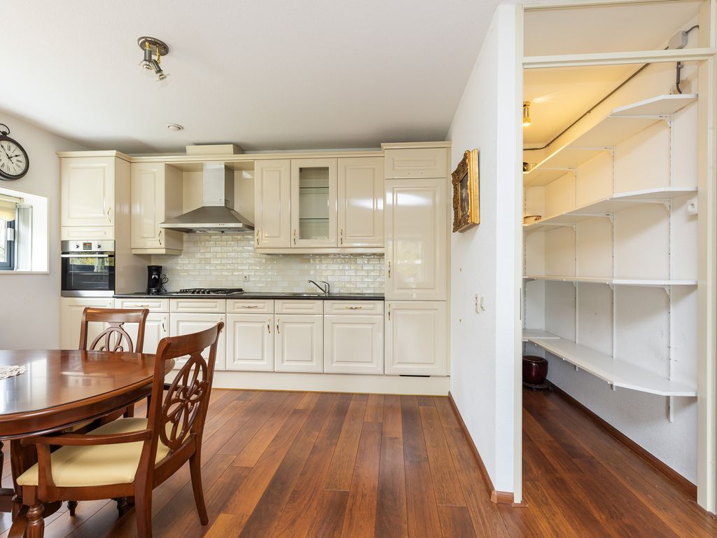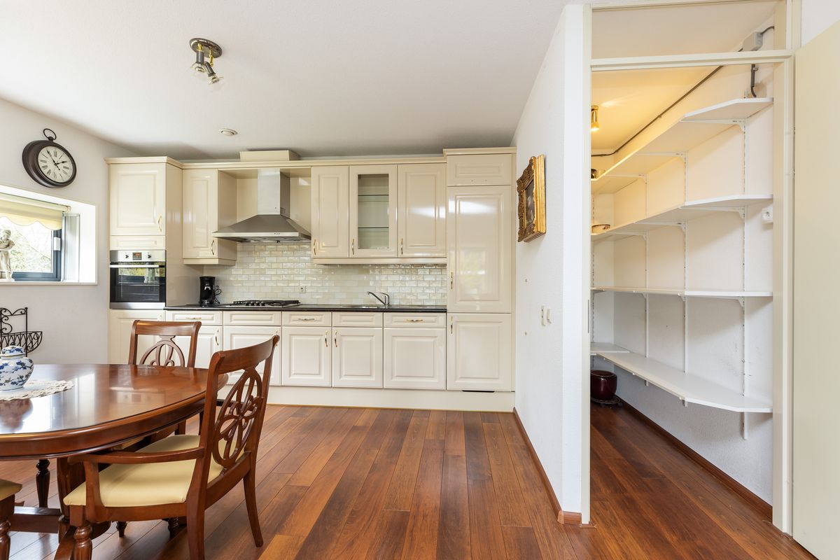 De keuken is voorzien van diverse inbouwapparatuur en een praktische voorraadkast.