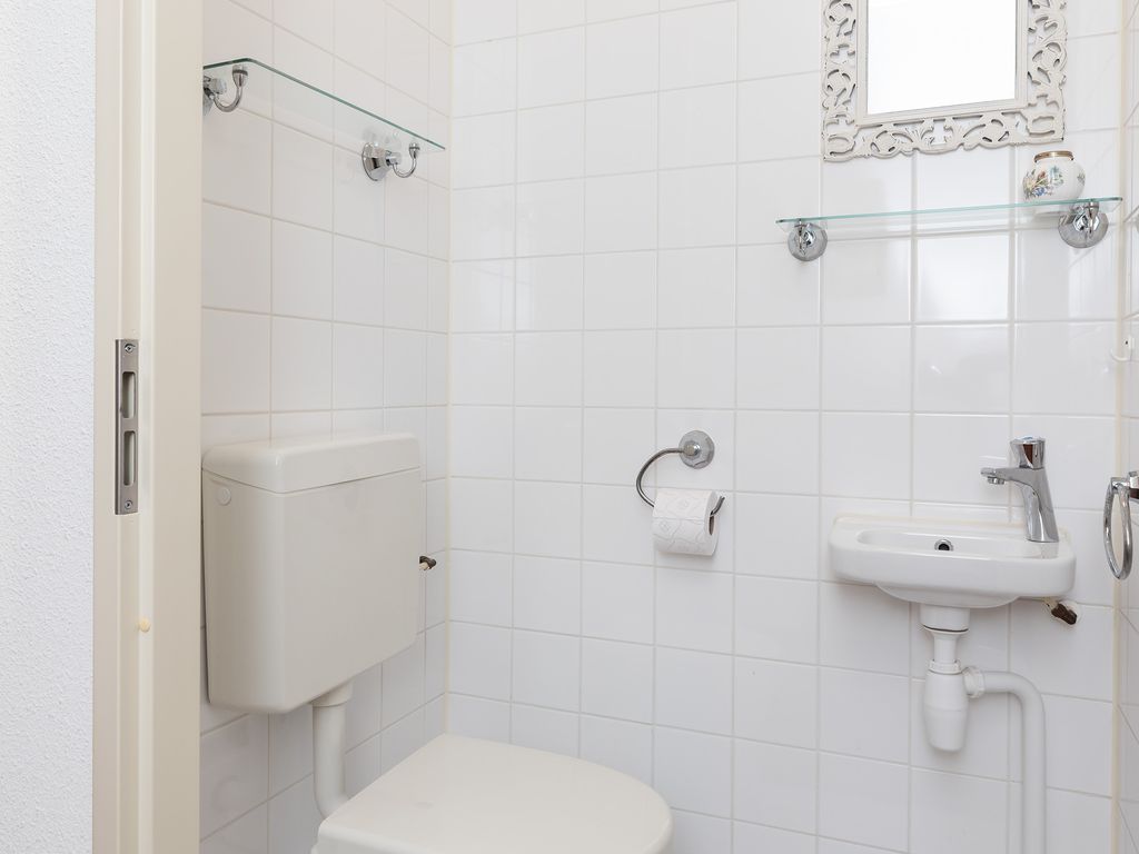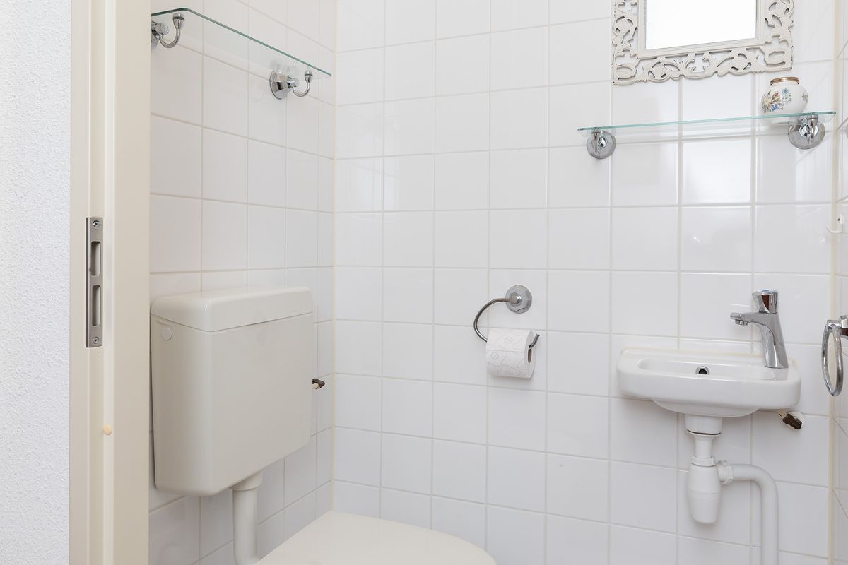 De toiletruimte is licht betegeld en uitgerust met een closet en fonteintje.