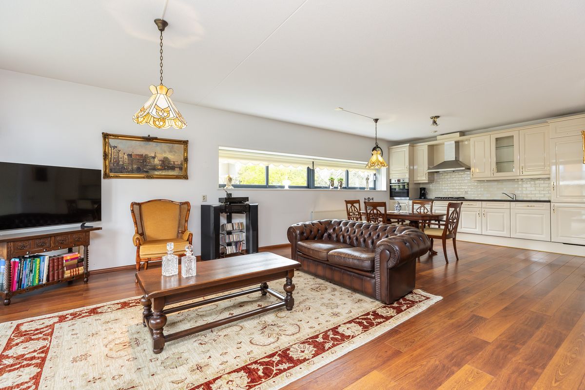 De royale en sfeervolle woonkamer met open keuken (ca. 45 m²) is dankzij de grote raampartijen heerlijk licht.